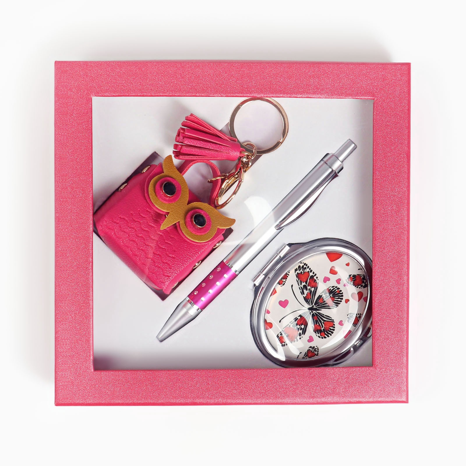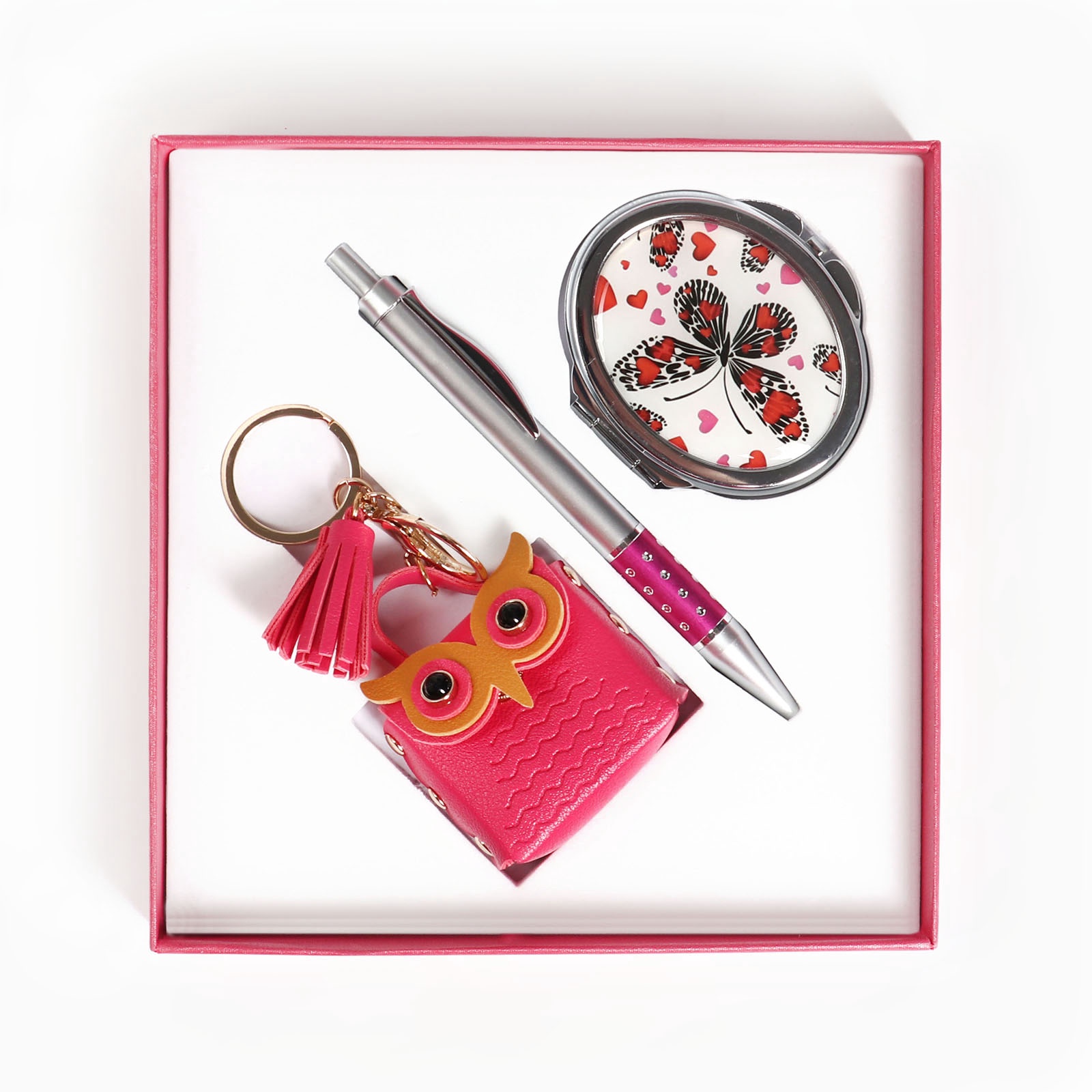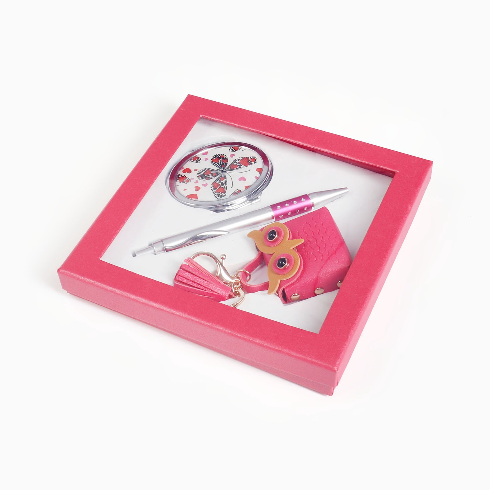 Набор подарочный, 3 предмета: ручка, брелок, зеркало. Для кого:Для девочки|Для кого:Для женщины|В наборе, шт.:3|Вид упаковки:Подарочная коробка|Тематика праздника:Универсальная тематика|Адресат:Без адресата|Составляющие набора:Зеркало|Составляющие набора:Брелок|Составляющие набора:Ручка|Возраст:Для детей|Возраст:Для взрослых|Страна:Китай  развернуть описание ▼