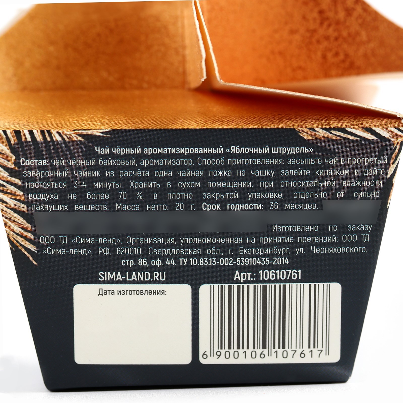 Чай чёрный новогодний «с новым годом», яблочный штрудель, 20 г. При оформление заказа, просим запрашивать актуальные сроки годности у менеджераСостав: чай чёрный байховый, ароматизатор. Способ приготовления: засыпьте чай в прогретый заварочный чайник из расчёта одна чайная ложка на чашку, залейте кипятком и дайте настояться 3–4 минуты. Хранить в сухом помещении, при относительной влажности воздуха не более 70 %, в плотно закрытой упаковке, отдельно от сильно пахнущих веществ. Масса нетто: 20 г. Срок годности: 36 месяцев. Набор:Нет|Вес нетто, г:20|Фасовка:Весовой|Вид чая:Чёрный|Символ года:Нет|Тематика праздника:Новый год|Вкус:Яблочный штрудель|Подарочный чай :Да|Добавки чая:Ароматизатор|Вид упаковки :В картонной коробке|Страна:Россия  развернуть описание ▼