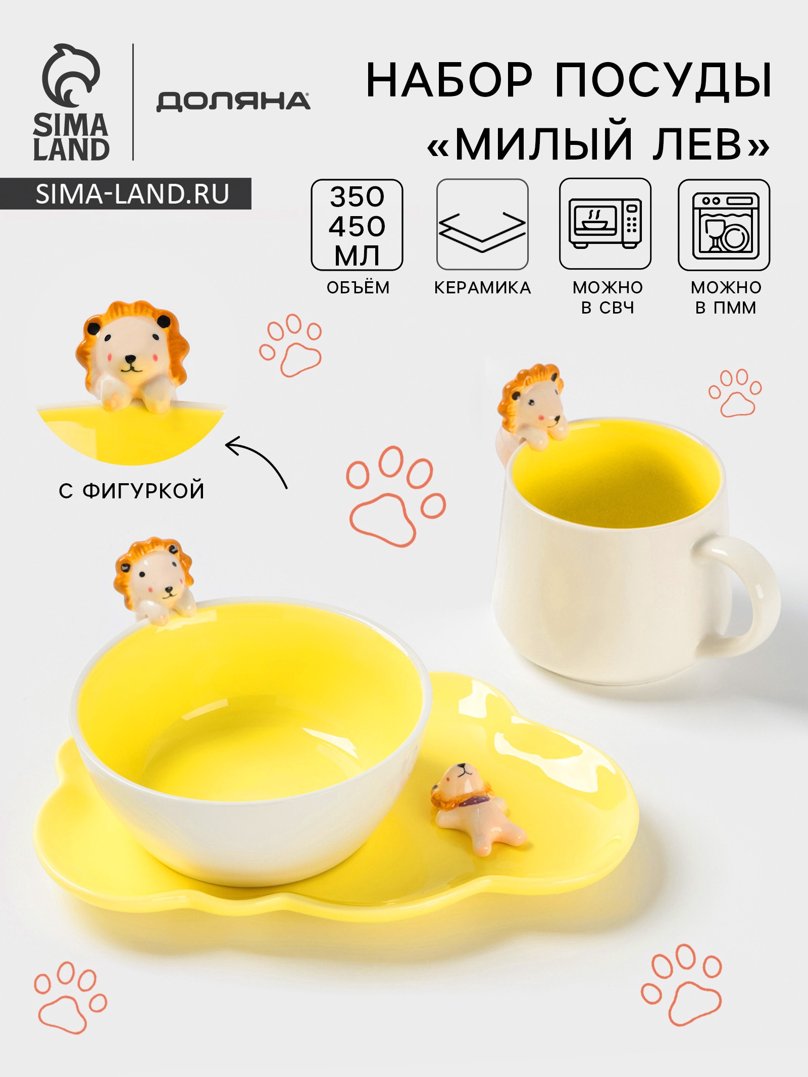 Набор детской посуды доляна «милый лев», 3 предмета: кружка 350 мл, супница 450 мл, тарелка, керамика, жёлтый