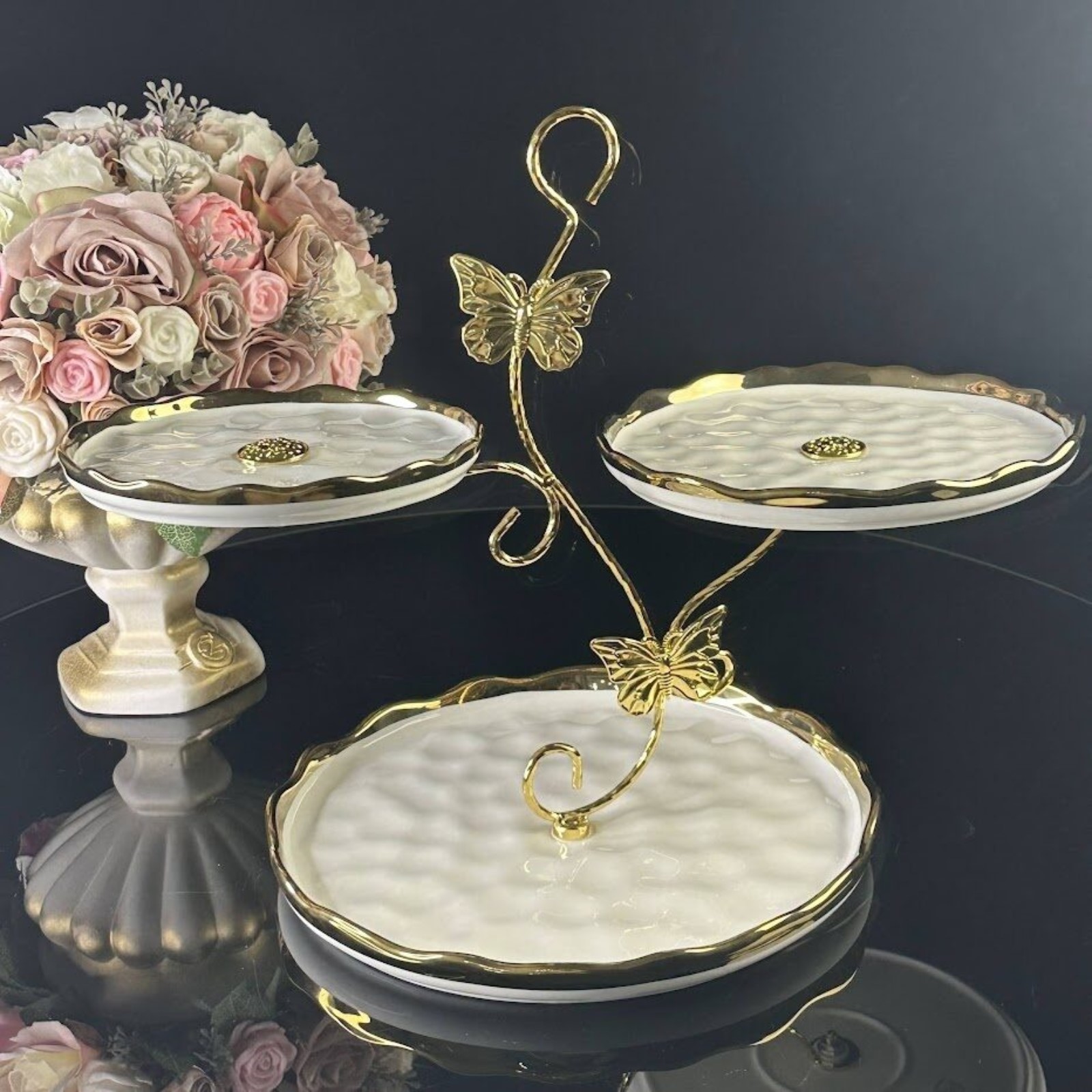 Этажерка трёхъярусная lenardi multicolor, фарфор. Коллекция посуды выполнена из фарфора представляет собой посуду для разной сервировки стола, покрытая плотной цветной глазурью разного цвета. Коллекцию отличает широкая отделка золотом, наличие золотых декоративных элементов. Не рекомендуется использовать в микроволновой печи и мыть в посудомоечной машине, по причине возможного повреждения золотого декоративного покрытия. Изделие может иметь следующие несущественные дефекты: незначительный скол краски;прерывание и наплыв рисунка;наличие полосы на рисунке;потёртости и наплыв золотой краски на внутренней стороне;небольшие потёртости и царапины на глазури;засорения под глазурью;плотные вздутия глазури на внутренней поверхности;натёк глазури;наличие мушек (чёрных точек);неровность внутреннего отверстия;отклеивание страз;потёртость упаковки в уголках. Данные недостатки не влияют на свойства изделия при использовании. Цвет: Белый Форма: Круглая Диаметр, см: 17 Диаметр, см: 20.5 Диаметр, см: 27.5 Тематика: Полоски, полоса Материал: Фарфор Можно мыть в посудомоечной машине: Нет Можно использовать в СВЧ-печи: Нет Текстура: С рельефом Особенности: С золотой отводкой Серия: Multicolor Серия: Lenardi Multicolor Форма: Круг, шар, цилиндр  развернуть описание ▼
