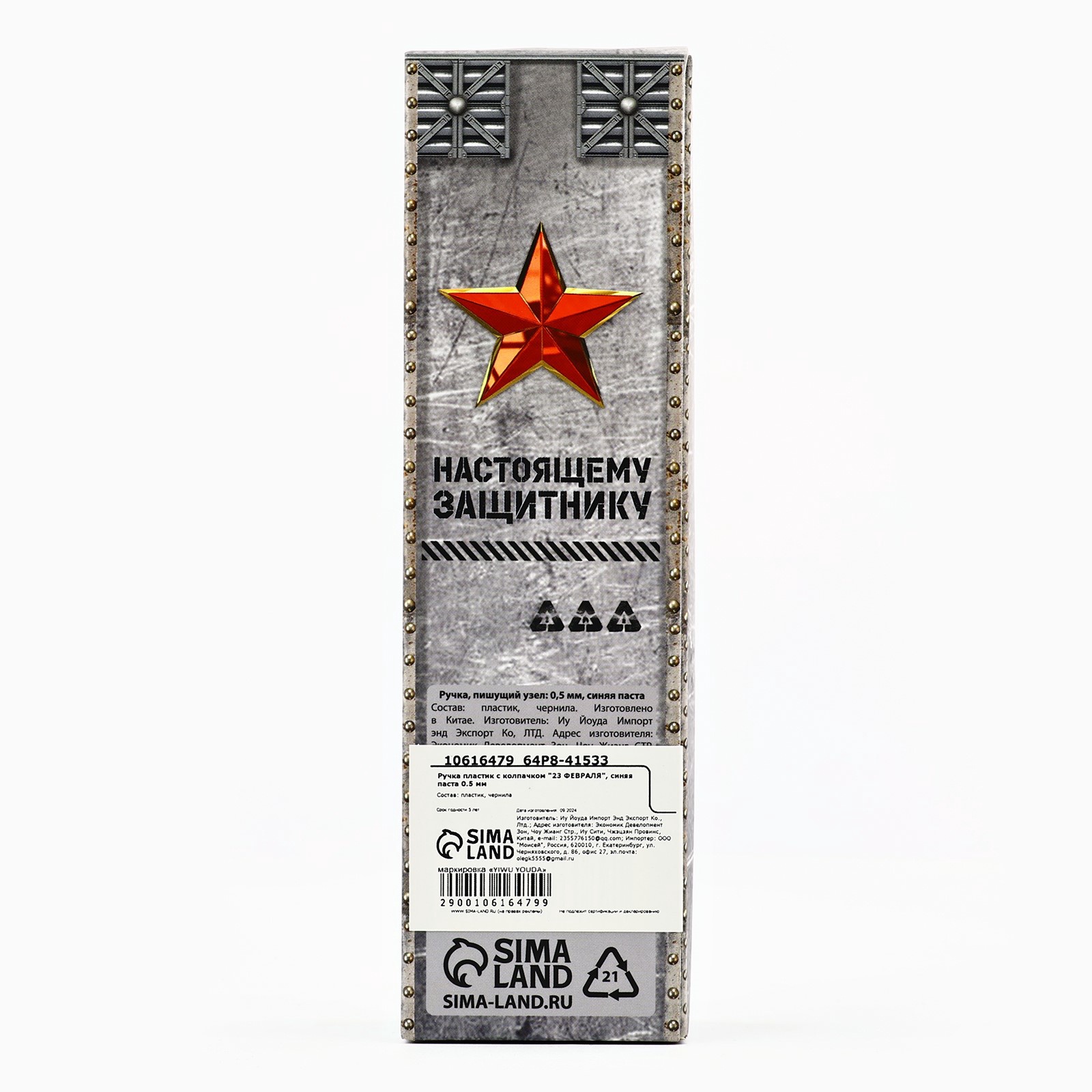 Ручка шариковая, пластик с колпачком, синяя паста, 0.5 мм «23 февраля». Ручка отличное дополнение к подарку. Яркий дизайн несомненно привлечет внимание и будет выделяться среди других предметов, а удобная форма корпуса позволит использовать ее с комфортом. Стержень заменяемый: да;Материал: пластик.Диаметр пишущего узла, мм:0.5|Набор:Нет|Цвет стержня:Синий|Европодвес:Нет|Вид упаковки:Коробка картонная|Тематика праздника:23 Февраля|Адресат:Без адресата|Материал:Пластик|Материал упаковки:Картон|Составляющие набора:Ручка|Штрихкод на единице товара:Да|Наличие грипа:Нет|Страна:Китай  развернуть описание ▼