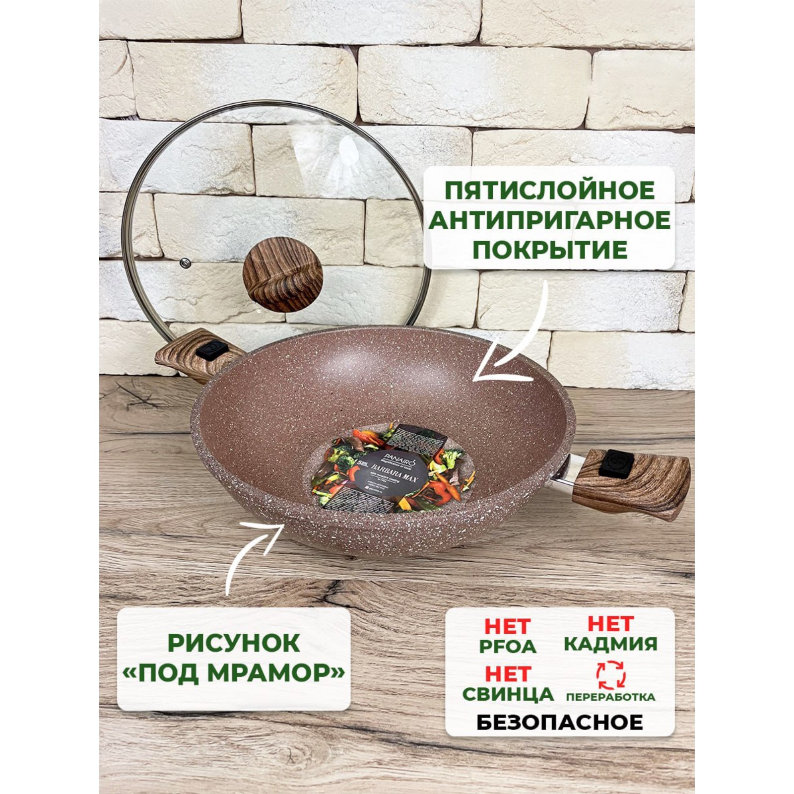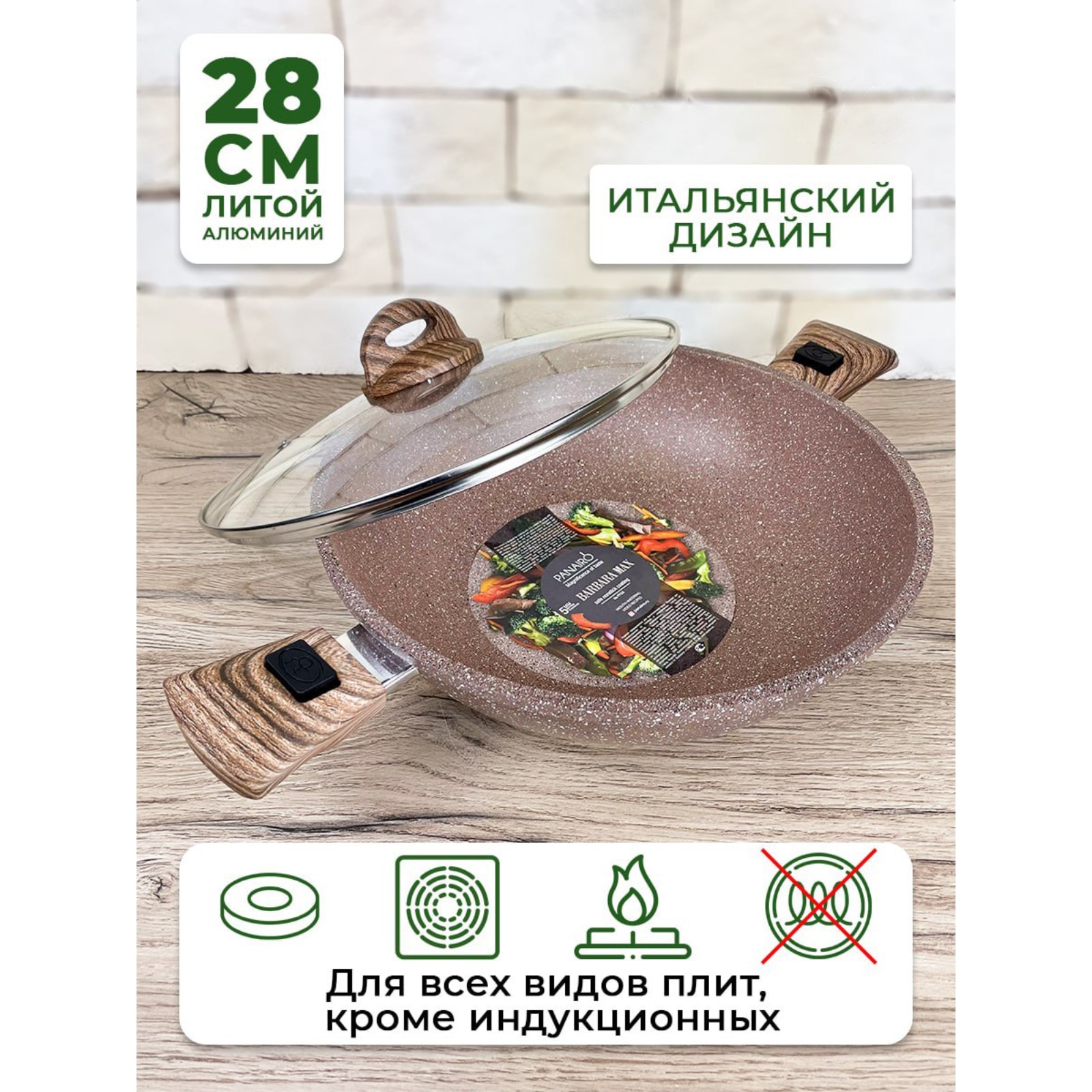 Сотейник вок Panairo Barbara, съёмные ручки Soft-touch, с крышкой, D=28 см