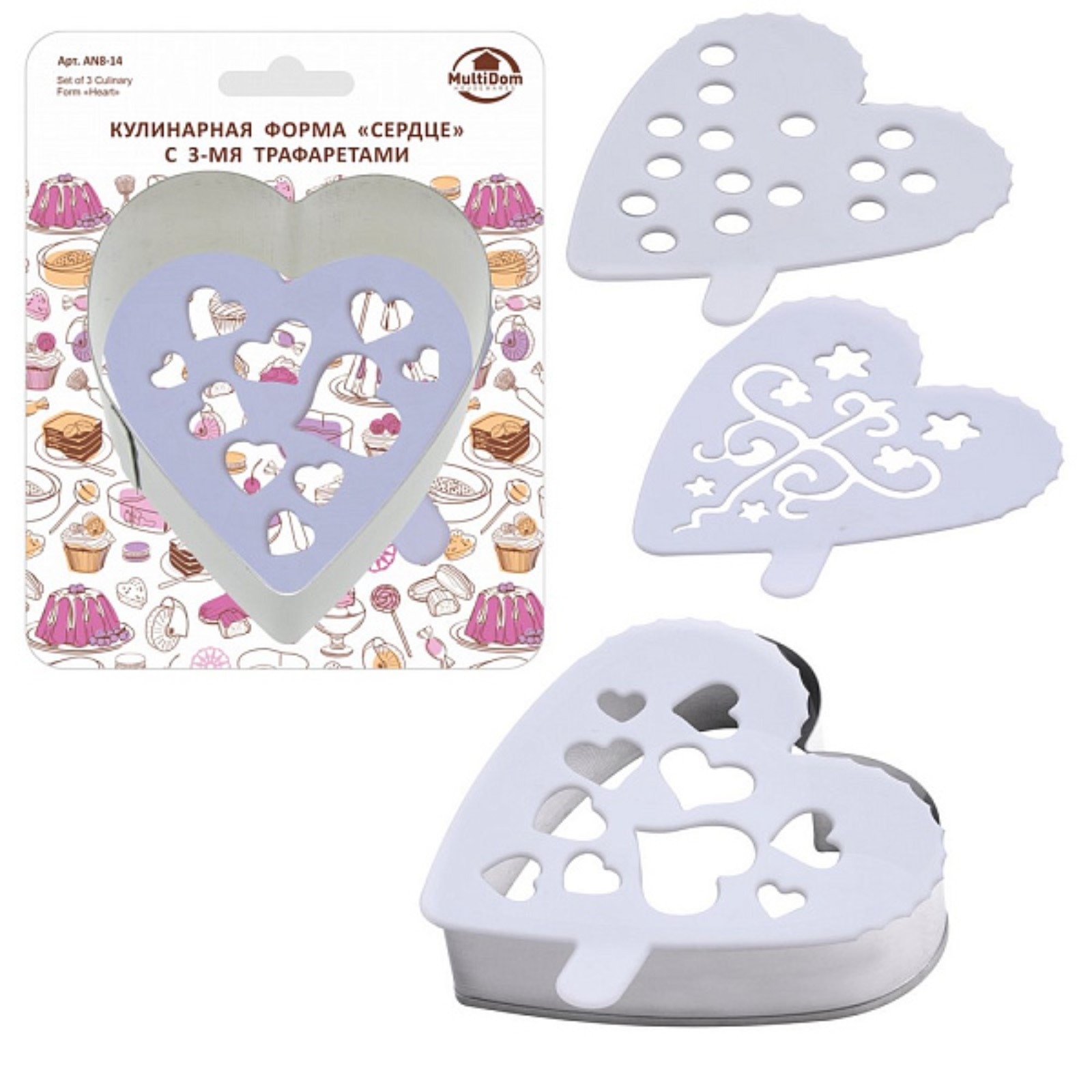 Форма кулинарная мультидом «сердце», 3 трафарета.   Форма выполнена из нержавеющей стали, трафареты из полипропилена.  Размеры изделия 8х7. 5х2. 5 см.  После использования промойте губкой с жидкими моющими средствами.  Цвет: Серебристый Форма: Сердце Фасовка, шт.: 1 В наборе, шт.: 4 Крышка: Да Материал: Нержавеющая сталь Материал: Пластик Тип покрытия: Без покрытия Тип формы: Для печенья и пирожных Разъёмная форма: Нет Можно мыть в посудомоечной машине: Нет Форма: Сердце  развернуть описание ▼