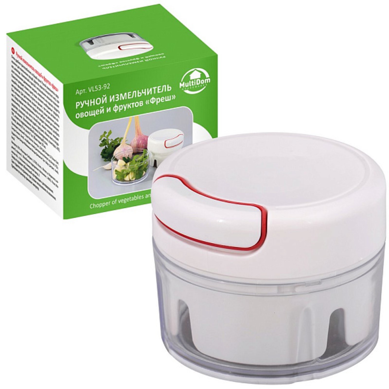Ручной измельчитель овощей и фруктов мультидом «фреш», 170 мл. Ручной измельчитель выполнен из металла и пластмассы. Предназначен для измельчения овощей, фруктов, бескостного мяса, орехов, шоколада. Компактный и простой в использовании механизм позволяет всего несколькими движениями смешать, измельчить или нарезать продукты. Поместите режущие лезвия в центр чаши, положите необходимые продукты, накройте крышкой и потяните за ручку на крышке, тем самым заставив лезвия вращаться. Для достижения лучшего результата, ваши движения должны быть четкими и резкими. Мягкие продукты не требуют усилия для измельчения. Материал: Металл Материал: Пластик Контейнер: Да Можно мыть в посудомоечной машине: Нет  развернуть описание ▼