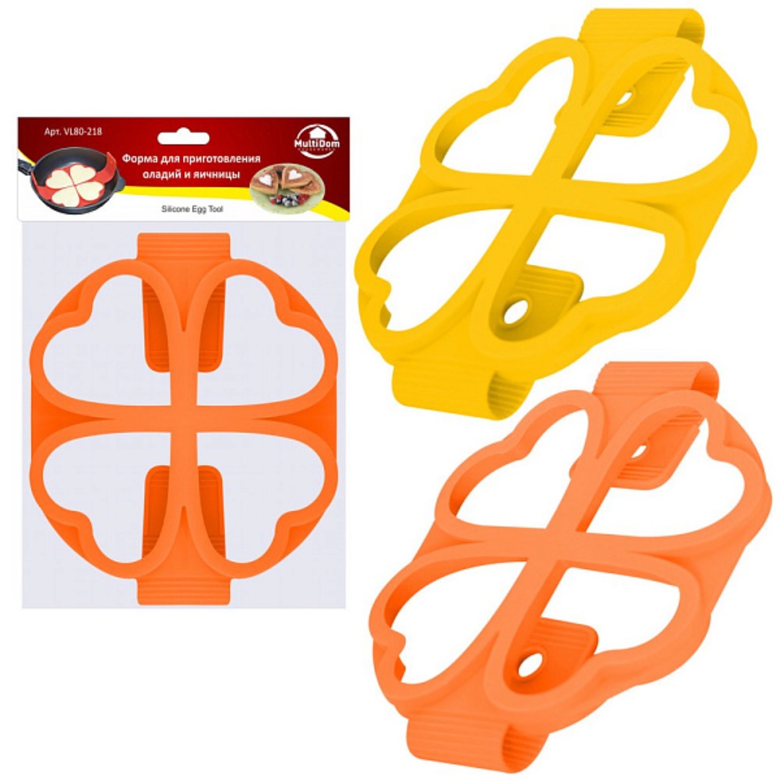 Форма для приготовления оладий и яичницы мультидом, силикон. Форма выполнена из силикона. Предназначена для приготовления оладий, толстых блинов и яичницы. Пользоваться формой очень легко: разогрейте сковороду, при необходимости смажьте её маслом, расположите форму в центре и залейте ячейки тестом, через пару минут переверните на другую сторону с помощью специальных ручек, затем извлеките готовые оладьи на тарелку. Силикон выдерживает нагрев до 220 градусов, не выделяет вредные вещества, не портит вкус пищи, устойчив к деформации. Цвет: МИКС Форма: Сердце Фасовка, шт.: 1 Крышка: Нет Материал: Силикон Тип покрытия: Без покрытия Ячейки: Да Тип формы: Для приготовления вторых блюд Разъёмная форма: Нет Можно мыть в посудомоечной машине: Нет Форма: Сердце  развернуть описание ▼