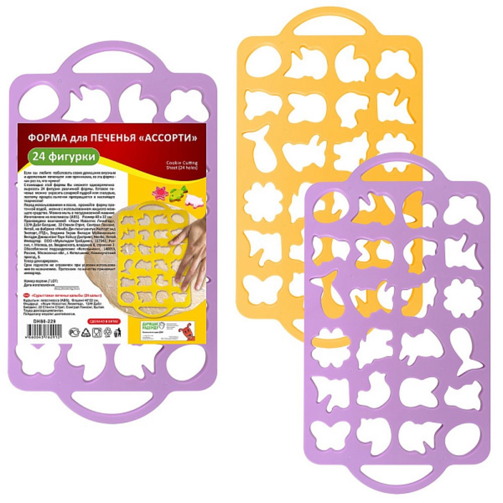 Форма для печенья мультидом «ассорти», пластик, 24 фигуры. Форма выполнена из пластмассы (ABS). С помощью формы для печенья «Ассорти» можно вырезать одновременно 24 фигурки в виде звездочек, сердечек, силуэтов животных, растений и т. п. После использования промойте изделие проточной водой с жидким моющим средством, можно помыть в посудомоечной машине. Размер 40х22 см. Цвет: МИКС Форма: Фигурная Фасовка, шт.: 1 В наборе, шт.: 24 Крышка: Нет Материал: АБС-пластик Тип покрытия: Без покрытия Тип формы: Для печенья и пирожных Разъёмная форма: Нет Можно мыть в посудомоечной машине: Нет Форма: Фигурная  развернуть описание ▼