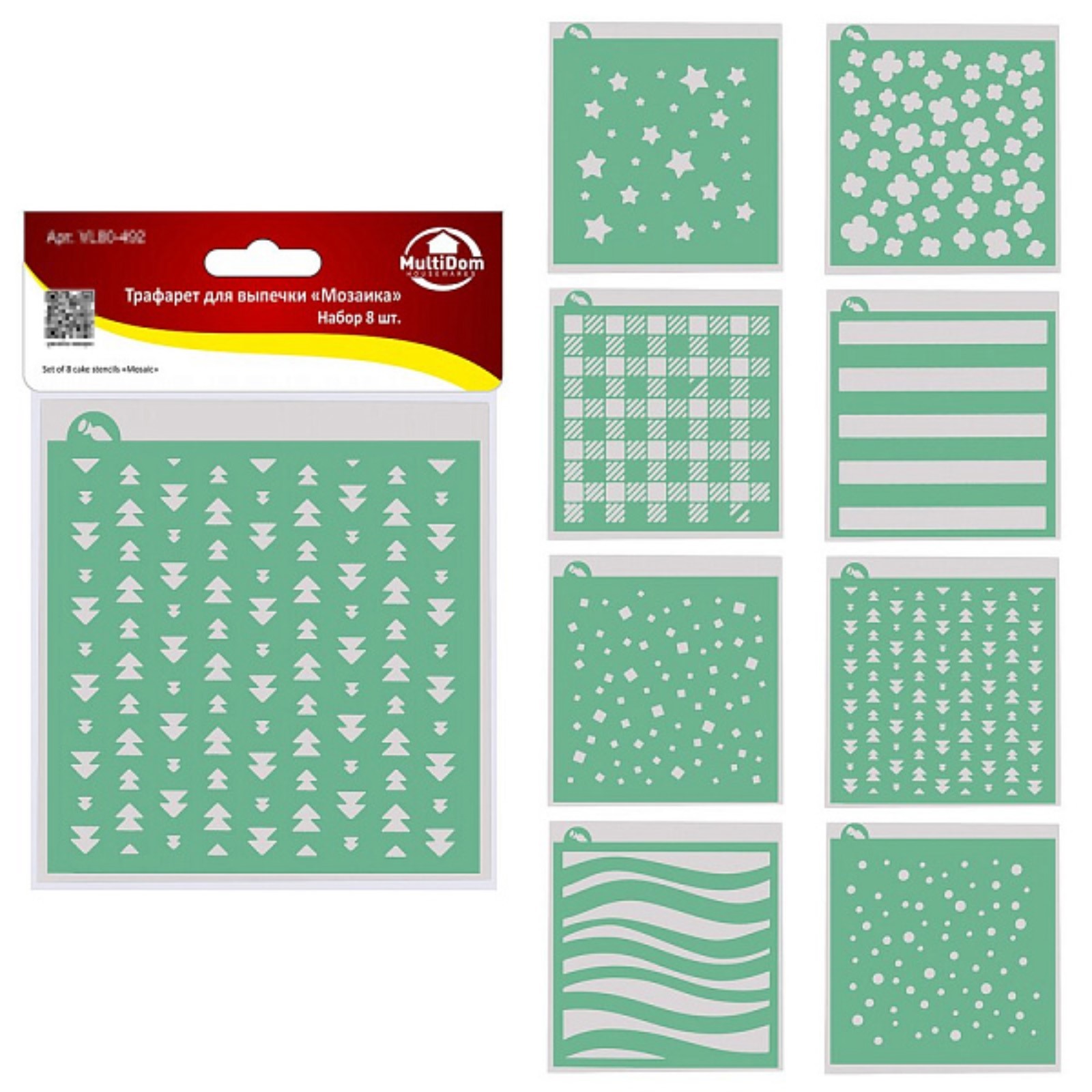 Трафарет для выпечки мультидом «мозаика», пластик, размер 14х15 см, 8 шт. Трафареты выполнены из пластмассы (полипропилен). Для декорирования подойдут какао, корица, крем, мастика, шоколад, сахарная пудра. Также рисунок можно нанести с помощью айсинга или скалкой прокатать мастику или марципан, чтобы получить узор. Приспособления изготавливаются из тонкого гибкого пластика, поэтому прекрасно держат форму, не сминаются и не размокают и их можно приложить как к прямой, так и к округлой поверхности. Цвет: Зелёный Форма: Фигурная Фасовка, шт.: 1 В наборе, шт.: 8 Материал: Полипропилен Тип покрытия: Без покрытия Разъёмная форма: Нет Можно мыть в посудомоечной машине: Нет Форма: Фигурная  развернуть описание ▼