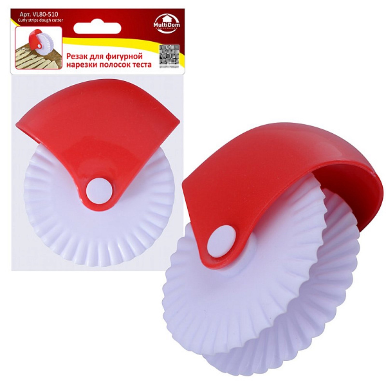Резак для фигурной нарезки полосок теста мультидом, пластик. Резак выполнен из пластмассы (полипропилен). С помощью такого резака вы легко и быстро нарежете тесто на фигурные полоски, которые можно использовать как для украшения пирогов, так и в качестве макаронных изделий. Прекрасно подойдёт для создания решётчатых верхушек пирогов с различными начинкой, печенья, слоек, тарталеток, украшений для коржей. Использование: раскатайте тесто, проведите резаком по пласту, слегка надавливая, полоски готовы. Подойдёт для любого, пластичного теста и мастики. Перед первым использованием и после каждого применения помыть в тёплой воде, можно с жидким моющим средством, сполоснуть проточной водой и просушить. Можно мыть в посудомоечной машине. Размер 10х8. 8х4 см. Цвет: Белый Цвет: Красный Количество лезвий: 2 Материал ручки: Пластик Материал: Полипропилен Можно мыть в посудомоечной машине: Нет Назначение: Для теста Ребристое лезвие: Да  развернуть описание ▼