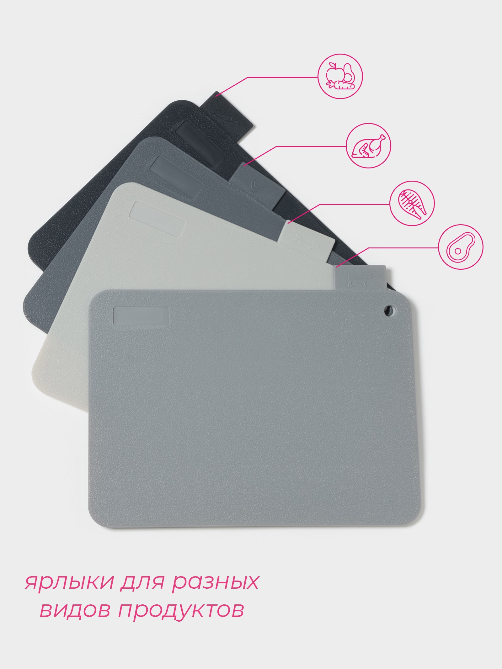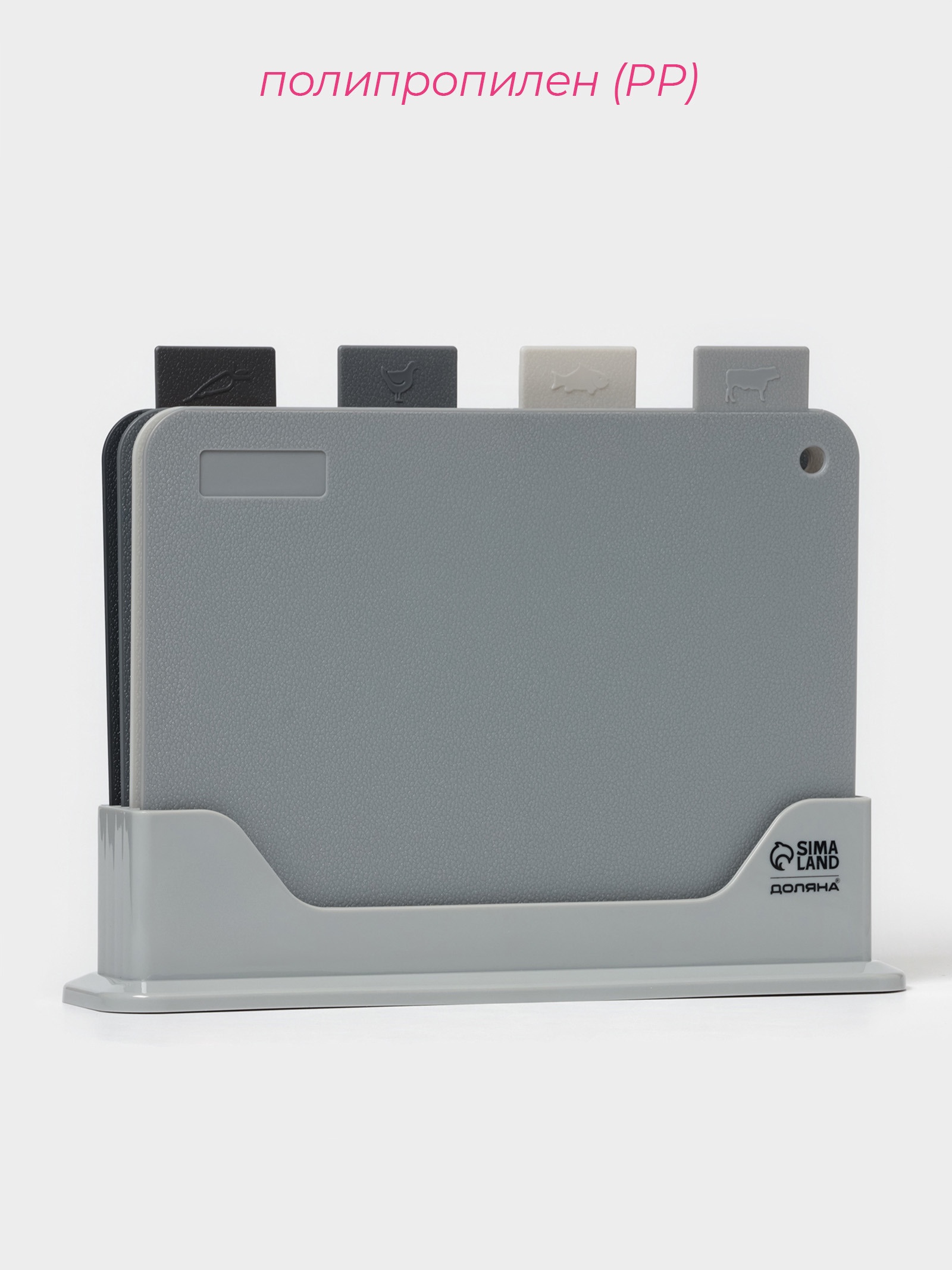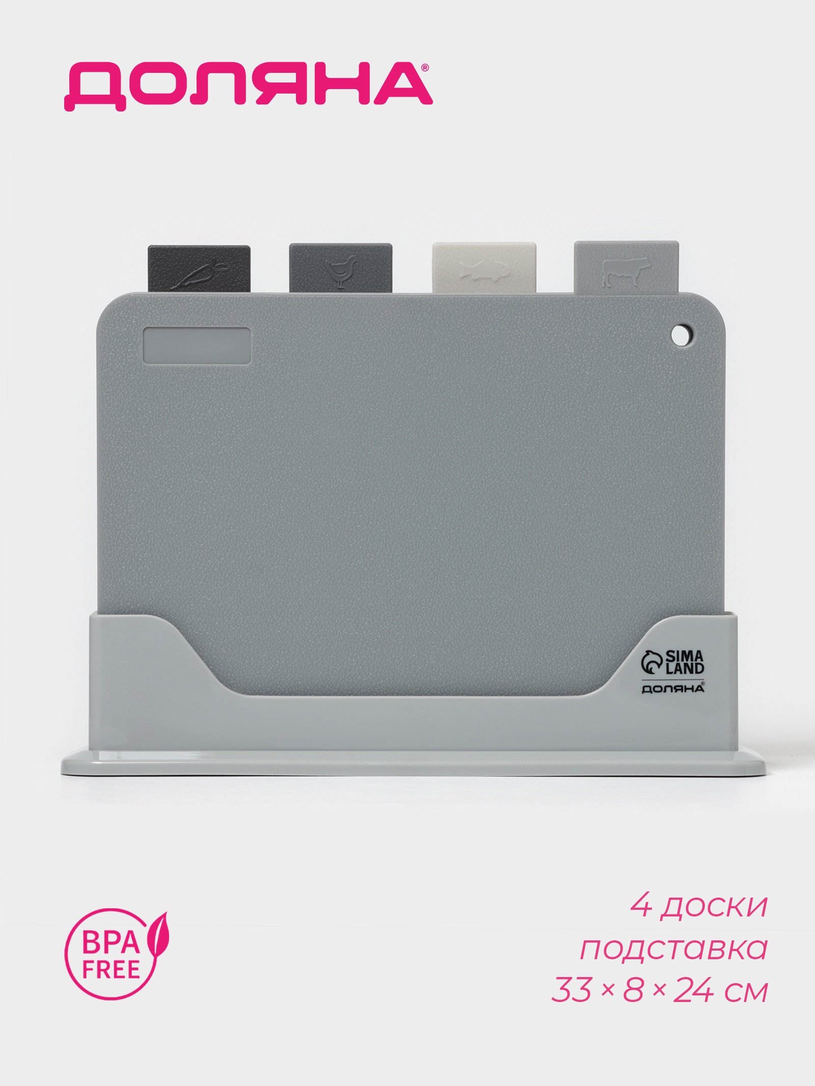 Доски разделочные доляна, набор 4 шт., на подставке, пластик, 33 8 24 см, серые. Наслаждайтесь порядком и удобством с набором разделочных досок «Доляна»! Набор разделочных досок Доляна — это сочетание практичности, стильного дизайна и высокого качества, созданное для того, чтобы приготовление пищи было максимально удобным и гигиеничным. Преимущества, которые вы оцените: Четыре доски в комплекте: набор включает в себя четыре разделочные доски, каждая из которых предназначена для различных видов продуктов, что предотвращает смешение запахов и бактерий.Удобная подставка: компактная подставка обеспечивает удобное хранение досок, экономит место на кухне и поддерживает порядок.Прочный материал: доски изготовлены из качественного пластика, который не впитывает запахи, легко моется и устойчив к царапинам.Стильный дизайн: серый цвет и лаконичная форма досок прекрасно впишутся в интерьер любой современной кухни.Практичный размер: доски имеют оптимальный размер для удобной нарезки любых продуктов.Возможность мытья в посудомоечной машине: доски легко моются в посудомоечной машине, экономя ваше время и силы.Гигиеничность: пластик, из которого изготовлены доски, препятствует развитию бактерий и обеспечивает безопасность при использовании.С набором разделочных досок Доляна приготовление пищи станет более организованным, удобным и приятным процессом! Набор:Да|Цвет:Серый|Длина, см:30|Ширина, см:21.8|В наборе, шт.:5|Рисунок:Нет|Материал:Пластик|Толщина, см:0.2|Можно мыть в посудомоечной машине:Да|Особенности:На подставке|Страна:Китай  развернуть описание ▼