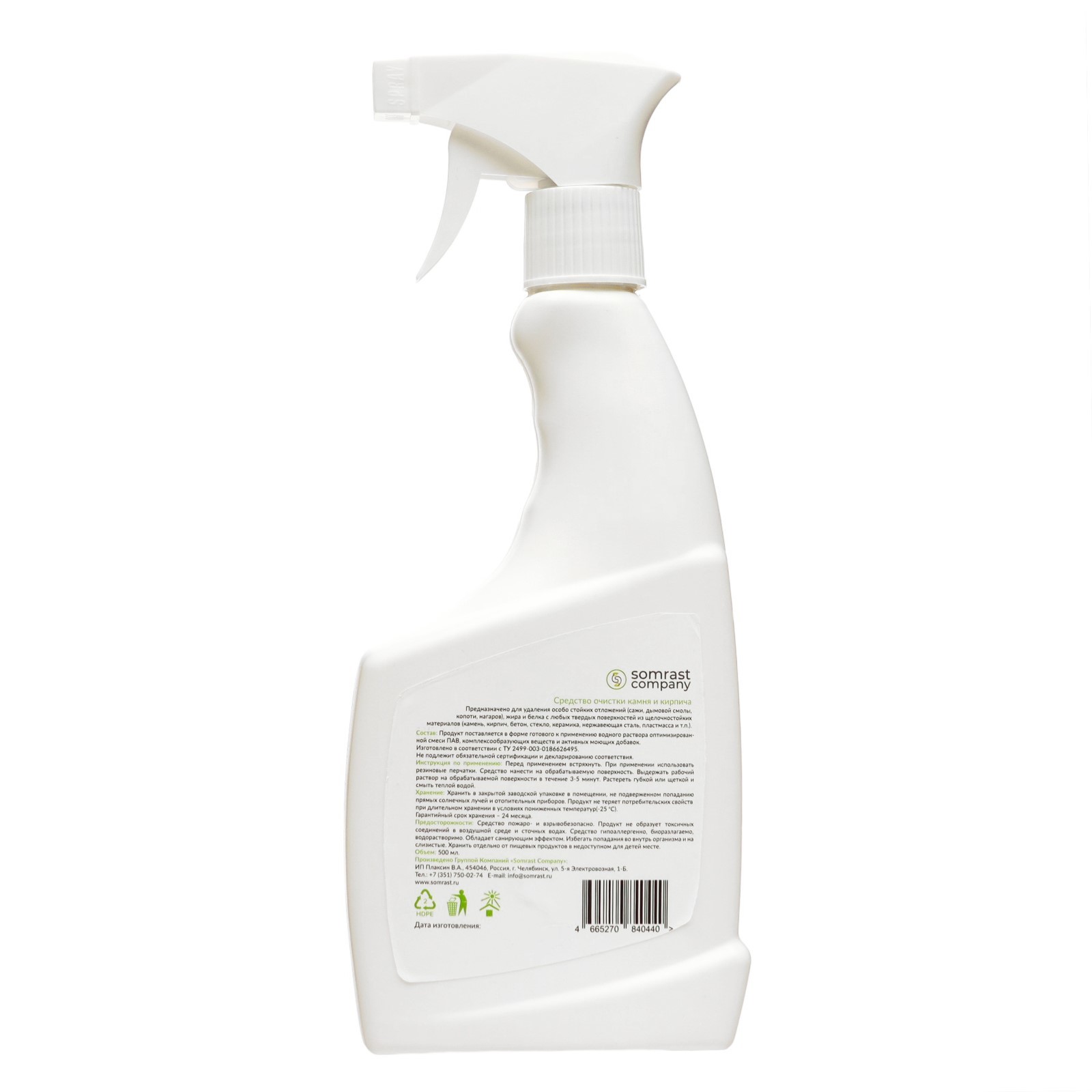 Средство чистящее somrast для очистки камня и кирпича, 500 мл. Средство чистящее Somrast для очистки камня и кирпича - это инновационный продукт, созданный специально для ухода за поверхностями из натурального и искусственного камня, а также кирпича. Объем бутылки составляет 500 мл, что делает его экономичным и удобным в использовании. Средство Somrast эффективно удаляет различные виды загрязнений, такие как пыль, грязь, масляные пятна и другие. Оно не только очищает поверхность, но и защищает ее от повторного загрязнения, создавая невидимую пленку. Благодаря этому, камень и кирпич дольше остаются чистыми и блестящими. Средство Somrast безопасно для окружающей среды, так как не содержит агрессивных химических веществ. Оно легко смывается водой и не оставляет следов и разводов. Продукт подходит для использования как внутри помещений, так и снаружи. В результате применения средства Somrast, поверхности из камня и кирпича приобретают свежий и ухоженный вид, подчеркивая их естественную красоту и элегантность. Вес, г/Объём, мл: 500 Температурное ограничение: Нет  развернуть описание ▼