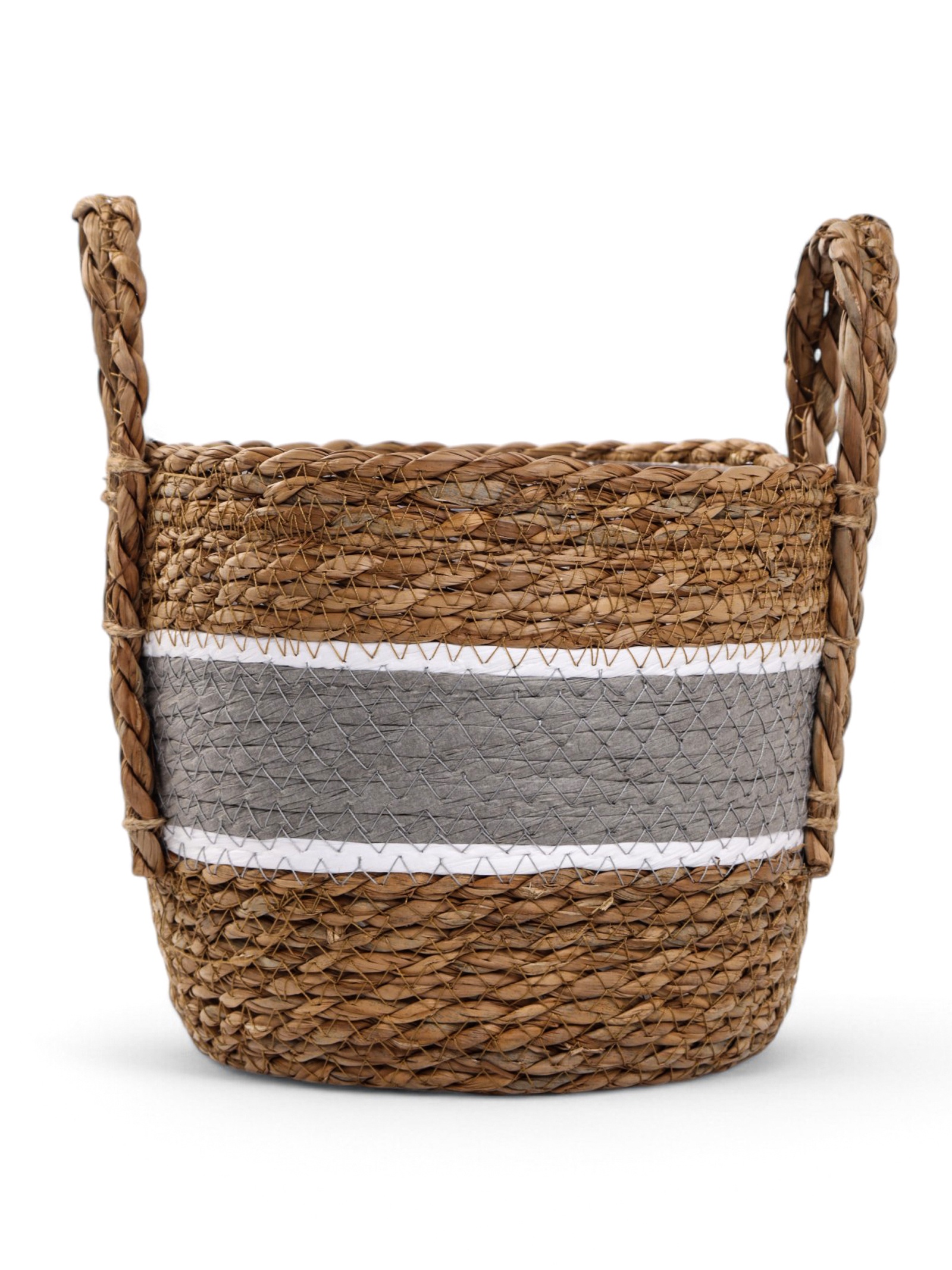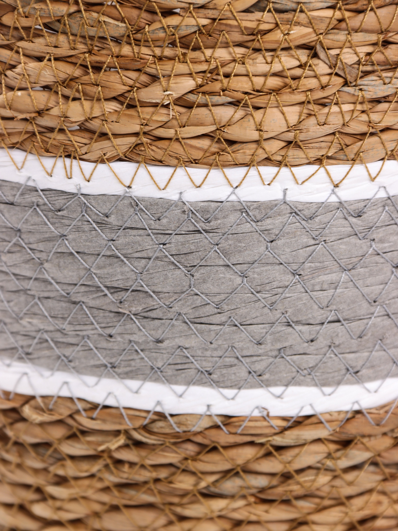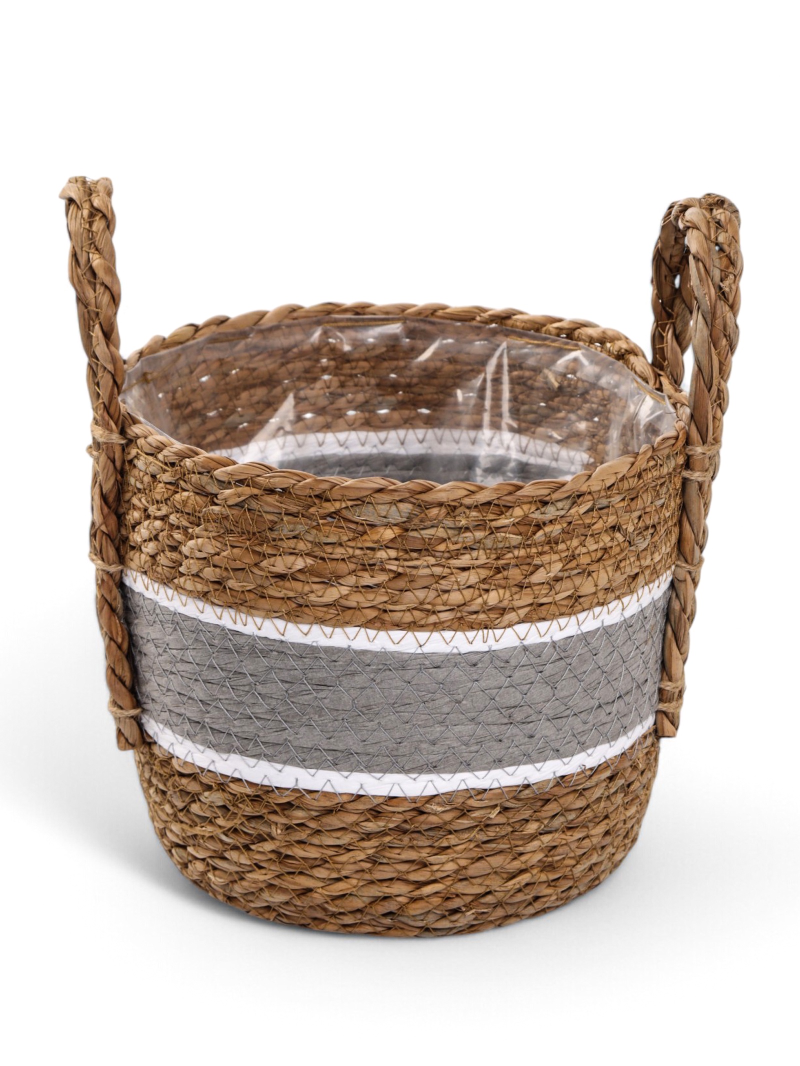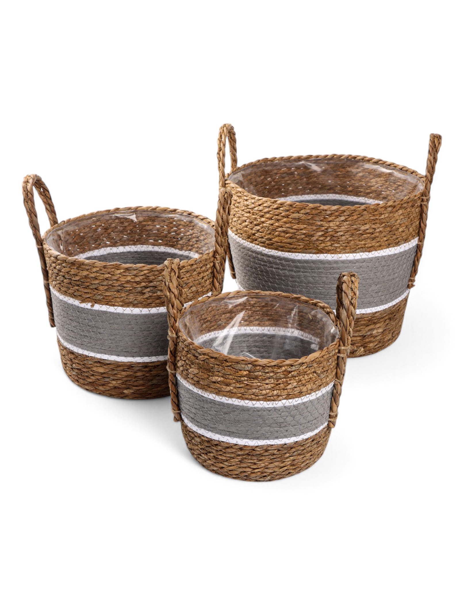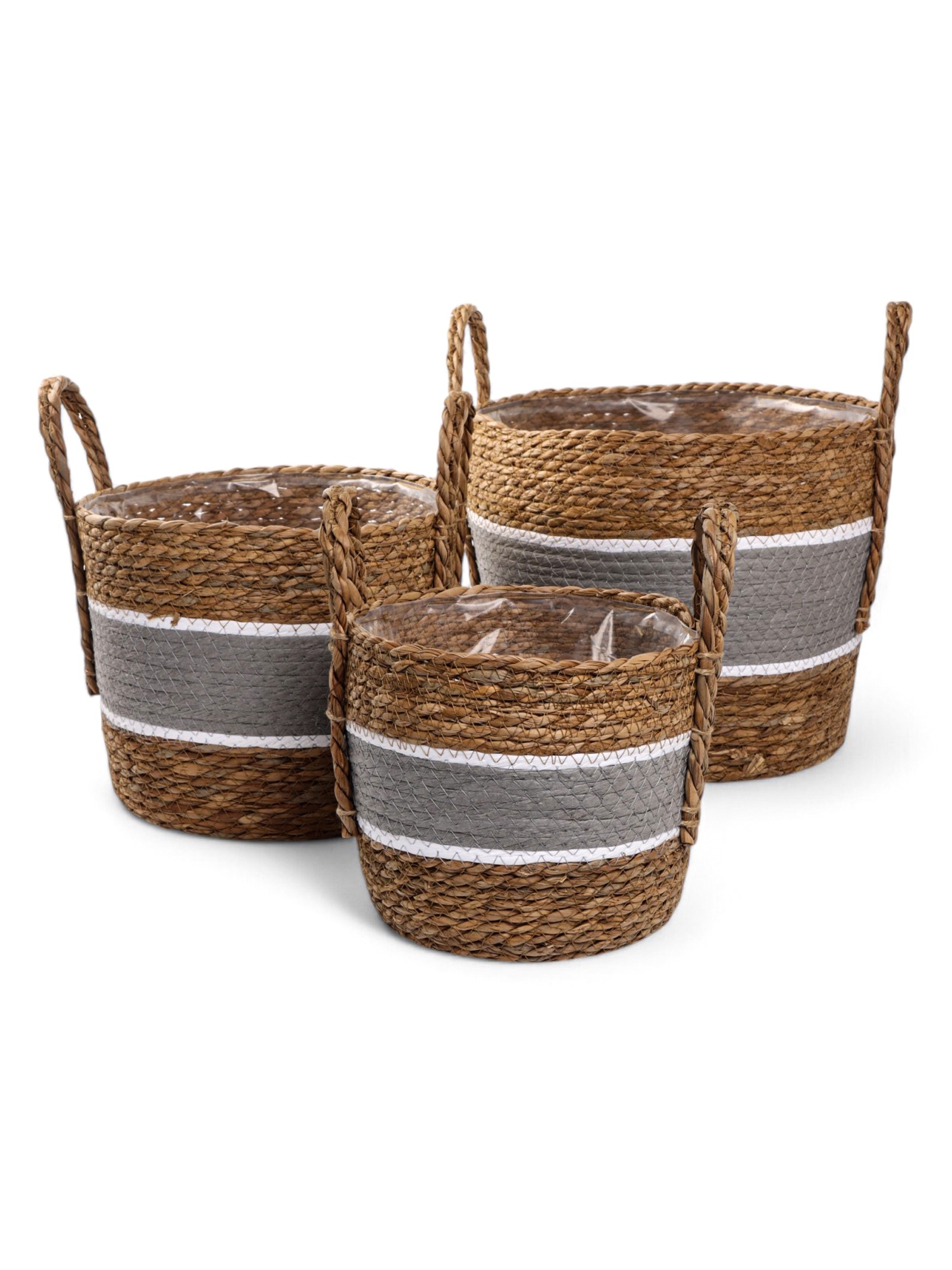 Набор кашпо «инга», 3 шт., 20.5 25 – 25.5 28 – 27 33 см, серая полоса. Цвет:Серый|Цвет:Коричневый|Высота, см:25|Высота, см:28|Высота, см:33|Объём, л:16|Объём, л:28|Объём, л:50|Вид установки:Напольное|Материал:Дерево|Материал:Текстиль|Можно оставлять зимой на улице:Нет|Особенности:Плетёное|Особенности:Набор|Тип полива:Без системы полива|Страна:Китай  развернуть описание ▼