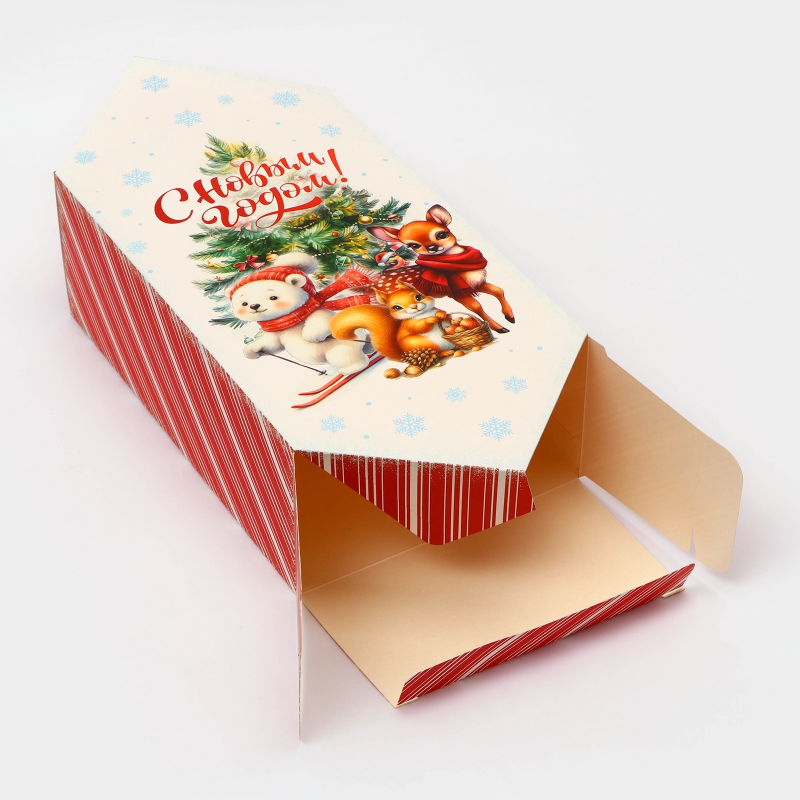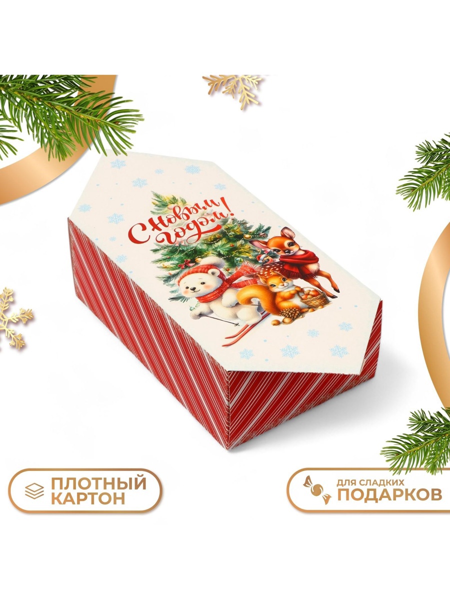 Коробка - конфета новогодняя подарочная складная «с новым годом», 18 28 10 см. Складная новогодняя коробка в виде конфеты — это оригинальная и праздничная упаковка для подарков, которая подчеркнёт волшебную атмосферу зимних праздников. Коробка выполнена в форме конфеты и оснащена удобным механизмом складывания, что позволяет легко собрать и разобрать её при необходимости. Она идеально подойдёт для упаковки сладостей, небольших подарков, сувениров и аксессуаров. Яркий и стильный дизайн создаст настроение праздника, а прочный материал гарантирует сохранность содержимого. Такая коробка станет не только практичной упаковкой, но и эффектным элементом декора, привлекая внимание и даря радость получателям. Цвет:Красный|Цвет:Бежевый|Форма:Фигурная|Форма:Прямоугольная|Плотность, г/м :350|Длина, см:28|Ширина, см:18|Высота, см:10|Тематика:Новогодняя|Тематика:Рождественская|Символ года:Нет|Тематика праздника:Рождество|Тематика праздника:Новый год|Материал:Картон|Вид:Складные коробки|Вид:Прямоугольные|Вид:Коробки-конфеты|Вид:Фигурные|Размер:Средний (18-24 см)|Окошко:Нет|Крышка-дно:Нет|Страна:Россия  развернуть описание ▼