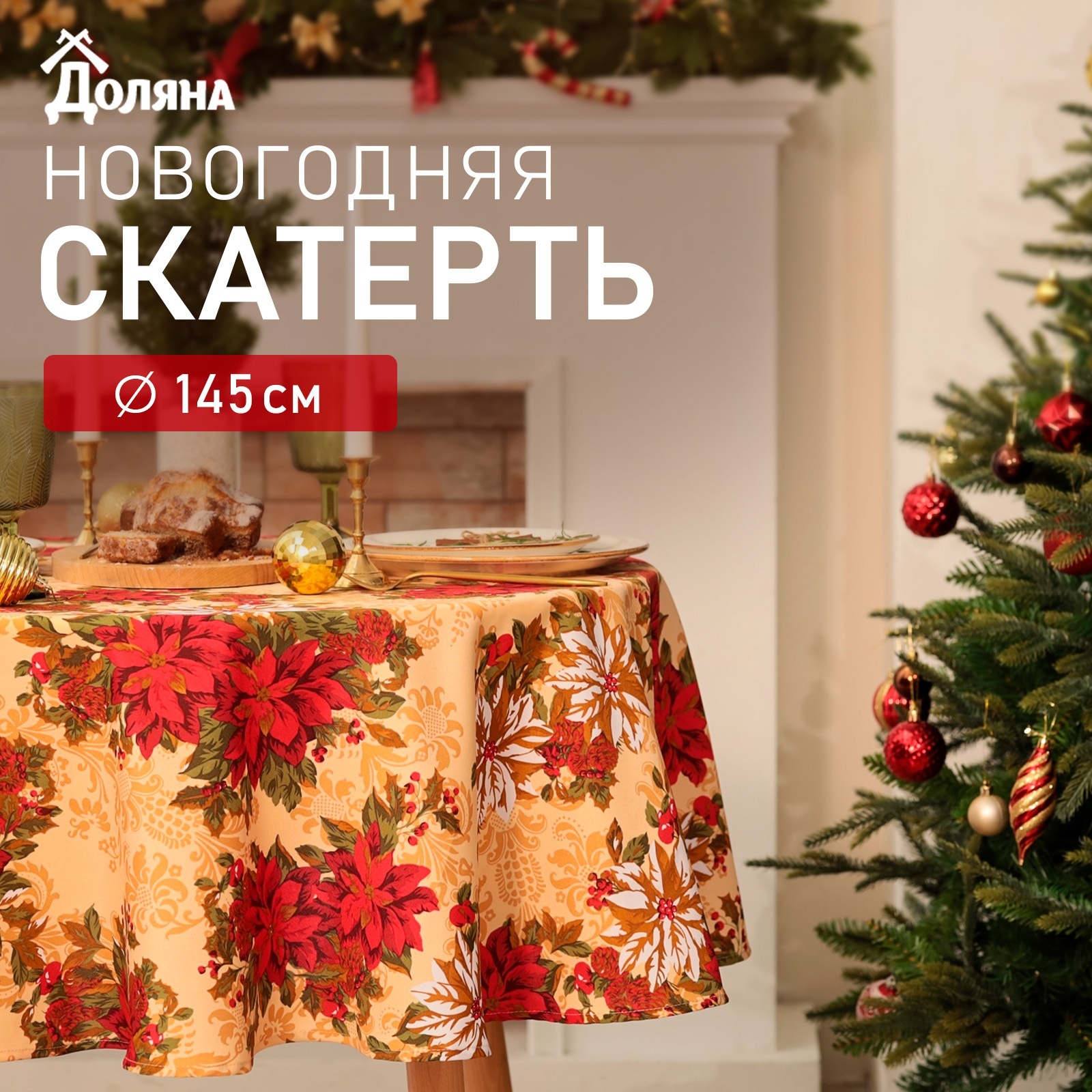Скатерть доляна "новогодние украшения" d145см, 100% п/э, 140гр/м2.