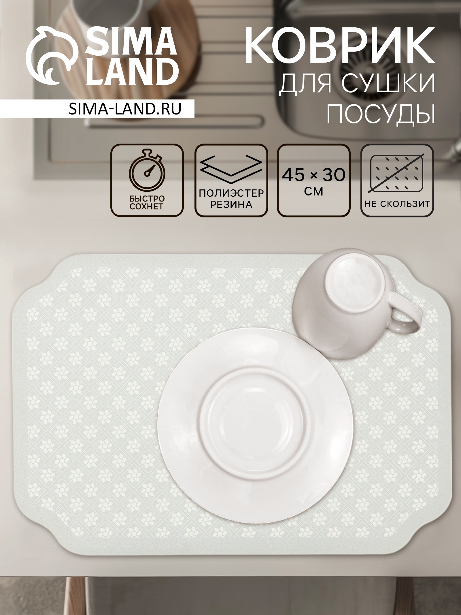 Коврик для сушки посуды доляна daisies, влаговпитывающий, 45 30 см, серый.   Коврик для сушки посуды с оригинальным дизайном в виде ромашек станет практичным аксессуаром для вашей кухни. Его компактные размеры и влаговпитывающие свойства делают его незаменимым помощником в поддержании порядка после мытья посуды. Серый цвет легко впишется в любой интерьер, а резиновая основа обеспечивает устойчивость на поверхности. Особенности Оптимальный размер 45 30 см — подходит для размещения на столешнице или в раковине.Резиновая основа предотвращает скольжение, защищая посуду от повреждений.Серый цвет универсален и сочетается с любым стилем кухни.Легко очищается и быстро сохнет, сохраняя гигиеничность.Почему этот коврик — must-have для кухниx Этот аксессуар не только функционален, но и эстетичен. Его дизайн с ромашками добавляет уюта, а практичность помогает содержать кухню в чистоте. Резиновая основа обеспечивает долговечность, а компактные размеры позволяют использовать коврик даже в небольших пространствах. Идеальное решение для тех, кто ценит порядок и стиль. Цвет:Серый|Размер, см:45 х 30|Материал:Резина|Страна:Китай  развернуть описание ▼