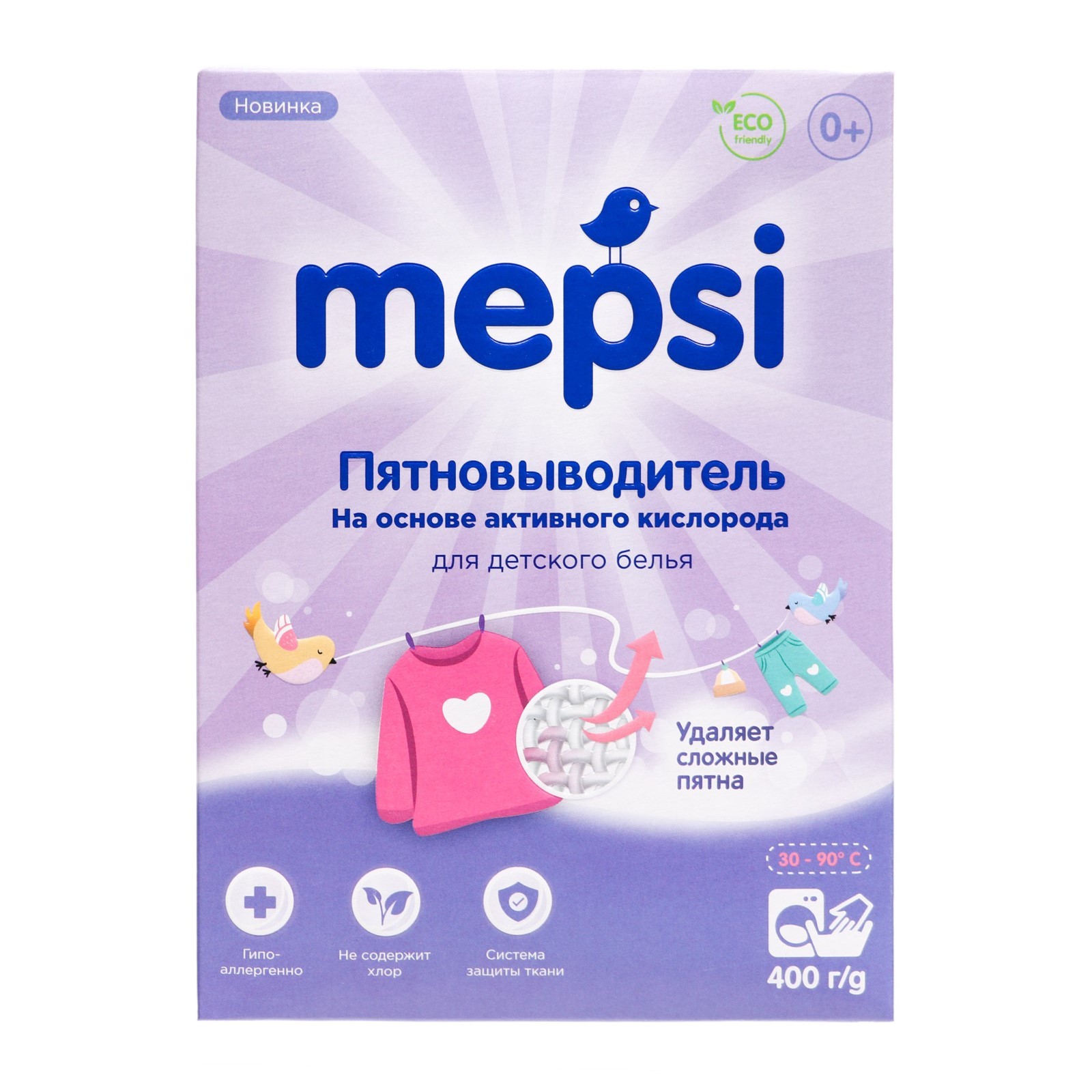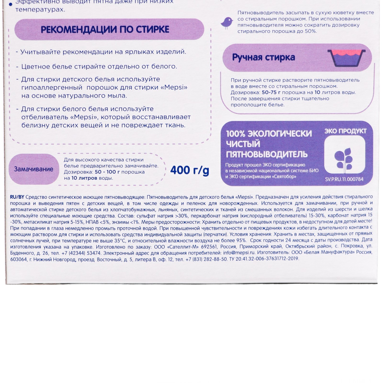 Пятновыводитель для детского белья mepsi на основе активного кислорода, 400 г. Пятновыводитель для детского белья Mepsi на основе активного кислорода, 400 г Его преимущества: Гипоаллергенный. Рекомендован к использованию для усиления действия стирального порошка. Изготовлен на основе активного кислорода и натурального мыла эффективно справляется с трудно выводимыми пятнами. Не разрушает структуру ткани даже при частых стирках. Полностью выполаскивается из белья. Низкие дозировки делают стирку экономичной. Эффективно выводит пятна, даже при низких температурах. Экопродукт. Состав:Вода очищенная более 30%, АПАВ 5-15%, НПАВ менее 5%, трилон Б менее 5%, мыло менее 5%, консервант менее 5% Вес, г/Объём, мл: 400 Форма выпуска: Порошок Назначение: Для всех видов тканей Назначение: Для детского белья Температурное ограничение: Нет  развернуть описание ▼