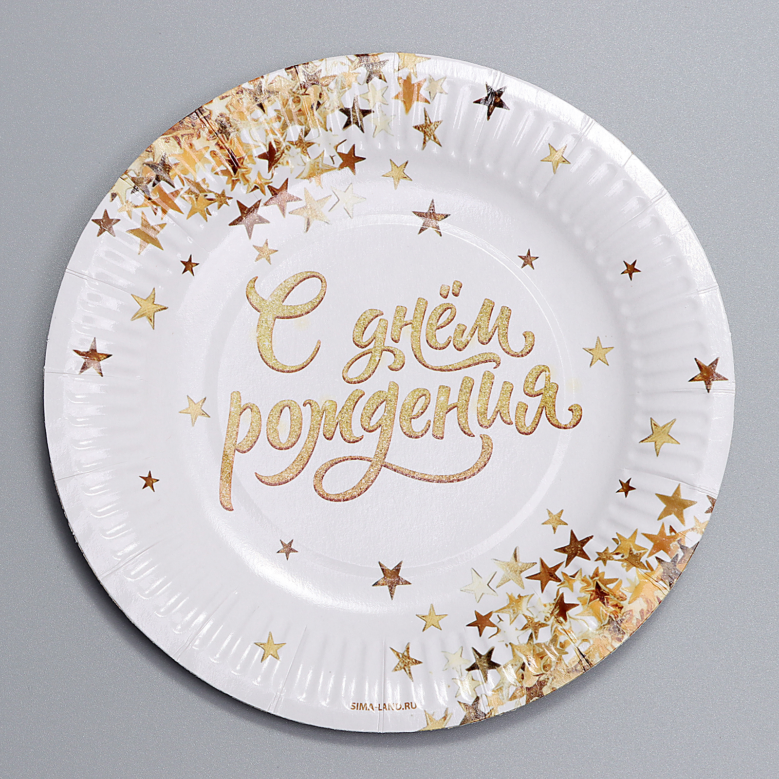 Тарелка одноразовая бумажная "с днем рождения" золото, 18 см