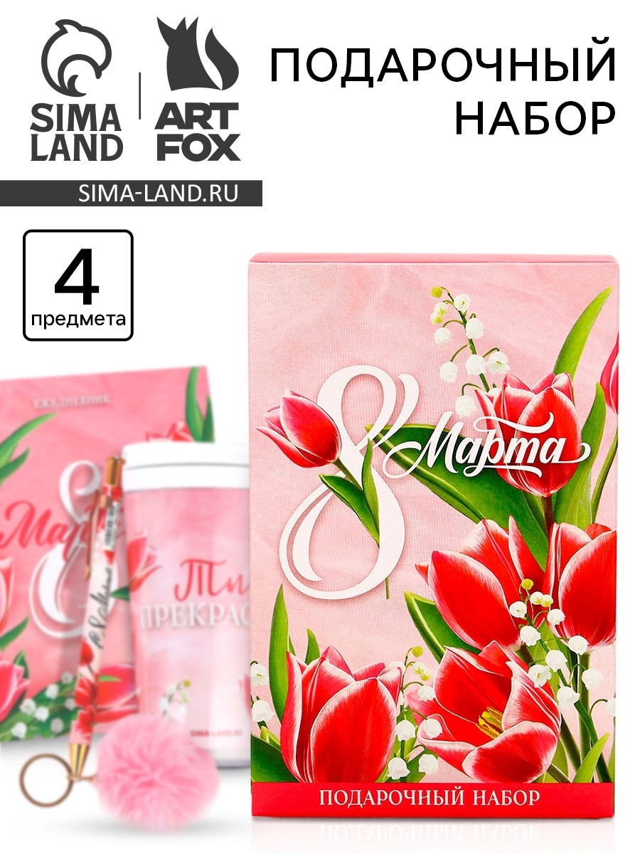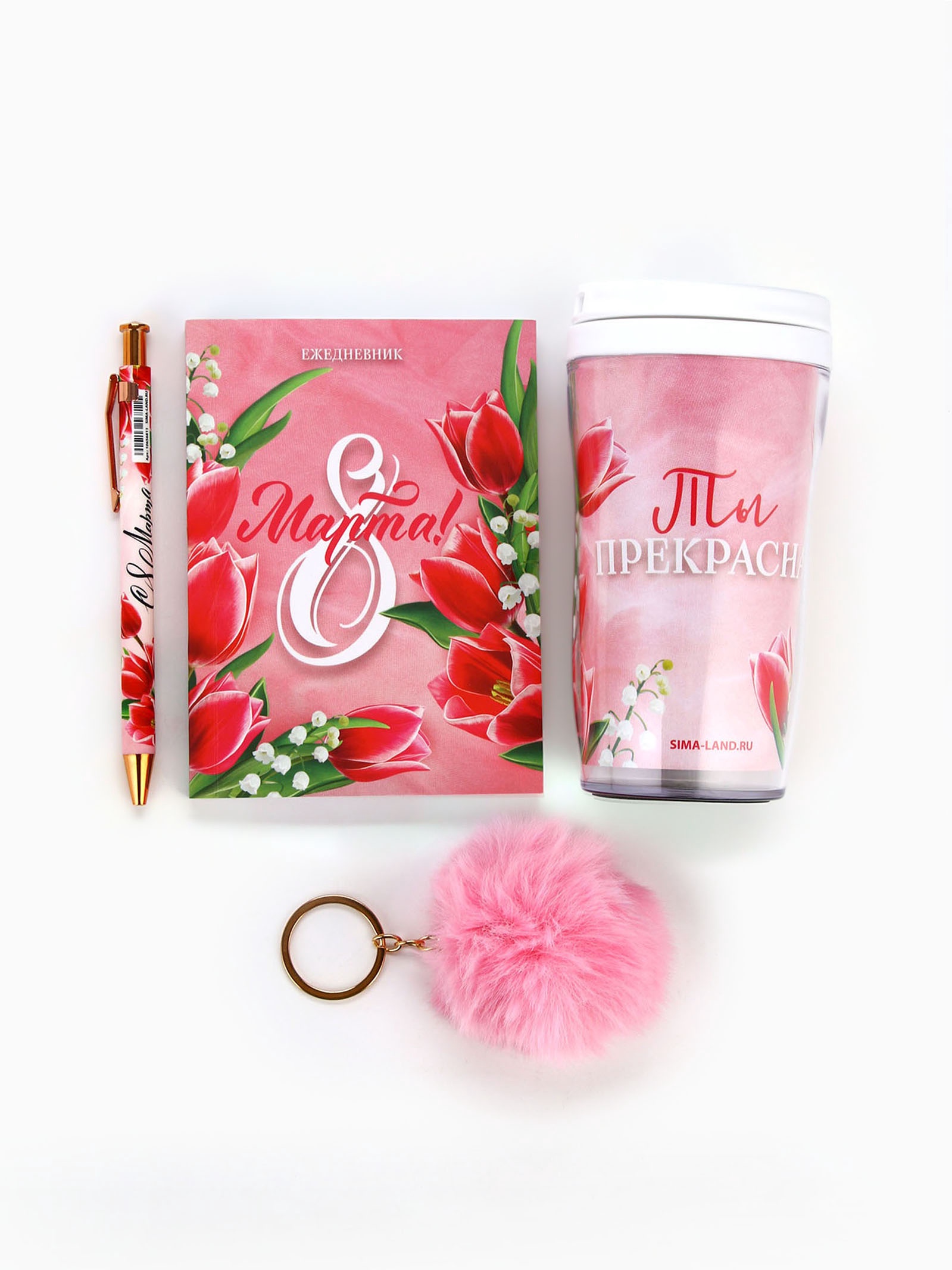 Подарочный набор: термостакан, ежедневник а6, 120 л., брелок, ручка «8 марта»
