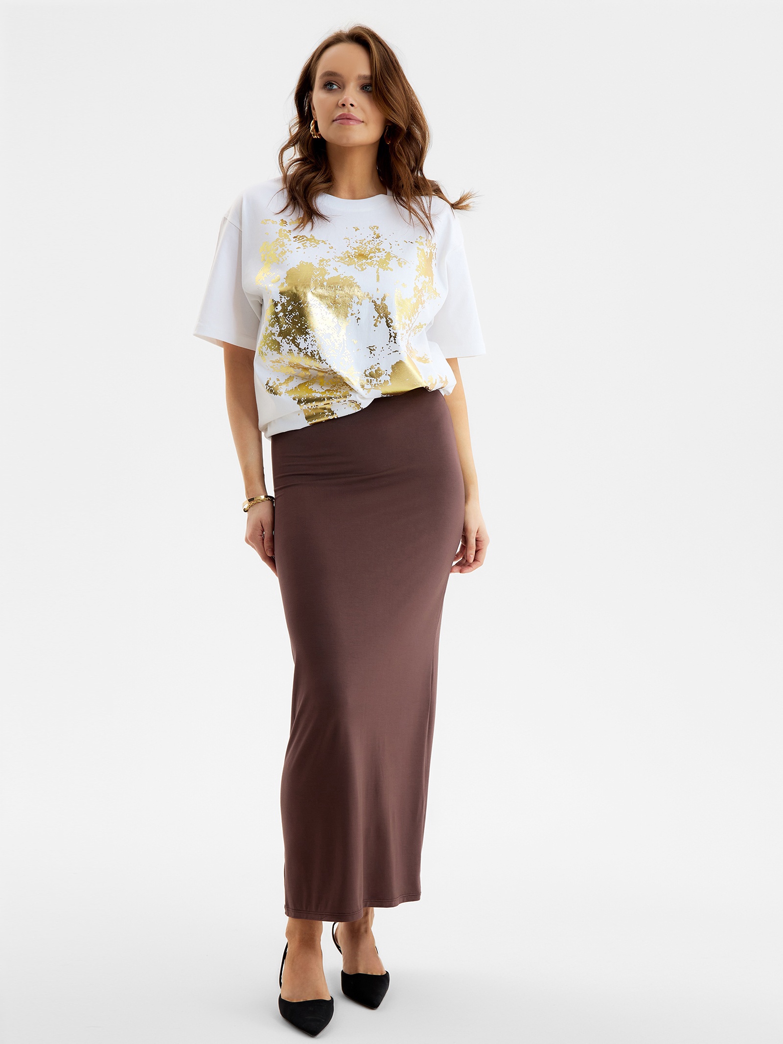 Цвет:Коричневый|Для кого:Для женщины|Назначение:Офис|Назначение:Вечерняя мода|Назначение:Повседневная|Ткань:Вискоза|Размер:42|Рост, см:165 - 175|Сезон:Демисезон|Сезон:Лето|Вид застёжки:Без застёжки|Тематика:Однотонная|Декоративные элементы:Без элементов|Покрой:А-силуэт|Тип карманов:Без карманов|Рекомендации по уходу:Барабанная сушка при низкой температуре|Рекомендации по уходу:Деликатная стирка при 30 °С|Рекомендации по уходу:Не отбеливать|Рекомендации по уходу:Глажка при 110 °С|Тип посадки:Высокая|Состав ткани:Вискоза|Состав ткани:Эластан|Длина юбки:Макси|Вид юбки:А-силуэт|Страна:Китай