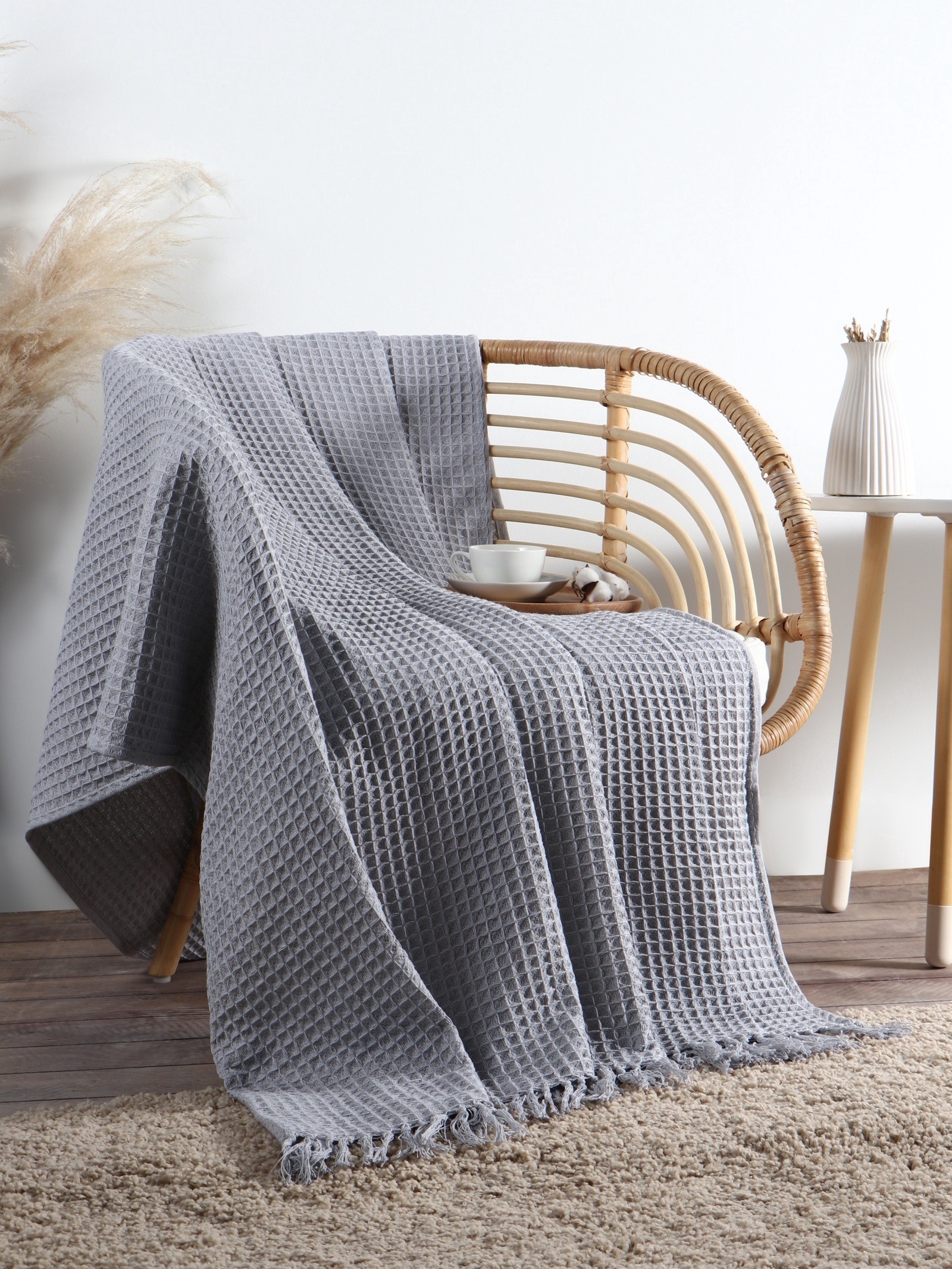 Плед с кисточками вафельный «этель», 130 160 см, светло-серый, вафля 350 г/м