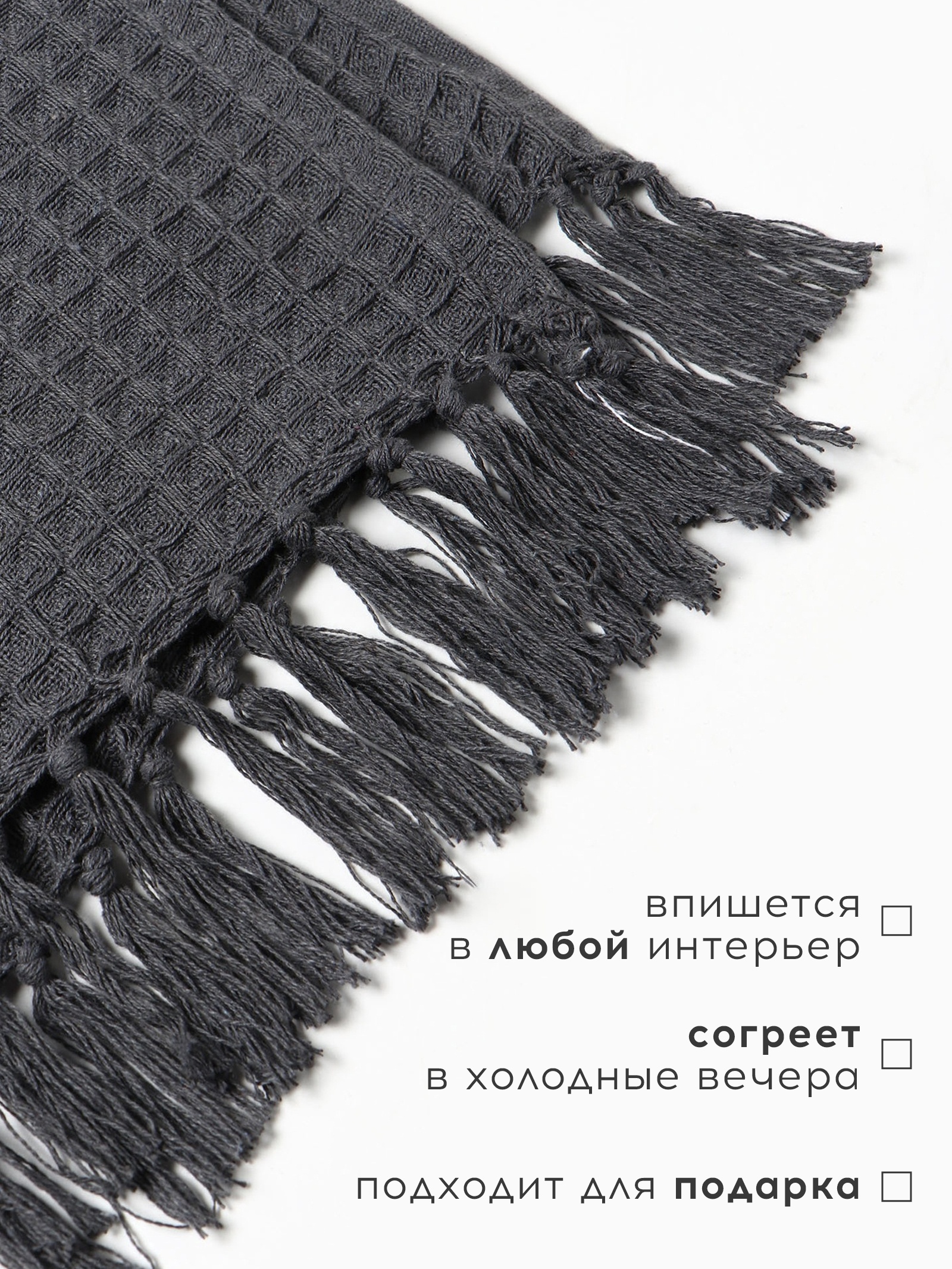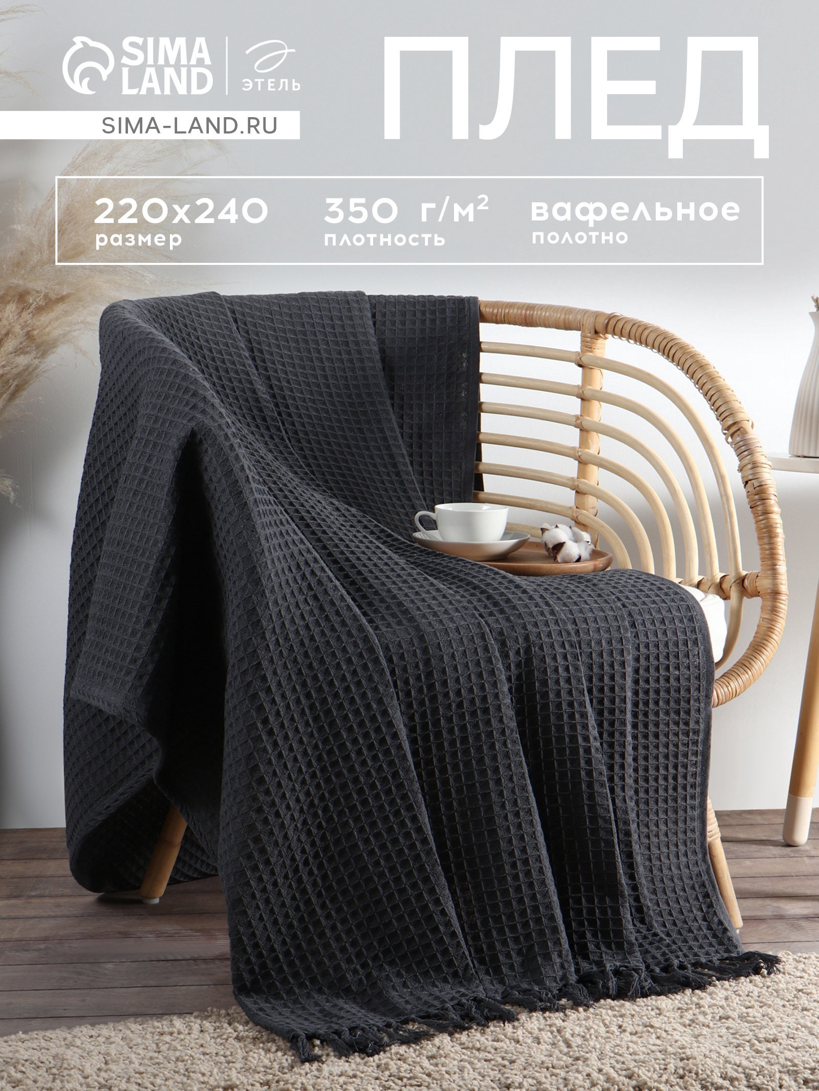 Плед вафельный «этель» 220 240 см, серый, хлопок 100%, 350 г