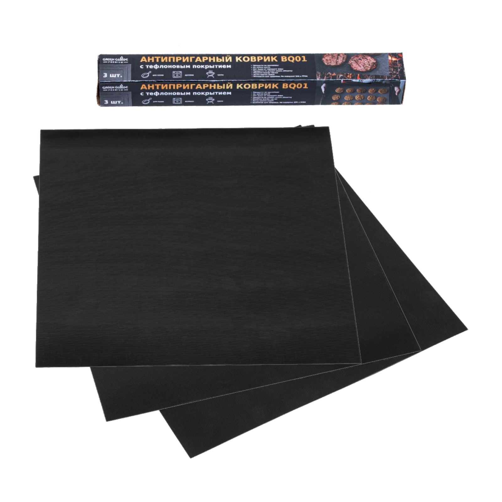Набор антипригарных ковриков для гриля green glade bq01, 3 шт. 30х30 см. Антипригарный коврик Green Glade для гриля-барбекю – идеальное решение для приготовления различных видов продуктов - мяса, овощей, гамбургеров, креветок, пиццы и множества других блюд, которые вы никогда не смогли бы приготовить на обычной решетке. Коврик позволяет сохранить сочность продукта за счет удержания маринада, а также не допустит пригорания пищи к решетке, вызванные попаданием стекающего жира. Коврик изготовлен из высокопрочного антипригарного материала и с двух сторон покрыт тефлоном, за счет чего тепло распределяется равномерно. Совместим с любым типом гриля - угольный, газовый, электрический и др. Вид: Коврик  развернуть описание ▼