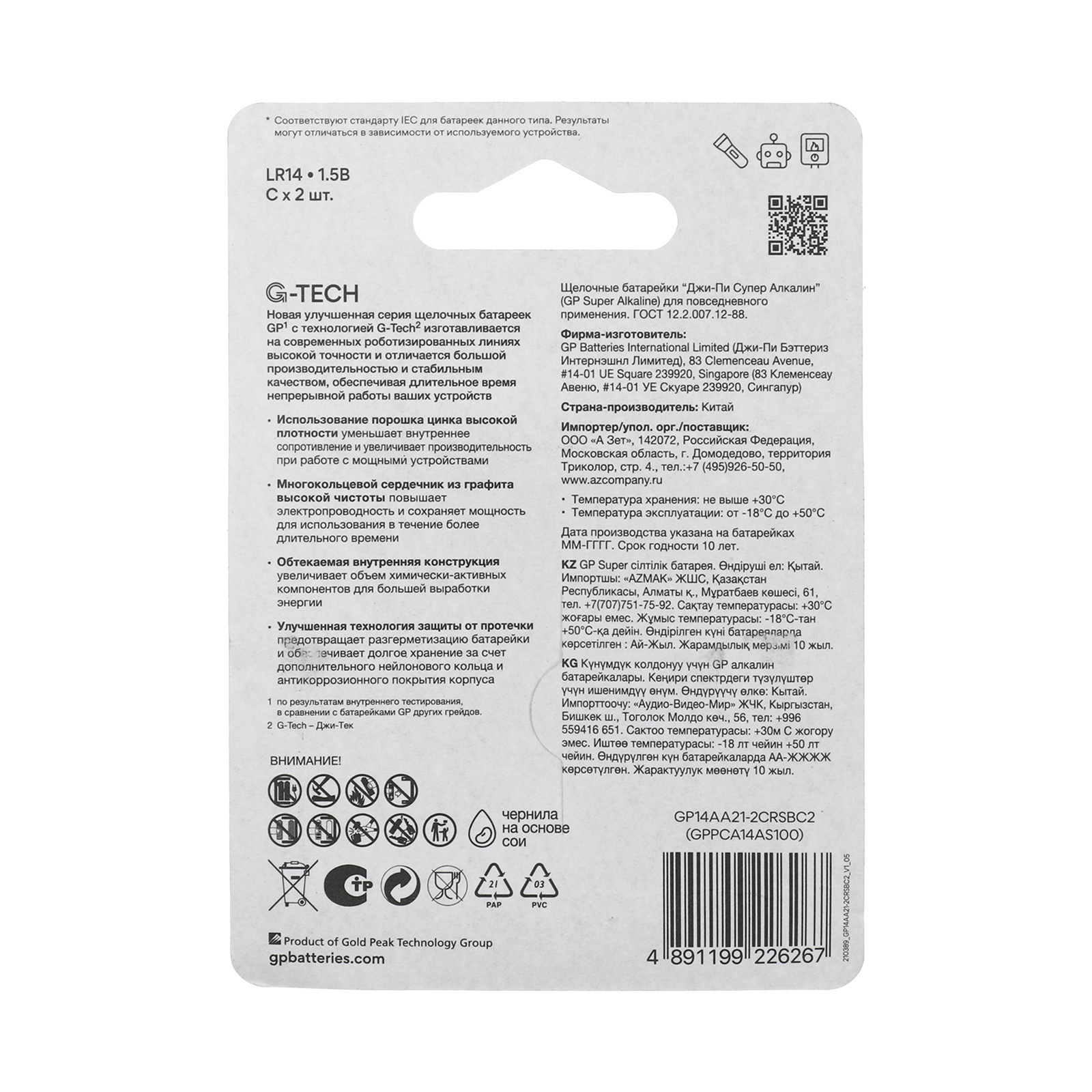 Батарейка алкалиновая Gp 14aa21-2crsbc2, C, Lr14-2bl, 1.5в, блистер, 2 шт.