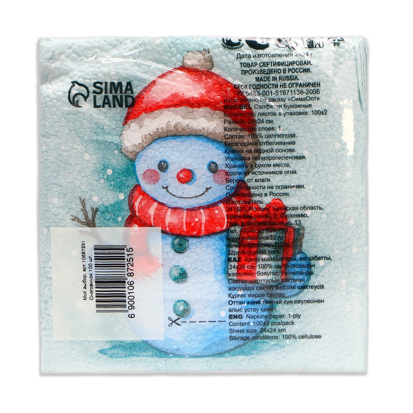 Новогодние салфетки бумажные мой выбор «снеговичок» 1 слой, 24х24 см, 100 шт