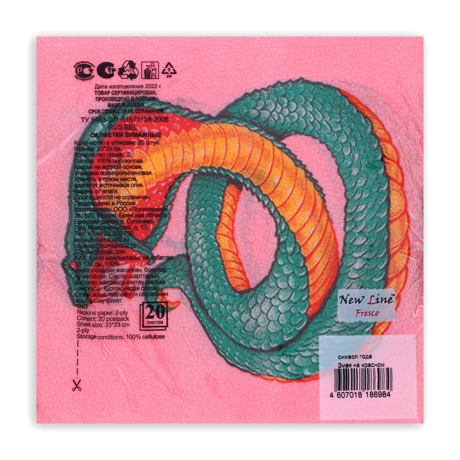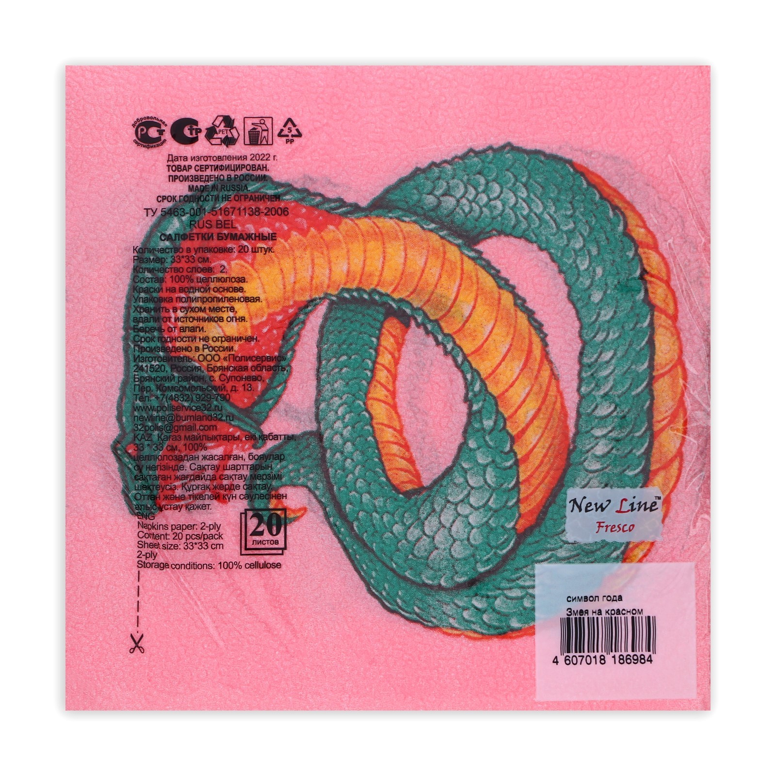 Салфетки бумажные new line fresco «змея на красном» 2 слоя, 33х33, 20 шт.. Салфетки станут отличным украшением праздничного стола. Изделия с ярким принтом добавят сервировке красочных ноток и дополнят антураж. Эта деталь придётся по душе всем гостям, которые непременно почувствуют праздничную и уютную атмосферу. Цвет: Разноцветный Размер, см: 33 х 33 parts count: 0 В наборе, шт.: 20 Тематика: Новогодняя Вид: С рисунком Температурное ограничение: Нет  развернуть описание ▼