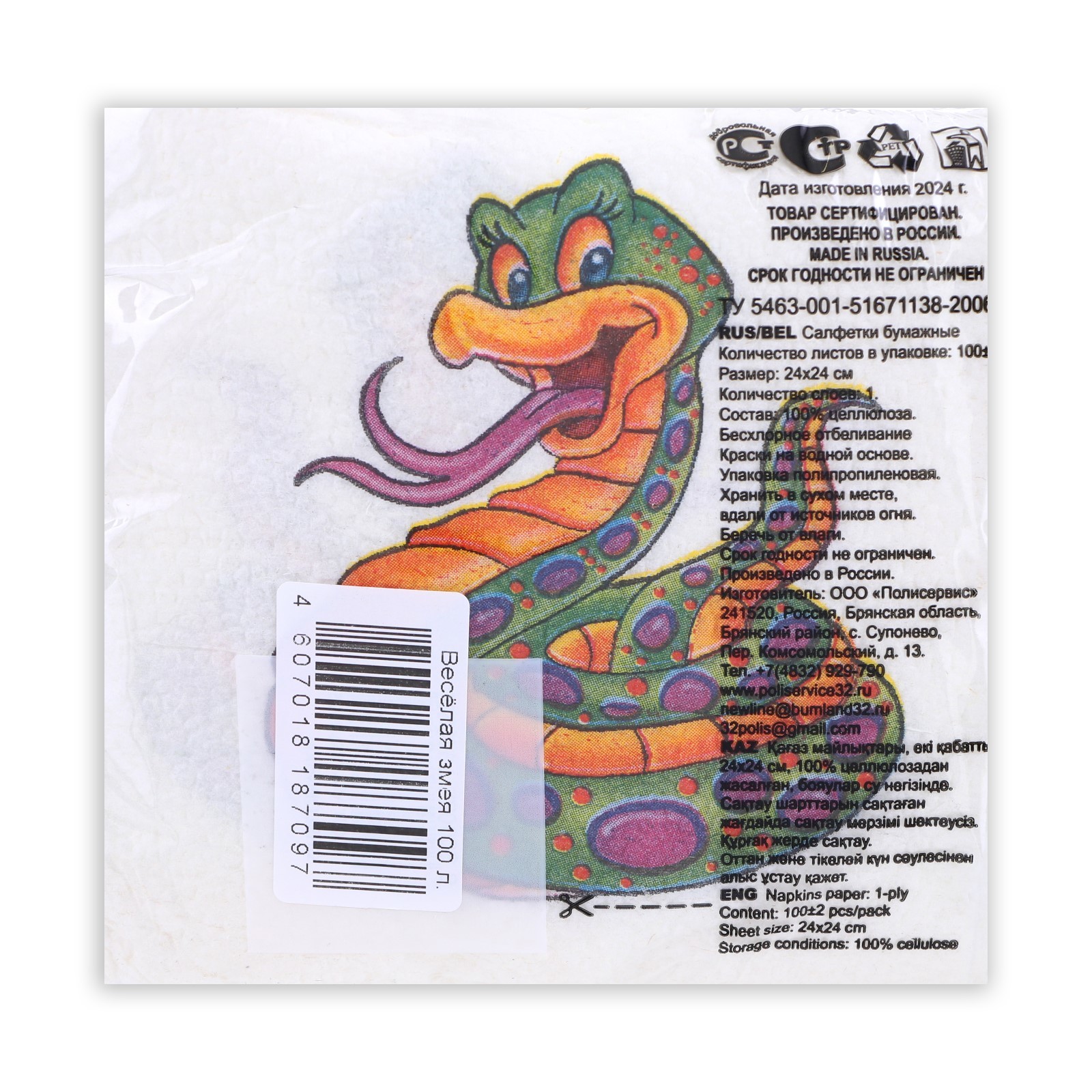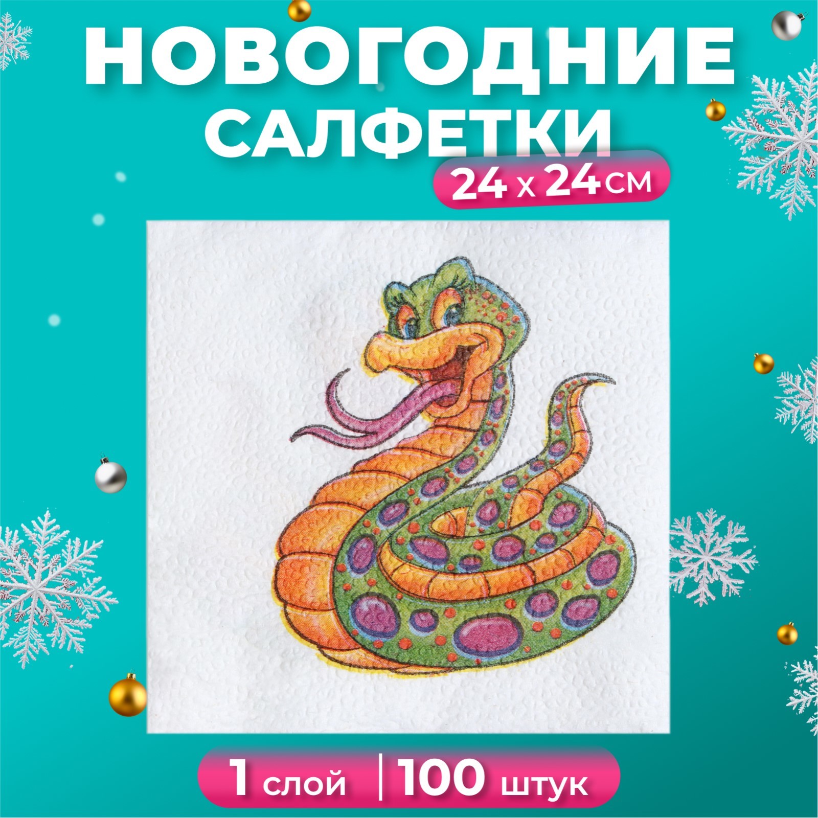 Салфетки бумажные гармония цвета «весёлая змея» 1 слой, 24х24, 100 шт.. Салфетки станут отличным украшением праздничного стола. Изделия с ярким принтом добавят сервировке красочных ноток и дополнят антураж. Эта деталь придётся по душе всем гостям, которые непременно почувствуют праздничную и уютную атмосферу. Цвет: Разноцветный Размер, см: 24 х 24 parts count: 0 В наборе, шт.: 100 Тематика: Новогодняя Вид: С рисунком Температурное ограничение: Нет  развернуть описание ▼