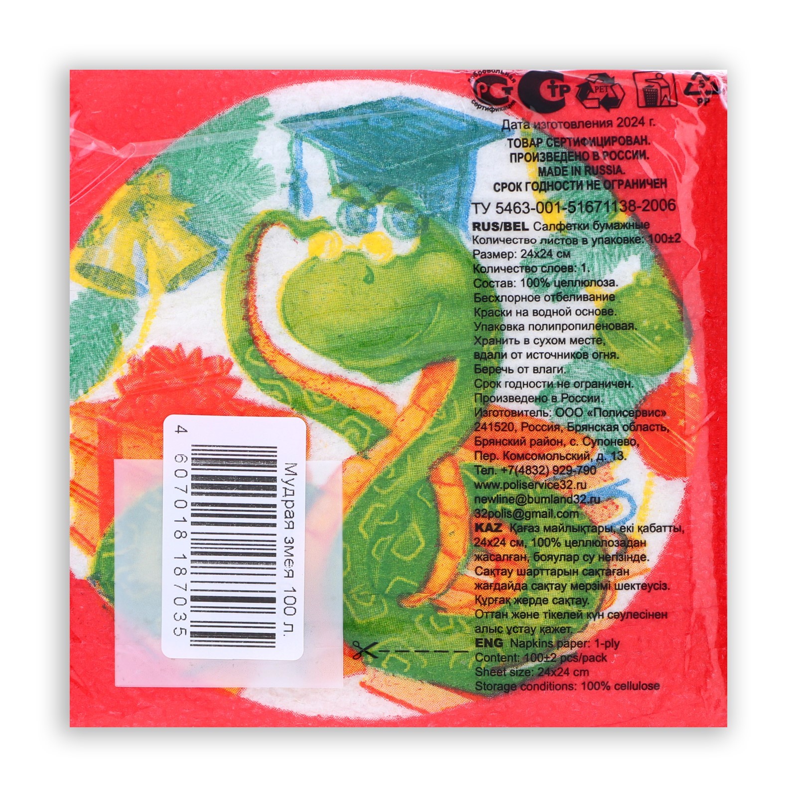 Салфетки бумажные гармония цвета «мудрая змея» 1 слой, 24х24, 100 шт.. Салфетки станут отличным украшением праздничного стола. Изделия с ярким принтом добавят сервировке красочных ноток и дополнят антураж. Эта деталь придётся по душе всем гостям, которые непременно почувствуют праздничную и уютную атмосферу. Цвет: Разноцветный Размер, см: 24 х 24 parts count: 0 В наборе, шт.: 100 Тематика: Новогодняя Вид: С рисунком Температурное ограничение: Нет  развернуть описание ▼