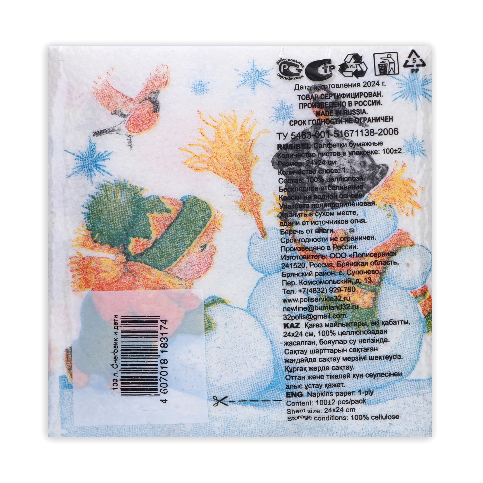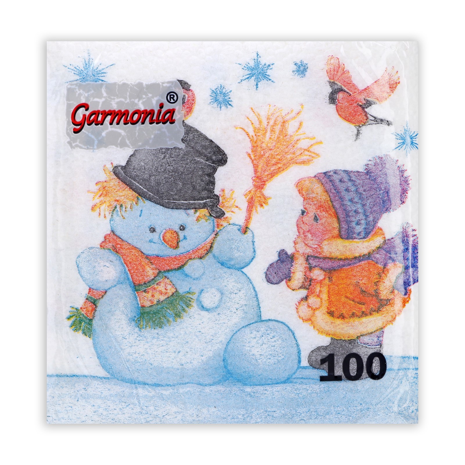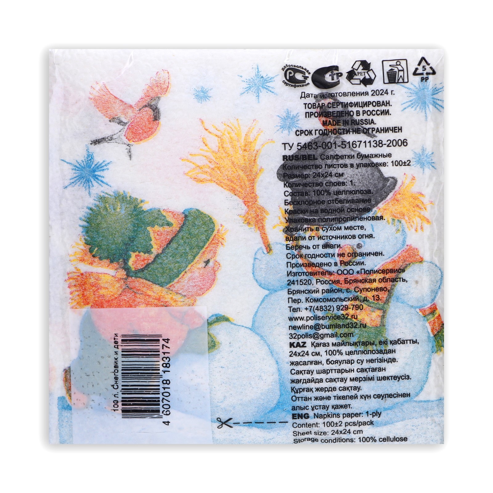 Салфетки бумажные гармония цвета «снеговик и дети» 1 слой, 24х24, 100 шт.. Салфетки станут отличным украшением праздничного стола. Изделия с ярким принтом добавят сервировке красочных ноток и дополнят антураж. Эта деталь придётся по душе всем гостям, которые непременно почувствуют праздничную и уютную атмосферу. Цвет: Разноцветный Размер, см: 24 х 24 parts count: 0 В наборе, шт.: 100 Тематика: Новогодняя Вид: С рисунком Температурное ограничение: Нет  развернуть описание ▼