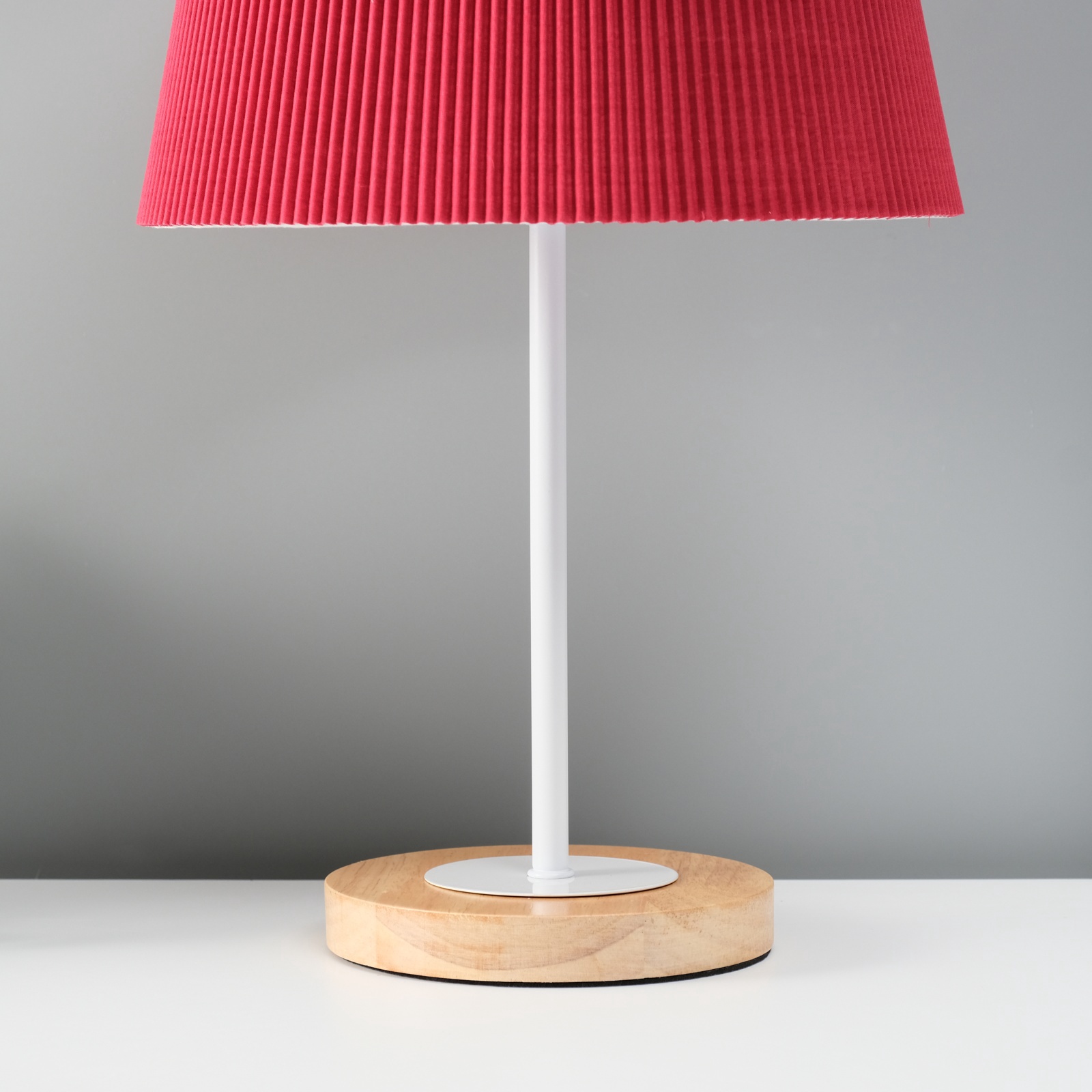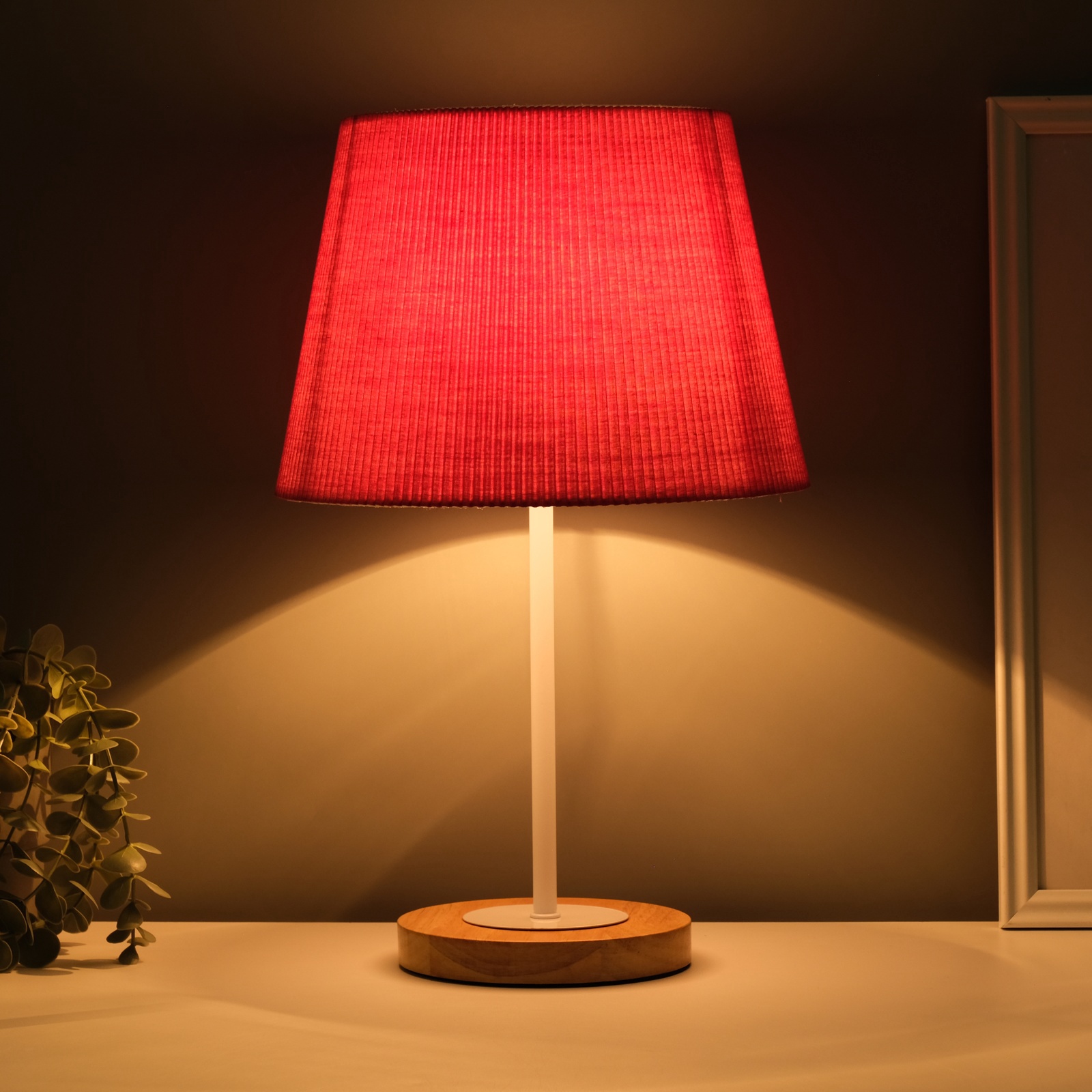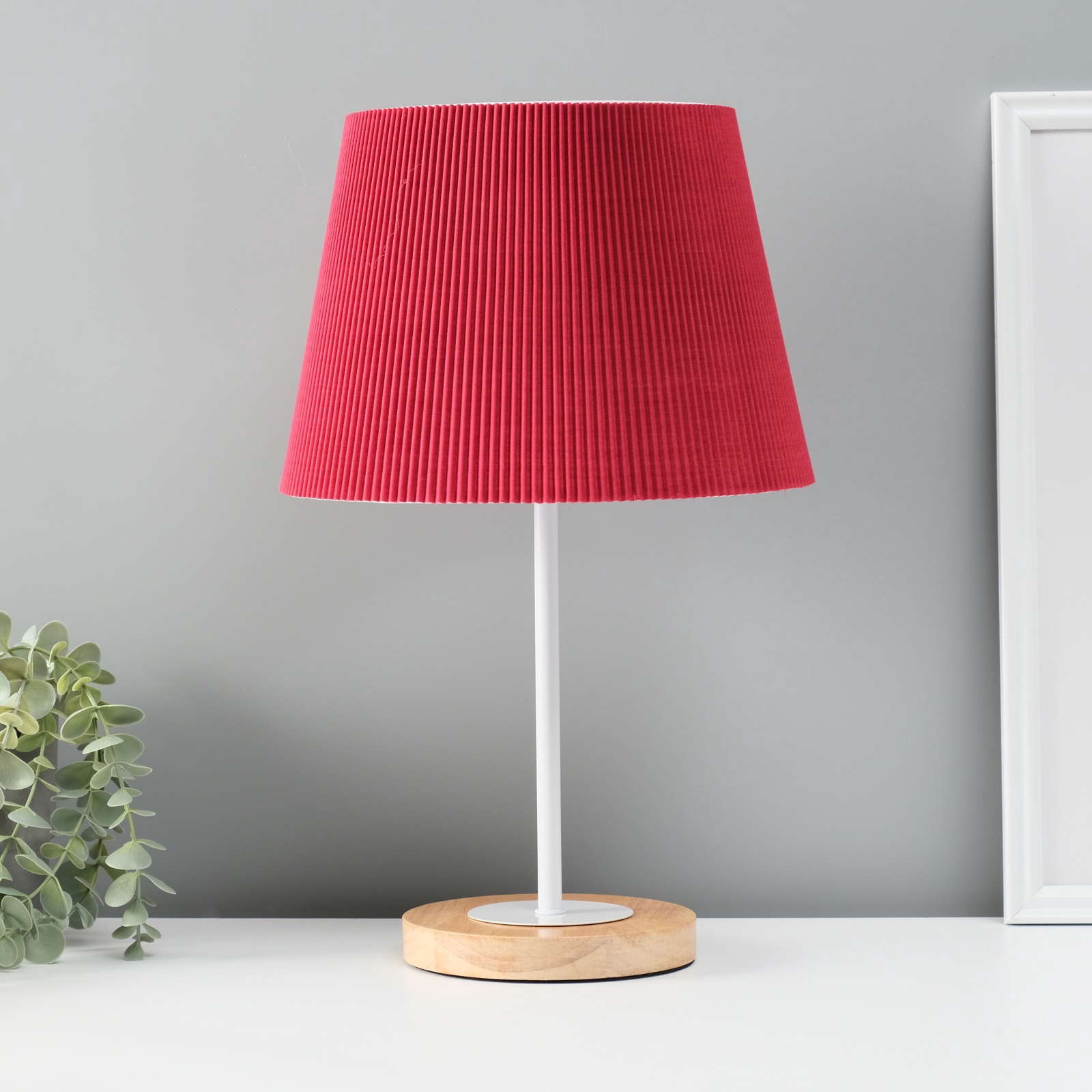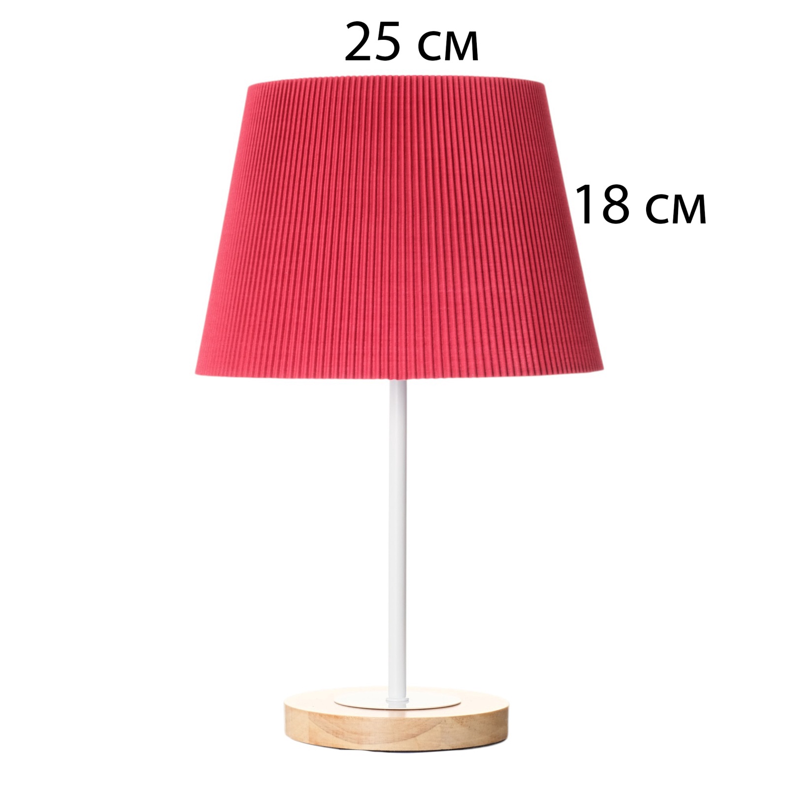 Светильник настольный «строгость» 1 40 вт е27 бордовый 22.5 22.5 41.5 см.   Эта настольная лампа с бордовым абажуром и стильным основанием станет отличным элементом вашего интерьера. Её лаконичный и современный дизайн добавит уют и комфорт в любое пространство. Особенности  Основание выполнено из металла и дерева, что придаёт изделию прочность и элегантность. Трапециевидный абажур из текстиля и пластика обеспечивает мягкое освещение, направленное вверх. Совместима с лампами E27 мощностью до 40 Вт, что позволяет выбрать источник света по вашему вкусу. Управление осуществляется через выключатель на проводе, что делает использование простым и удобным. Компактные размеры (22,5 см x 22,5 см x 41,5 см) позволяют легко разместить лампу на столе или тумбочке. Создайте атмосферу уюта Эта лампа не только освещает, но и служит стильным акцентом в вашем доме. Она идеально подходит для чтения, работы или отдыха, создавая спокойную и гармоничную обстановку. Выберите её, чтобы сделать ваше пространство более привлекательным и уютным. Вид лампы:Накаливания|Количество ламп:1|Цоколь:E27|Длина, см:22.5|Ширина, см:22.5|Высота, см:41.5|Гарантийный срок, мес.:24|Мощность на цоколь, Вт:40|Материал основания:Дерево|Материал основания:Металл|Цвет основания:Бежевый|Цвет основания:Белый|Тип рассеивателя:Абажур|Особенности светильника:Без особенностей|Оттенок рассеивателя:Цветные|Материал рассеивателя:Текстиль|Материал рассеивателя:Пластик|Управление светильником:С выключателем на проводе|Форма рассеивателя:Трапеция|Направление рассеивателя:Вверх|Цвет рассеивателя:Бордовый|Тип питания:От сети 220 В|Тип источника освещения:Лампа не в комплекте|Страна:Китай  развернуть описание ▼