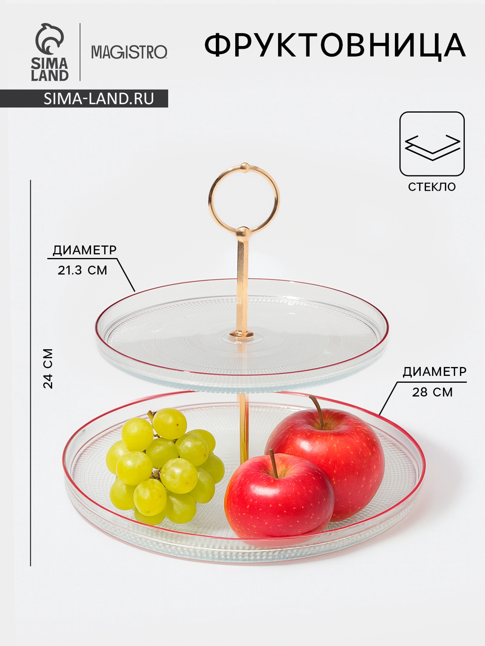 Блюдо 2-х ярусное magistro radiant, 24 28 см, стекло, прозрачное. Двухъярусное блюдо из прозрачного стекла — практичное решение для подачи угощений на празднике или в повседневном меню. Его стильная форма и рельефная текстура делают блюдо универсальным элементом сервировки: от домашних чаепитий до торжественных застолий. Особенности: Два яруса: позволяют разместить разные виды закусок — сверху легкие десерты, снизу — более плотные блюда. Такая подача экономит место на столе и сохраняет порядок.Визуал и фактура: прозрачное стекло не перегружает интерьер стола, визуально «открывая» содержимое. Рельефная поверхность добавляет благородства, не нарушая общей лаконичности.Круглая форма: диаметр нижнего яруса — 28 см, верхнего — 21,3 см. Такие габариты обеспечивают устойчивость конструкции и вместительность, не занимая лишнего места.Качественный материал: стекло придаёт изделию весомость и статусность. Оно хорошо подчёркивает качество угощений, будто выставляя их в витрине.Уход: не подходит для мытья в посудомоечной машине — за ним нужно ухаживать вручную, чтобы сохранить внешний вид и целостность стекла.Подходит для подачи фруктов, пирожных, сыров, канапе — всего, что хочется показать с лучшей стороны. Двухъярусное стеклянное блюдо — не просто посуда, а инструмент для красивой, продуманной сервировки без лишних усилий. Набор:Нет|Цвет:Прозрачный|Диаметр, см:21.3|Диаметр, см:28|Количество ярусов:2|Рисунок:Нет|Материал:Стекло|Можно мыть в посудомоечной машине:Нет|Текстура:С рельефом|Особенности:Без особенностей|Страна:Турция  развернуть описание ▼