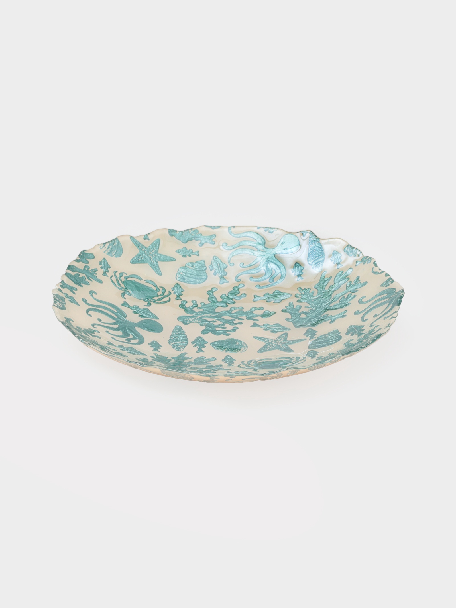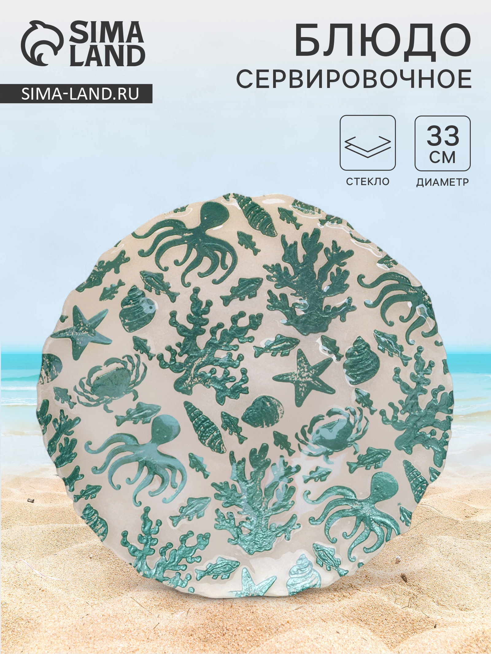 Блюдо для подачи «дельмар. морской мир», d=33 см, стекло, бирюзовое. Это блюдо станет отличным изысканным дополнением к вашему столу, подчеркивая ваш вкус и стиль. Этот элемент сервировки не только украсит ваш интерьер, но и создаст атмосферу морского побережья благодаря своему уникальному дизайну. Блюдо диаметром 33 см идеально подходит для подачи салатов, закусок и морепродуктов. Его бирюзовый цвет и морская тематика добавят нотку свежести и элегантности вашему столу. Особенности: эстетичный дизайн: бирюзовый цвет на молочном оттенке и морская тематика создают уникальную атмосферу на вашем столе. прочность и долговечность: изготовлено из качественного стекла, которое выдерживает интенсивное использование. универсальность: подходит для подачи различных блюд, от салатов до морепродуктов. лёгкость в уходе: блюдо легко мыть вручную, что сохраняет его первоначальный вид на долгие годы. идеальный размер: диаметр 33 см делает его удобным для использования как в домашних условиях, так и на праздниках. Цвет: Бирюзовый Цвет: Белый Диаметр, см: 33 parts count: 0 Тематика: Морская тематика Материал: Стекло Вид тарелки: Плоская Можно мыть в посудомоечной машине: Нет Можно использовать в СВЧ-печи: Нет Текстура: С рельефом Особенности: Без особенностей Для горячего: Нет Форма: Круг  развернуть описание ▼
