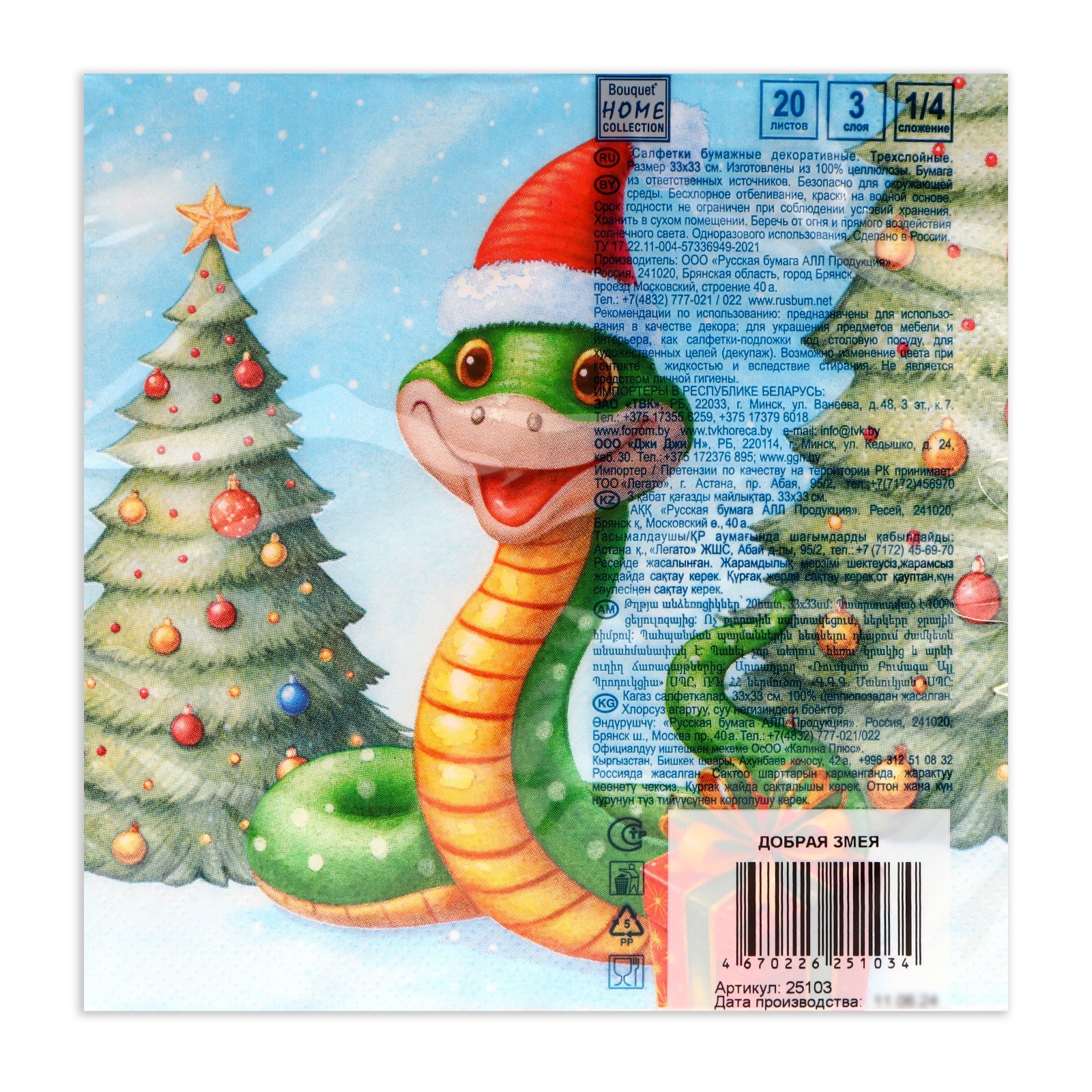 Новогодние салфетки бумажные Home Collection сlassic «добрая змея», 3 слоя, 33х33 см, 20 шт