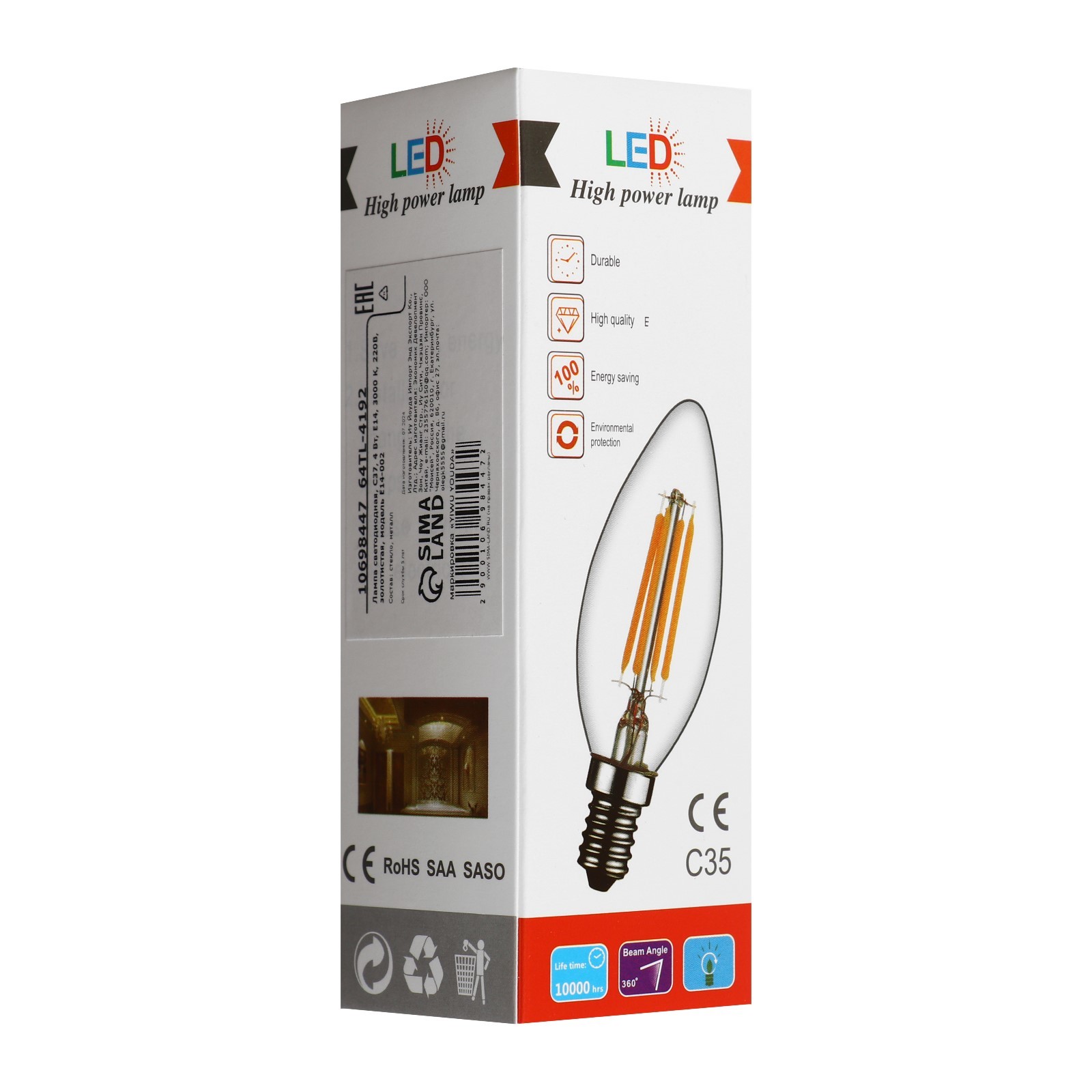 Лампа светодиодная, c37, 4 вт, e14, 3000 к, 220 в, золотистая. Цвет свечения: Тёплый белый Цоколь: E14 Мощность, Вт: 4 Напряжение, В: 220 Цветовая температура: 3000К Форма лампы: Свеча Класс энергоэффективности: A  развернуть описание ▼