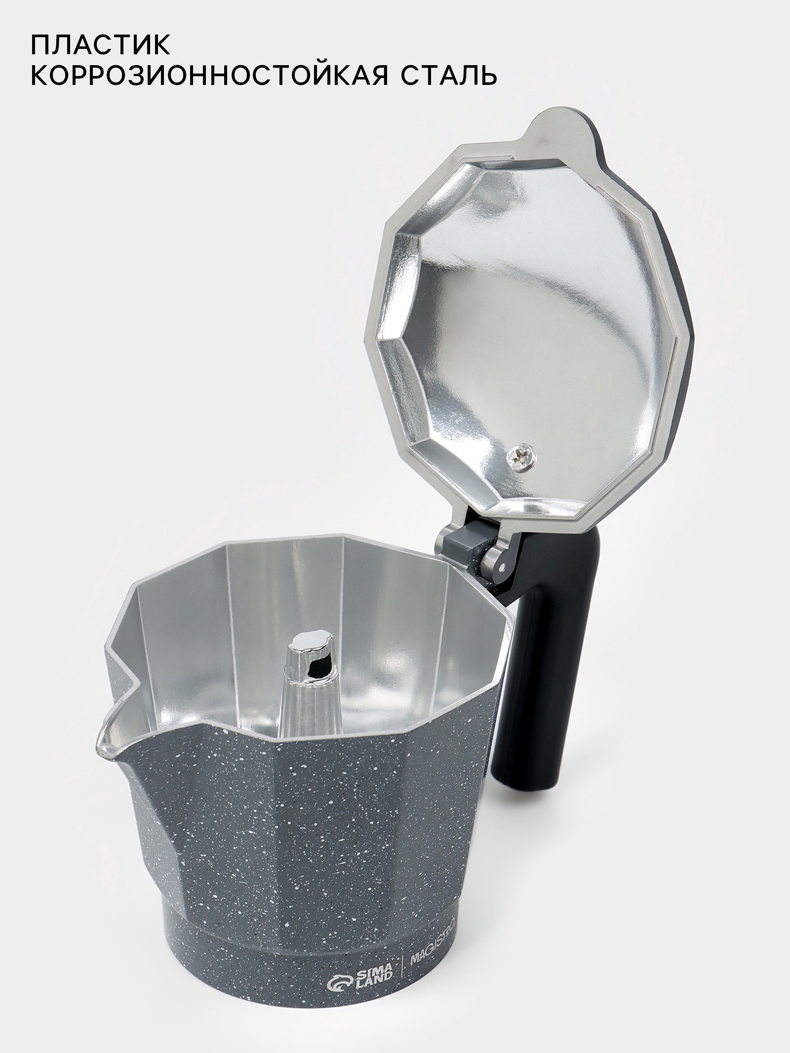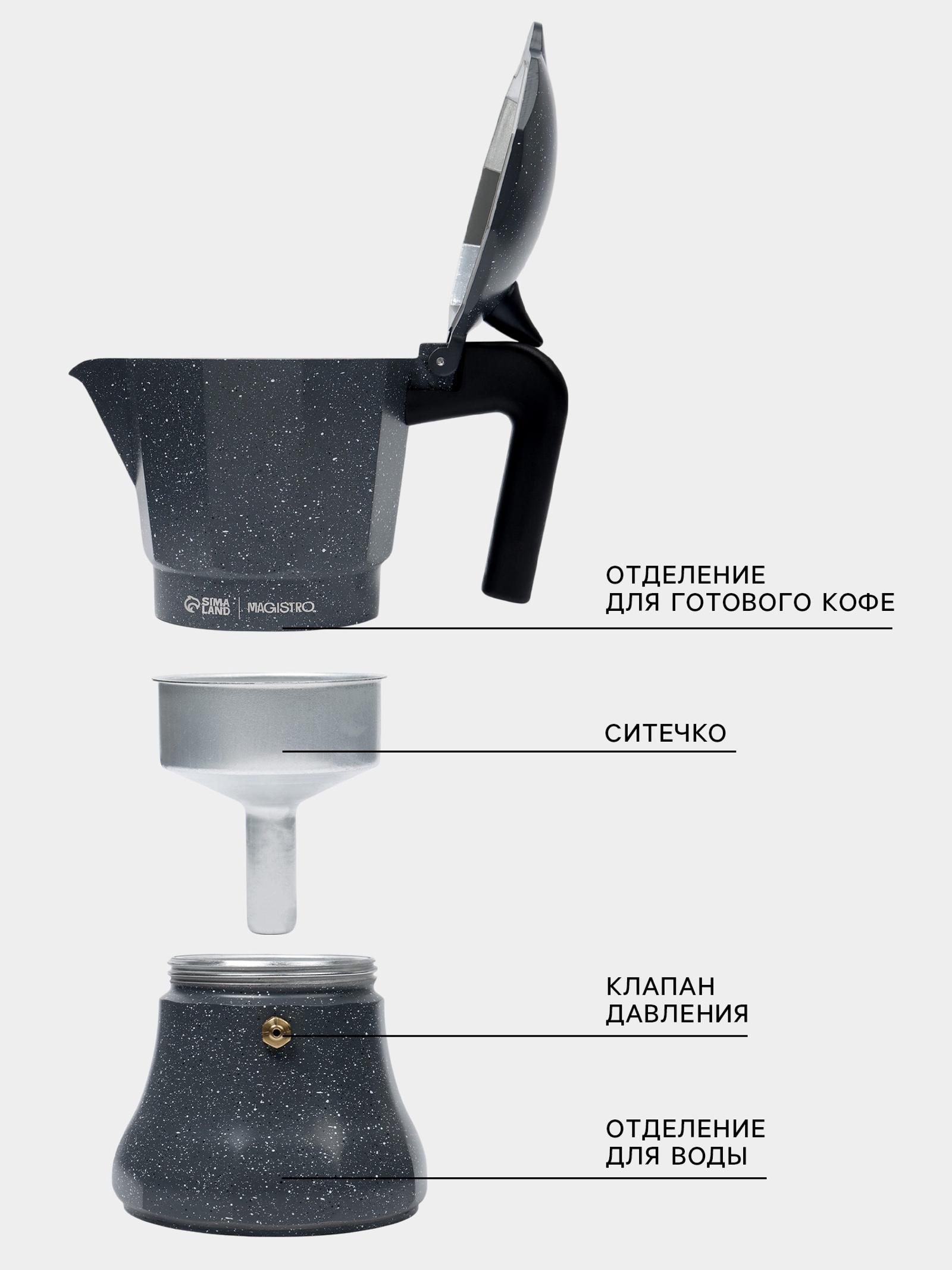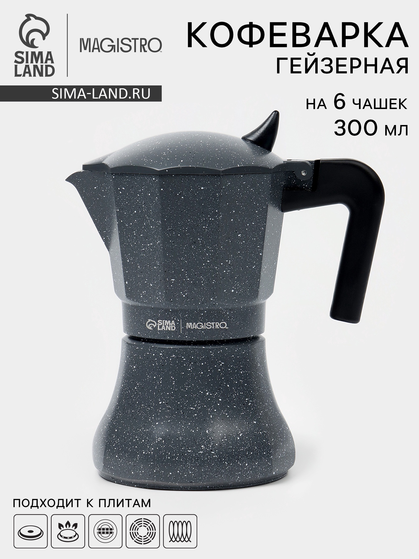 Кофеварка гейзерная magistro «мрамор», 300 мл, на 6 чашек, нержавеющая сталь, чёрная. Гейзерная Кофеварка Мрамор Насладитесь насыщенным вкусом любимого кофе с этой стильной гейзерной кофеваркой, рассчитанной на 6 чашек. Элегантный серый цвет с мраморным эффектом прекрасно дополнит интерьер вашей кухни. Изготовлена из нержавеющей стали, она гарантирует долговечность и превосходный вкус каждой сваренной порции. Идеальна для семейных завтраков и встреч с друзьями. Преимущества Кофеварки Приготовление 6 чашек кофе за один раз, что удобно для большой семьи или компании.Изготовлена из высококачественной нержавеющей стали для долговечности и надежности.Подходит для всех типов плит, включая индукционные.Элегантный дизайн с мраморным эффектом.Простота в использовании и обслуживании.Кофе для Всех: Просто и Вкусно Эта гейзерная кофеварка – это ваш надежный спутник в приготовлении ароматного и бодрящего кофе для большой компании. Порадуйте себя и своих близких насыщенным вкусом и неповторимым ароматом! Выбирайте стиль, практичность и наслаждение каждой чашкой! Цвет:Серый|Количество чашек:6|Объём, мл:300|Материал:Нержавеющая сталь|Тип плиты:Для электрической плиты|Тип плиты:Для газовой плиты|Тип плиты:Для галогенной плиты|Тип плиты:Для индукционной плиты|Тип плиты:Для стеклокерамической плиты|Страна:Китай  развернуть описание ▼