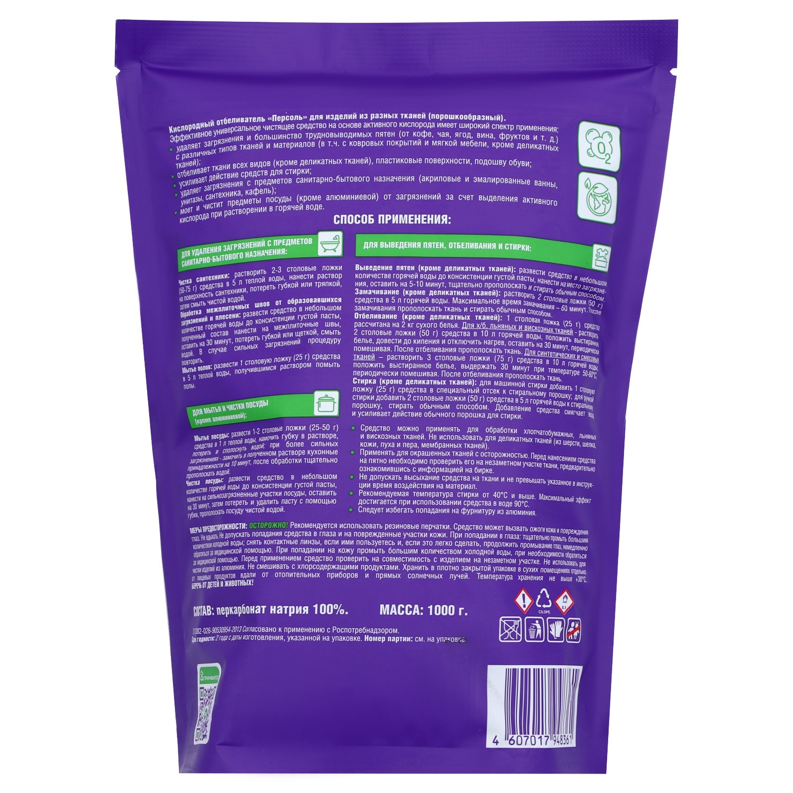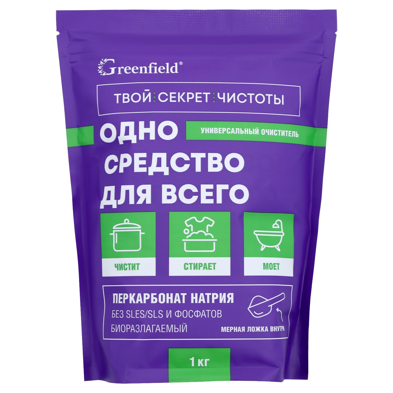 Универсальный очиститель greenfield, 1 кг. Универсальный кислородный отбеливатель "Одно средство от всего" Greenfield 1 кг с экологичным составом для стирки белых, черных и цветных вещей. 100% перкарбоната натрия! Для удаления застарелых и трудновыводимых загрязнений, включая пятна жира, чая, кофе, травы, крови, вина, ягод и фруктов. Пятновыводитель для отбеливания белья, придания яркости тканям, устранения запах пота и разводов от дезодоранта. Супер сильный, он подходит и для чистки посуды, столовых приборов из золота и серебра, мытье унитаза от желтого камня, а ванны от грибка, плесени и налета. Грязи с кафеля, нержавеющей стали, стеклокерамики, пластика и различных поверхностей. Экологический выводитель хорошо работает при высоких температурах, так как происходит расщепление жирных следов, осветления желтизны, серости. Представлен бесфосфатный моющий экоочиститель в виде гранул, поэтому порошок без отдушек, агрессивного хлора, обладает антибактериальным эффектом и будет идеальным для отстирывания детских и для новорожденных. Ручной и машинной работы. Многофункциональный хозяйственный био товар не только прекрасно отбеливает воротники, рукава и носки, но является eco помощником для свежести обуви, уборки кухни, ванной и всего дома. Отбеливающая и очищающая бывая химия не рекомендуется использовать для микрофибры, вискозы, шерсти и шелка. При взаимодействии с горячей водой более 60 C выделяется активный кислород, который и способствует уничтожению нечистоты Вес, г: 1000 Температурное ограничение: Нет  развернуть описание ▼