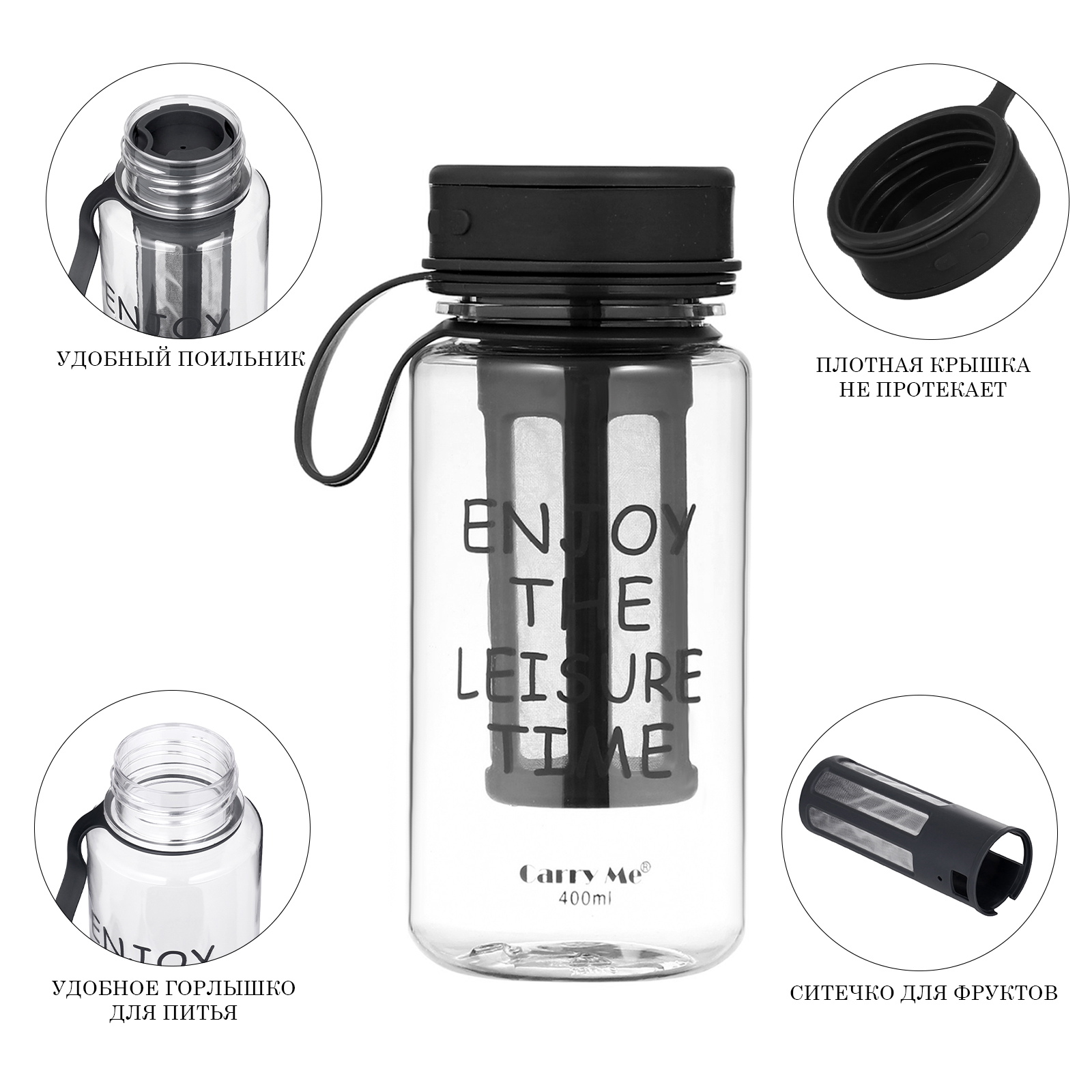 Бутылка для воды, 450 мл, с ситечком, 17.5 х 10.5 см, черная. Стильная и функциональная бутылка для воды станет незаменимым спутником для людей, ведущих активный образ жизни, для любителей спорта, туризма, пеших прогулок. Спортивная бутылка имеет лаконичный дизайн, совмещенный с удобством использования. Такая бутылка для воды подойдет в школу и на секции, для занятий физкультурой и прогулок с друзьями. Изделие выполнено из пищевого пластика и предназначено для употребления воды, соков и других напитков. Рекомендации Не мыть в посудомоечной машине. Плотно закрывать крышку. Цвет: Чёрный Объём, мл: 450 Материал: Пластик Вид: Бутылка Особенности: С ситом Особенности: На подвесе  развернуть описание ▼