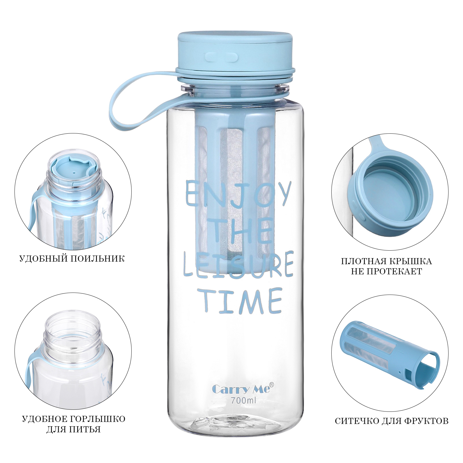Бутылка для воды, 800 мл, 22 х 10.5 см, с ситом, синяя. Бутылка для воды — это удобный и практичный аксессуар, предназначенный для хранения и переноски жидкости. Она изготовлена из качественного и безопасного пищевого пластика. Бутылка оснащена крышкой, которая обеспечивает герметичность и предотвращает протекание. Благодаря своей компактности и лёгкости, она идеально подходит для использования в повседневной жизни, особенно во время занятий спортом или активного отдыха. Цвет: Синий Объём, мл: 800 Материал: Пластик Вид: Бутылка Особенности: На подвесе Особенности: С ситом  развернуть описание ▼