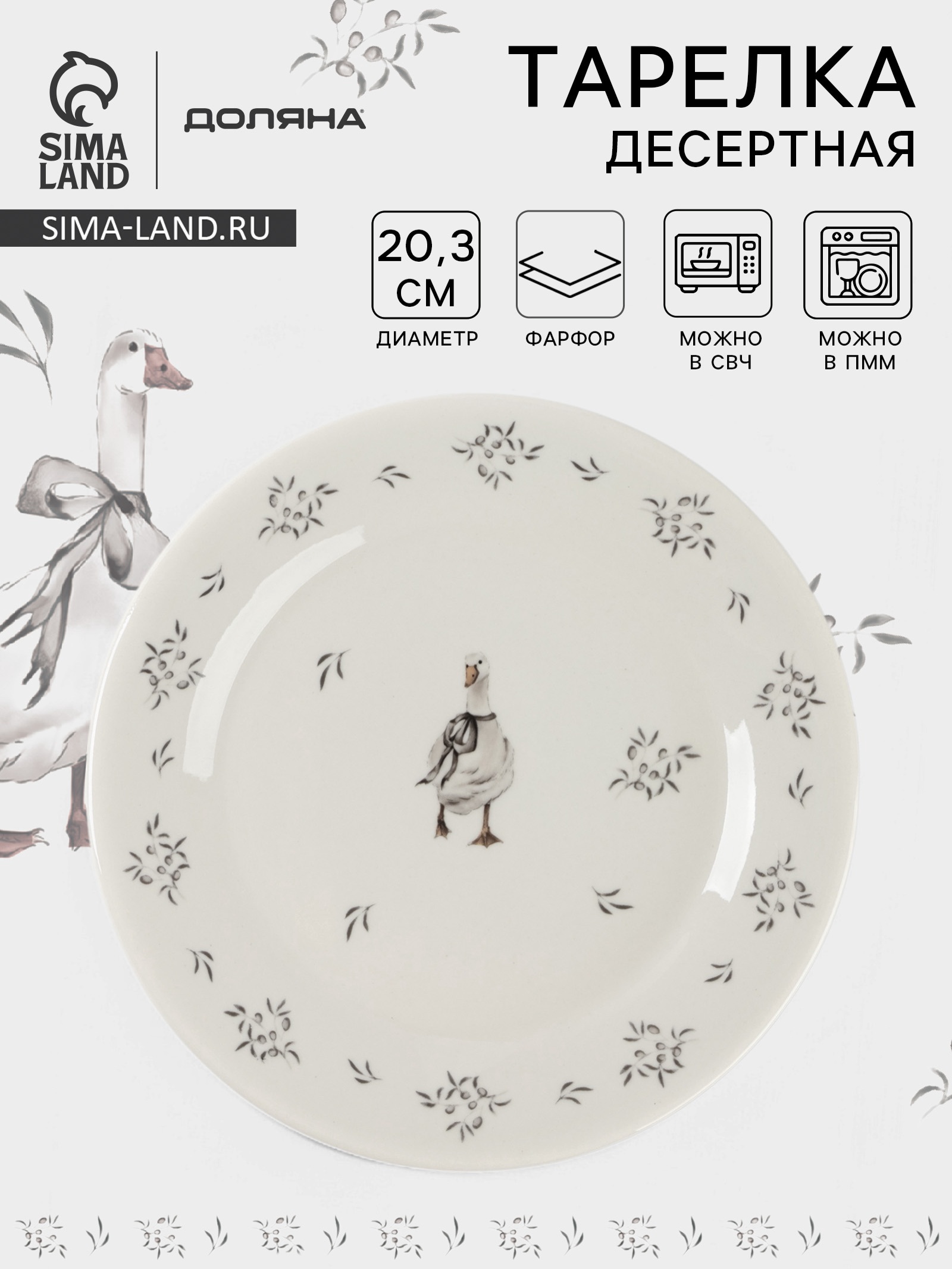 Тарелка десертная Доляна «Гуси», d=20. 3 см, фарфор, белаяОчаровательная десертная тарелка из тонкого костяного фарфора с милым декором «Гуси». Диаметр 20. 3 см. Идеальна для подачи десертов, фруктов и создания уютной атмосферы за столом. Насладитесь вкусными десертами в компании очаровательных гусей!Эта десертная тарелка станет прекрасным дополнением к вашей коллекции посуды. Белая фарфоровая тарелка с рисунком привнесет в ваш дом атмосферу тепла и деревенского шарма. Тарелка «Гуси» Доляна станет прекрасным подарком для любителей уютных мелочей. ОсобенностиМатериал - костяной фарфор: Легкий, прочный и изысканный материал, отличающийся особой белизной. Белый цвет: Универсальный и элегантный, подходит для любого интерьера. Диаметр 20. 3 см: Оптимальный размер для порционных десертов. Декор «Гуси»: Милый и трогательный, создает атмосферу уюта и тепла. Предназначена для горячего: Подходит для подачи горячих десертов. Превратите каждый десерт в маленький праздник!Эта тарелка – это не просто посуда, а способ создать особую атмосферу за столом и порадовать себя и своих близких красивыми и функциональными вещами. Позвольте себе наслаждаться каждым приемом пищи, используя качественную и красивую посуду. Больше наших товаров для Вас.