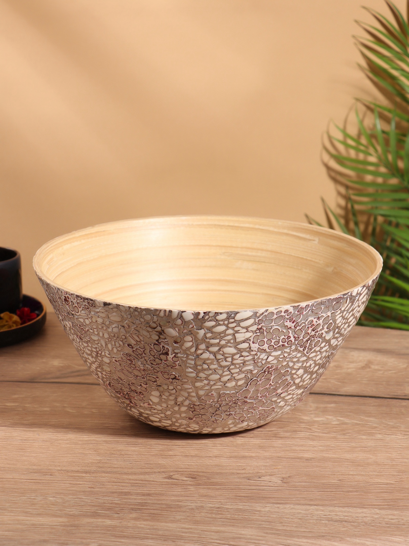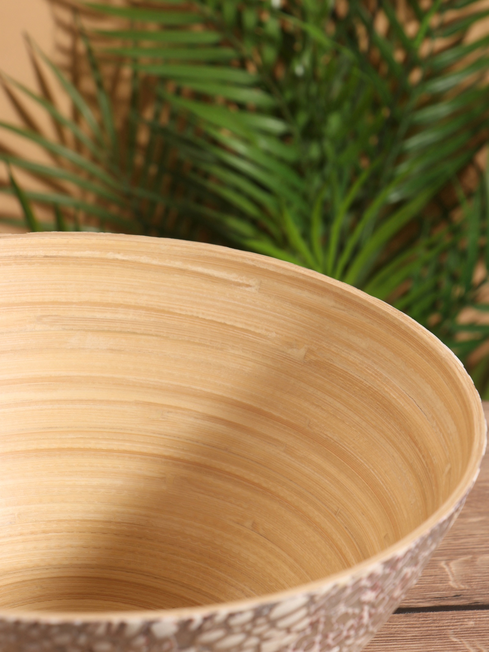 Салатник диаметром 29 см из бамбука станет элегантным решением для обеденного стола или праздничного мероприятия. Его изысканная серебристо-бело-красная расцветка с узорами подчеркнёт любое блюдо. Искусная ручная работа делает каждый экземпляр уникальным. Салатник подходит для горячих блюд, но не предназначен для микроволновки и посудомоечной машины. Гладкая текстура и необычная трапециевидная форма делают его настоящим произведением искусства.