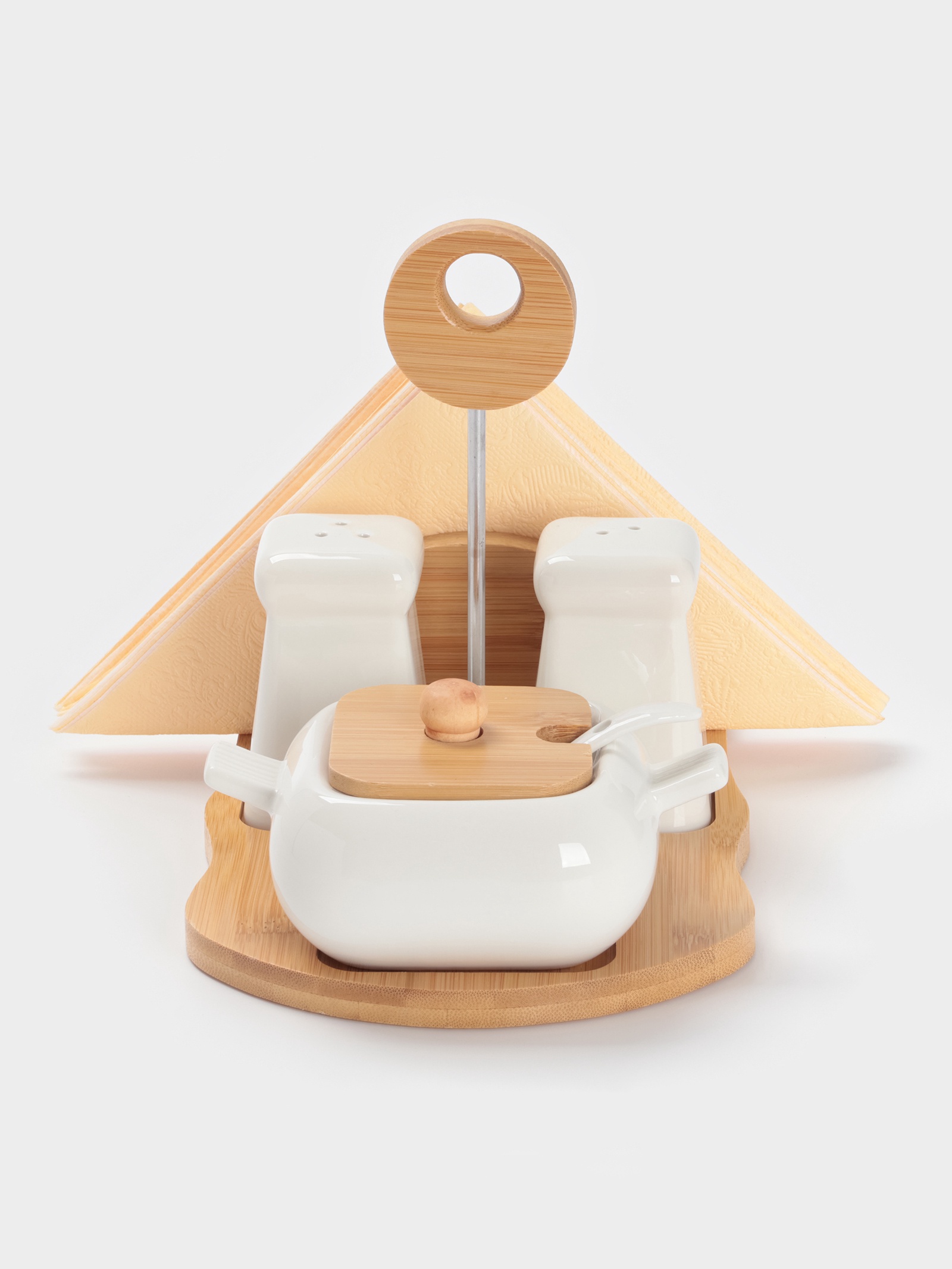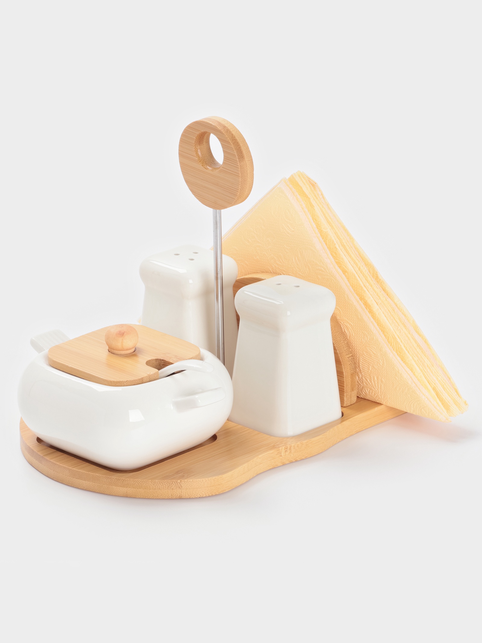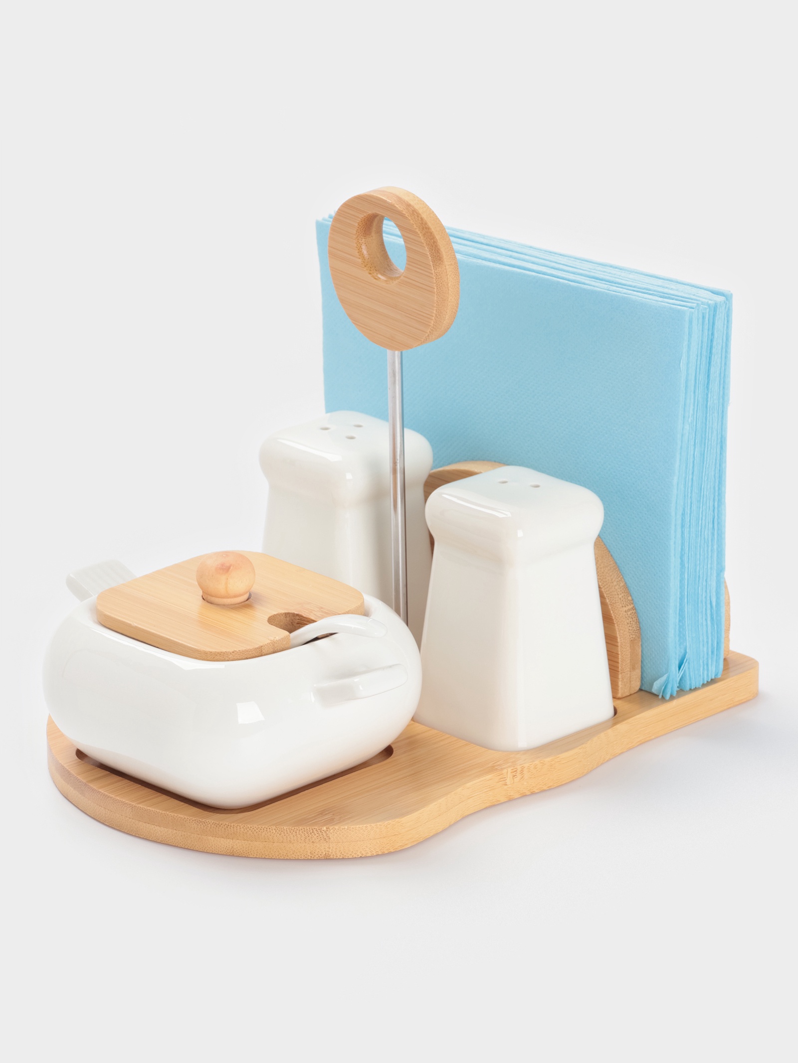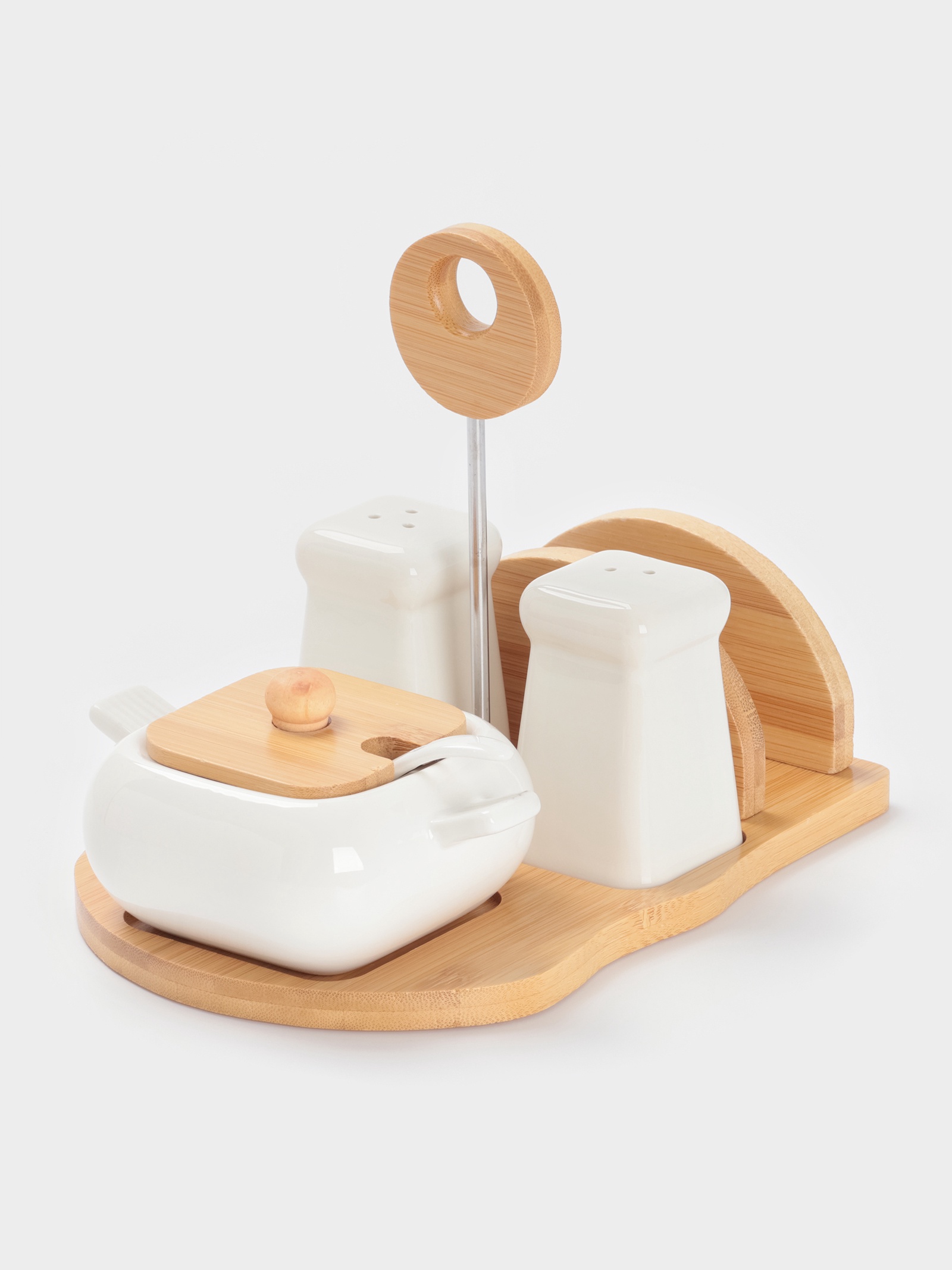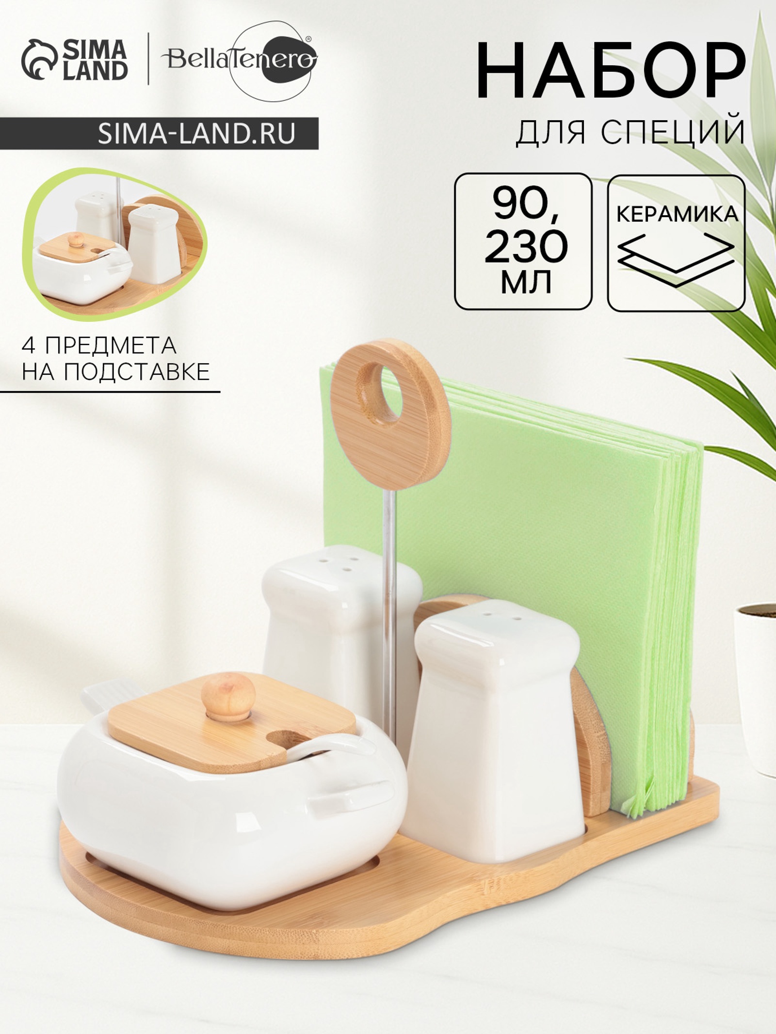 Набор для специй bellatenero «сиена», 4 предмета, на подставке, керамика, белый. Белый Керамический Набор для Сервировки Стола Придайте элегантность и завершенность сервировке стола с этим набором. Включает салфетницу, солонку, перечницу и сахарницу с ложкой. Белый цвет и изысканный дизайн делают этот набор универсальным дополнением для любого интерьера, создавая атмосферу уюта и гостеприимства. Создайте идеальную обстановку для ваших трапез. Преимущества В комплект входят: салфетница, солонка, перечница, а также сахарница с ложкой.Изготовлен из качественной керамики.Набор содержит все необходимое для сервировки стола.Создает единый стиль и гармонию на вашем столе.Белый цвет идеально впишется в любой интерьер.Идеальная Сервировка - Залог Приятной Трапезы Этот набор для сервировки – это не просто практичные предметы, а стильный способ создать атмосферу уюта и сделать прием пищи еще приятнее. Радуйте себя и своих гостей изысканной сервировкой! Выбирайте стиль, качество и функциональность! Набор:Да|Цвет:Белый|В наборе, шт.:4|Объём, мл:90|Объём, мл:230|Тематика:Однотонная|Рисунок:Нет|Материал:Керамика|Можно мыть в посудомоечной машине:Нет|Страна:Китай  развернуть описание ▼
