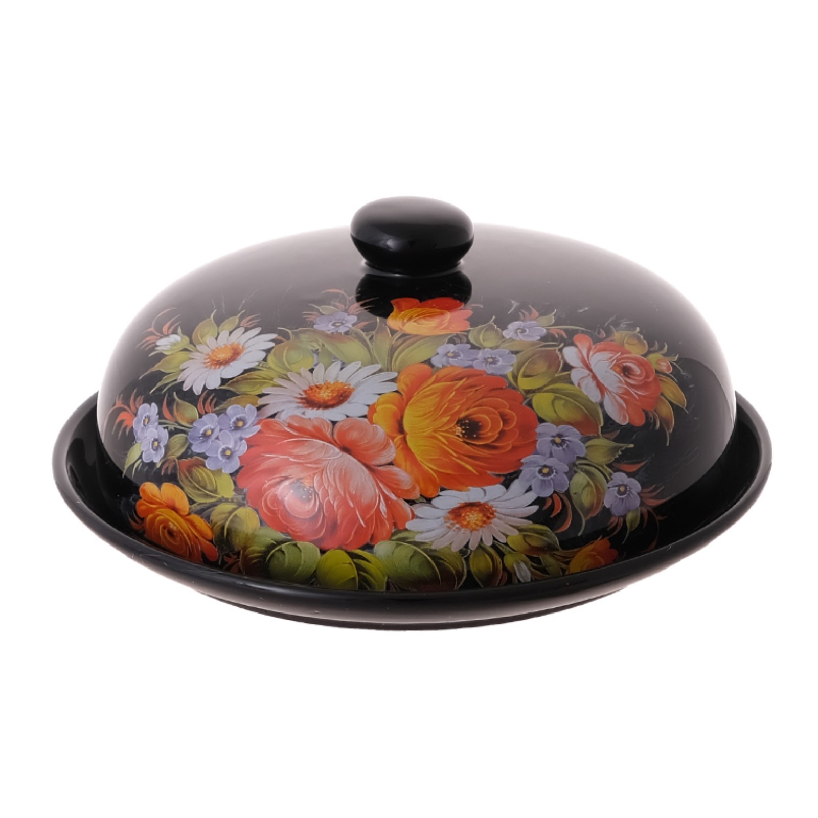 Блюдо для блинов с крышкой repast «жостов», керамика, размер 23х23х9.7 см. Цвет: Чёрный Форма: Круглая Диаметр, см: 23 В наборе, шт.: 2 Тематика: Цветочно-растительная Материал: Керамика Можно мыть в посудомоечной машине: Нет Можно использовать в СВЧ-печи: Нет Особенности: Деколь Особенности: Без особенностей Матовая поверхность: Нет Серия: Жостов Серия: Repast Жостов Форма: Круг, шар, цилиндр  развернуть описание ▼