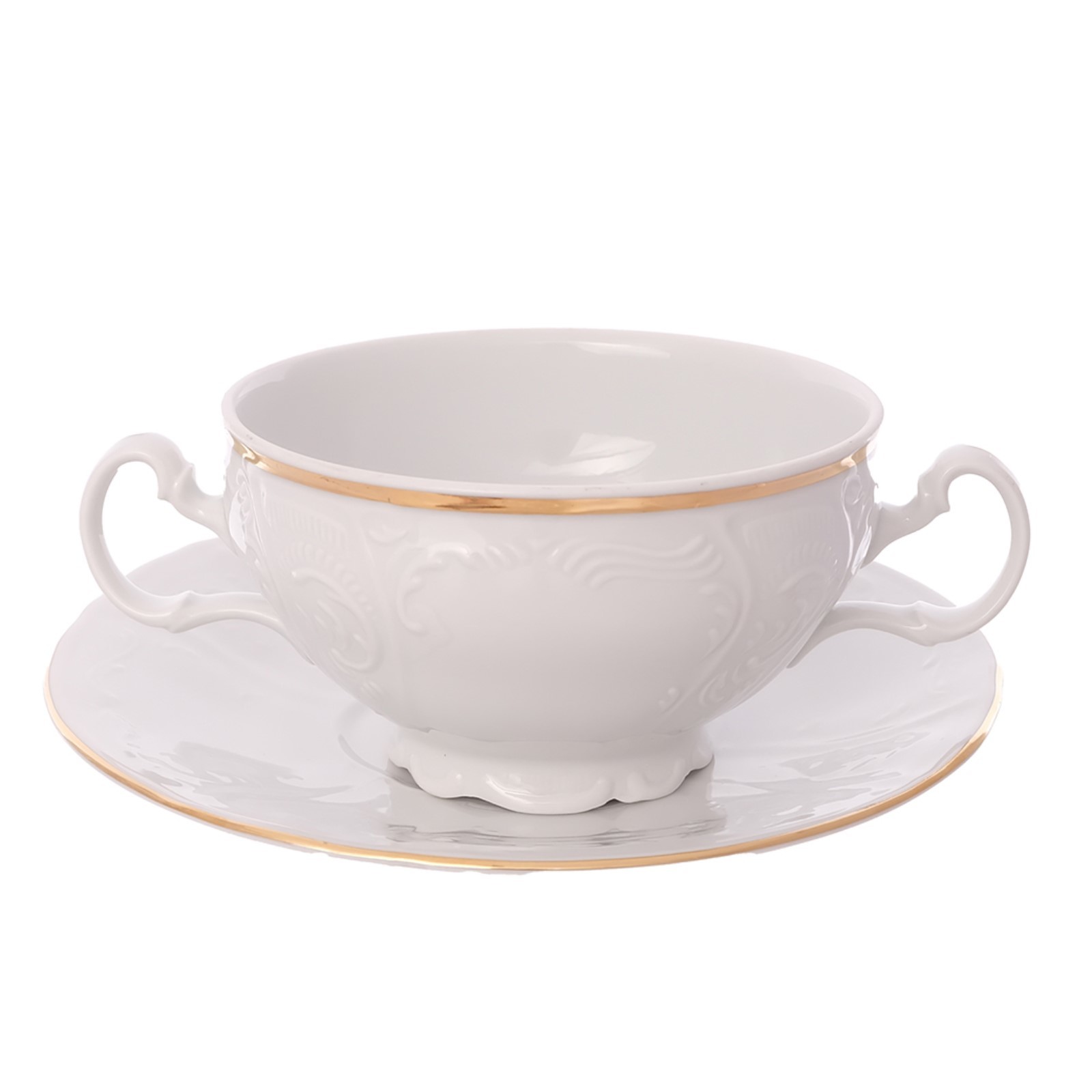 Набор бульонных пар bernadotte «белый узор», фарфор, 360 мл, 6 пар. Цвет: Белый Форма: Круглая В наборе, шт.: 12 Объём, мл: 360 Тематика: Однотонная Материал: Фарфор Можно мыть в посудомоечной машине: Да Можно использовать в СВЧ-печи: Нет Текстура: С рельефом Особенности: С золотой отводкой Матовая поверхность: Нет Серия: Белый узор Серия: Bernadotte Белый узор Форма: Круг, шар, цилиндр  развернуть описание ▼
