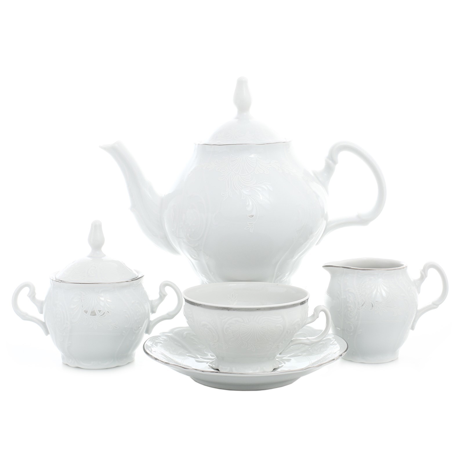 Чайный сервиз bernadotte «платиновый узор», фарфор, 29 предметов. Цвет: Белый Количество персон: 12 В наборе, шт.: 29 Объём, мл: 220 Объём, мл: 250 Объём, мл: 300 Объём, мл: 1200 Тематика: Однотонная Материал: Фарфор Наличие подставки: Нет Можно мыть в посудомоечной машине: Да Можно использовать в СВЧ-печи: Нет Текстура: С рельефом Тип: Чайный сервиз Особенности: С серебряной отводкой Матовая поверхность: Нет Серия: Платиновый узор Серия: Bernadotte Платиновый узор  развернуть описание ▼