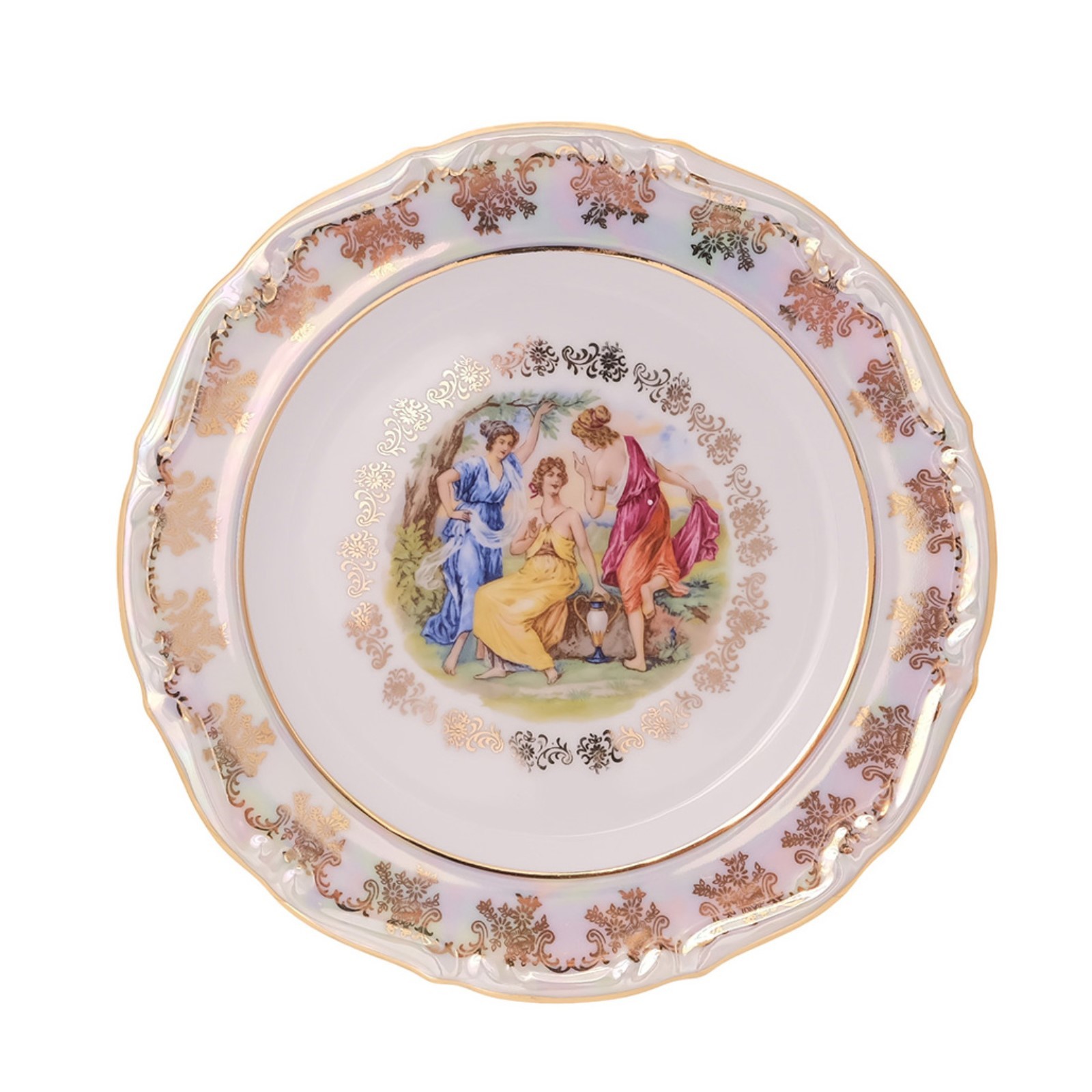 Набор тарелок repast maria teresa «мадонна перламутр», фарфор, d=27 см, 6 шт. Цвет: Белый Диаметр, см: 27 В наборе, шт.: 6 Тематика: Узоры Тематика: Люди Материал: Фарфор Вид тарелки: Плоская Можно мыть в посудомоечной машине: Нет Можно использовать в СВЧ-печи: Нет Текстура: Гладкая Особенности: Деколь Особенности: С золотой отводкой Особенности: Перламутровые Матовая поверхность: Нет Для горячего: Да Серия: Maria Teresa. Мадонна перламутр Серия: Repast Мадонна перламутр Мария-тереза Форма: Круг, шар, цилиндр  развернуть описание ▼
