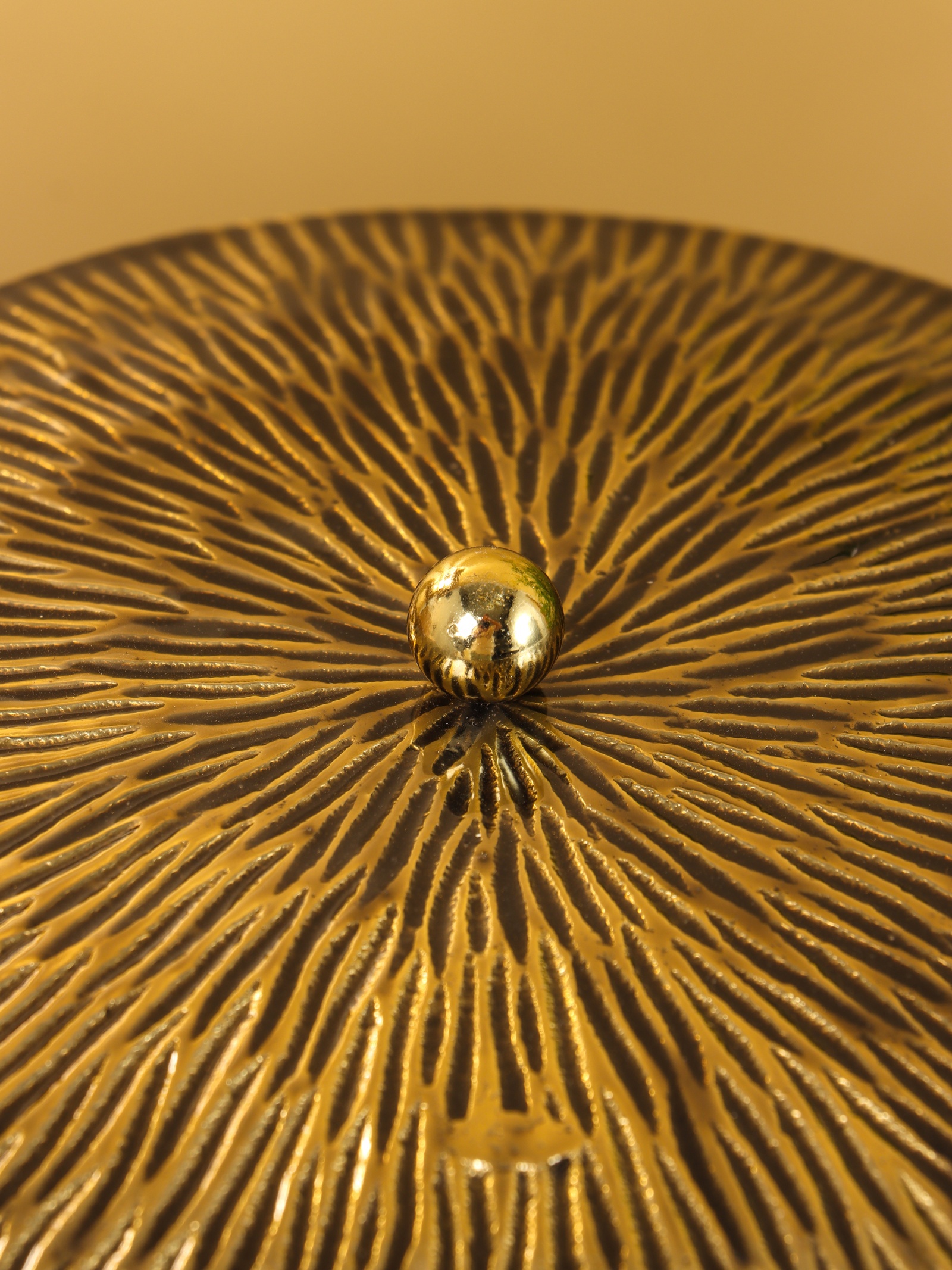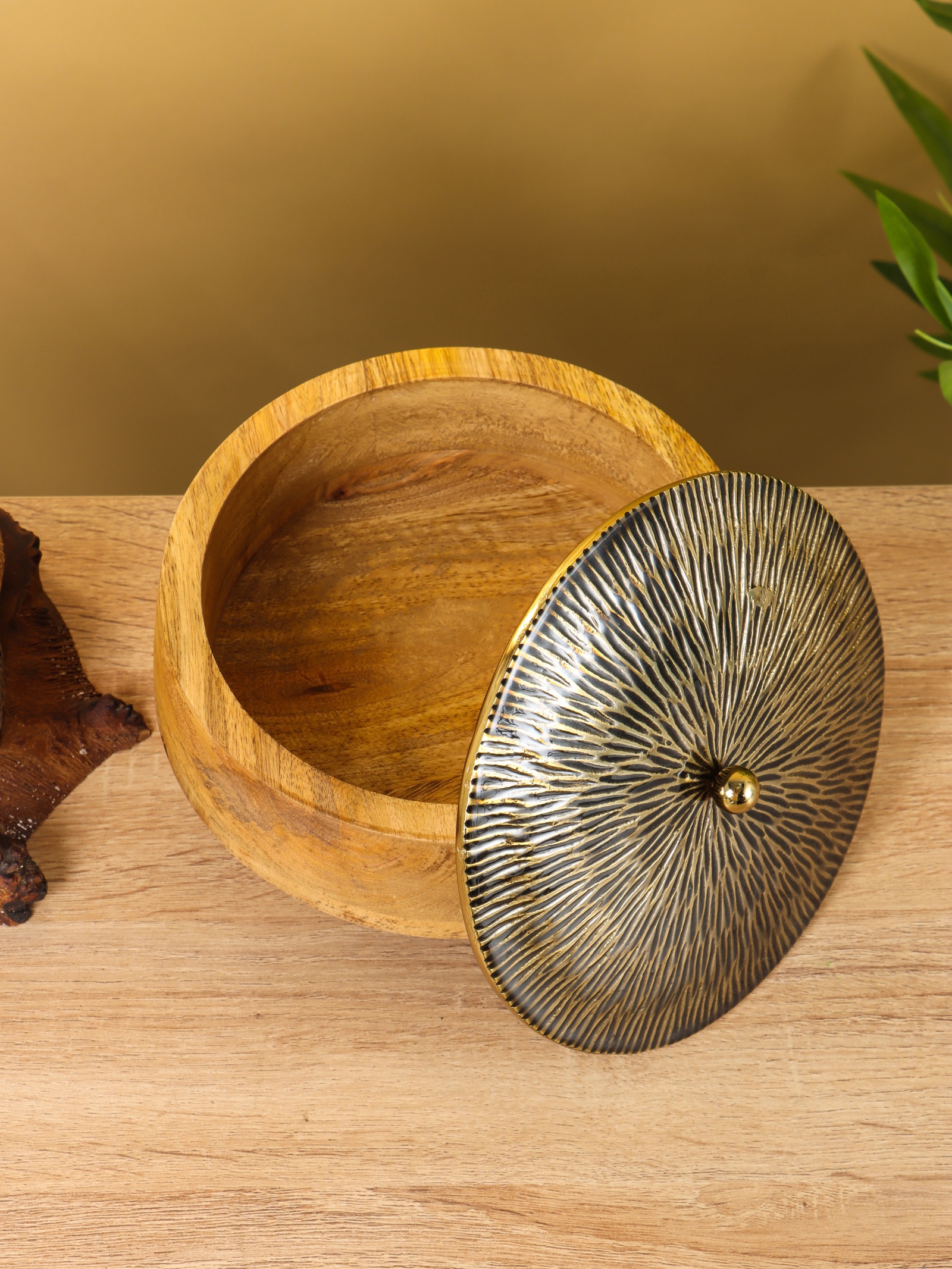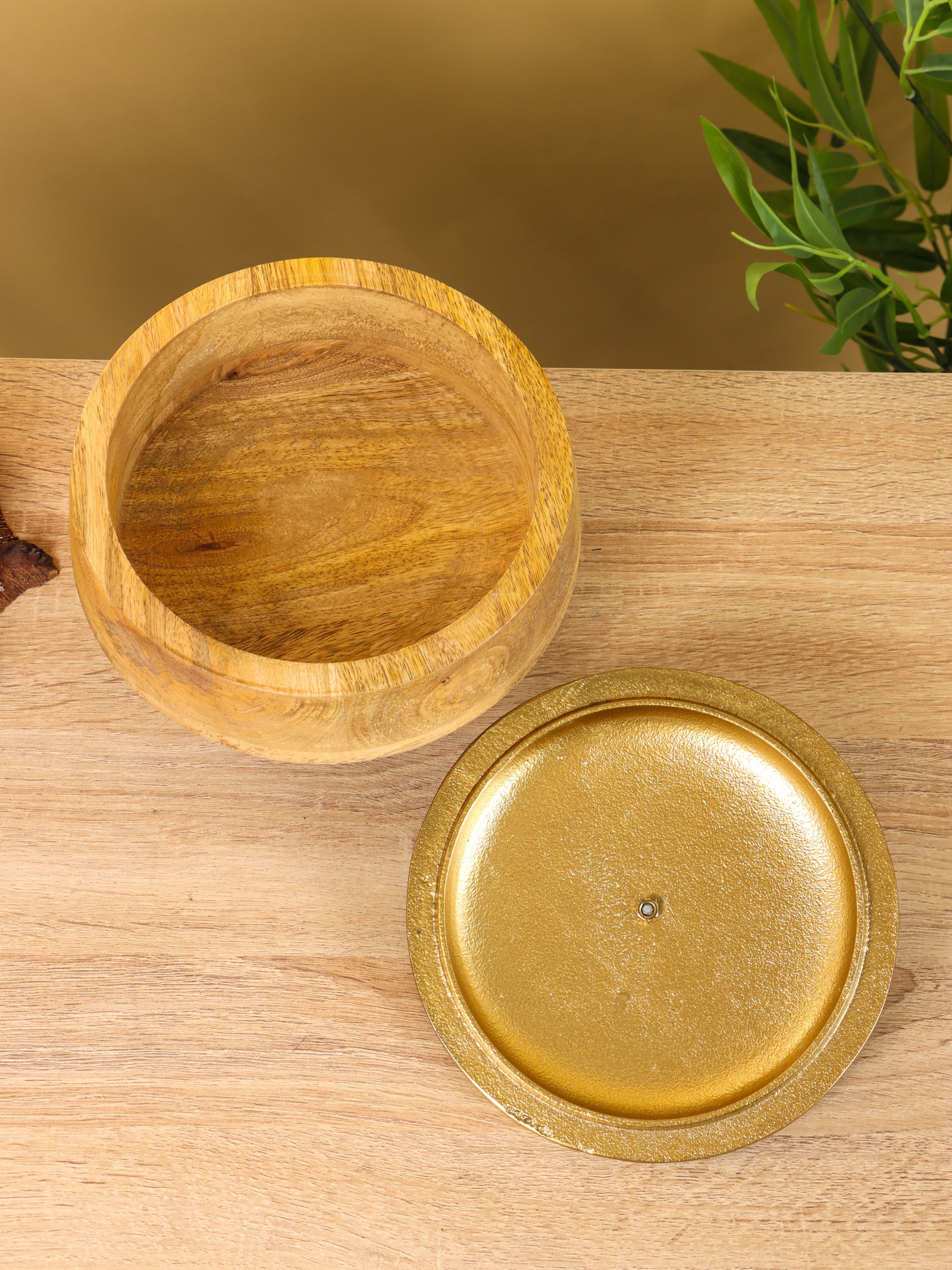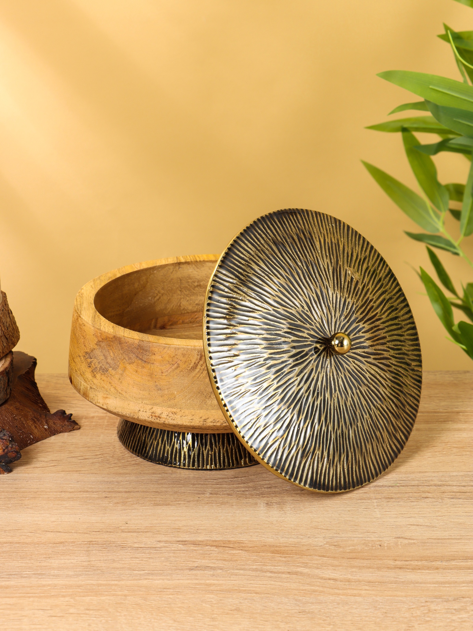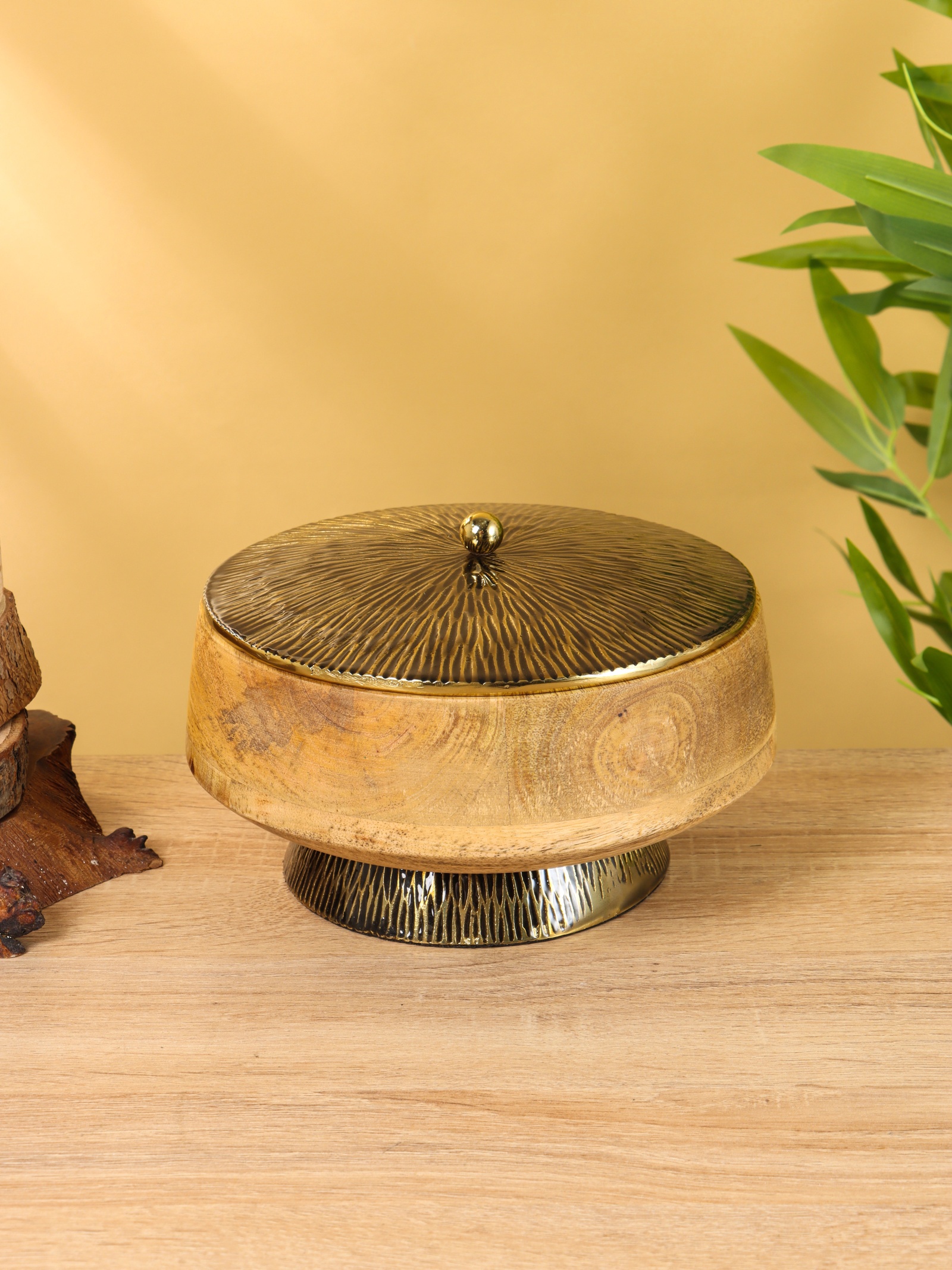 Конфетница с крышкой "щербет" алюминиевая с манговым деревом 19х19х12 см. Цвет: Золотистый Цвет: Бежевый Диаметр, см: 19 Объём, мл: 1300 Тематика: Дерево Крышка: Да Вид дерева: Манго Материал: Дерево Можно мыть в посудомоечной машине: Нет Можно использовать в СВЧ-печи: Нет Текстура: С рельефом Особенности: Без особенностей Для горячего: Нет Вид: Конфетница Форма: Круг  развернуть описание ▼
