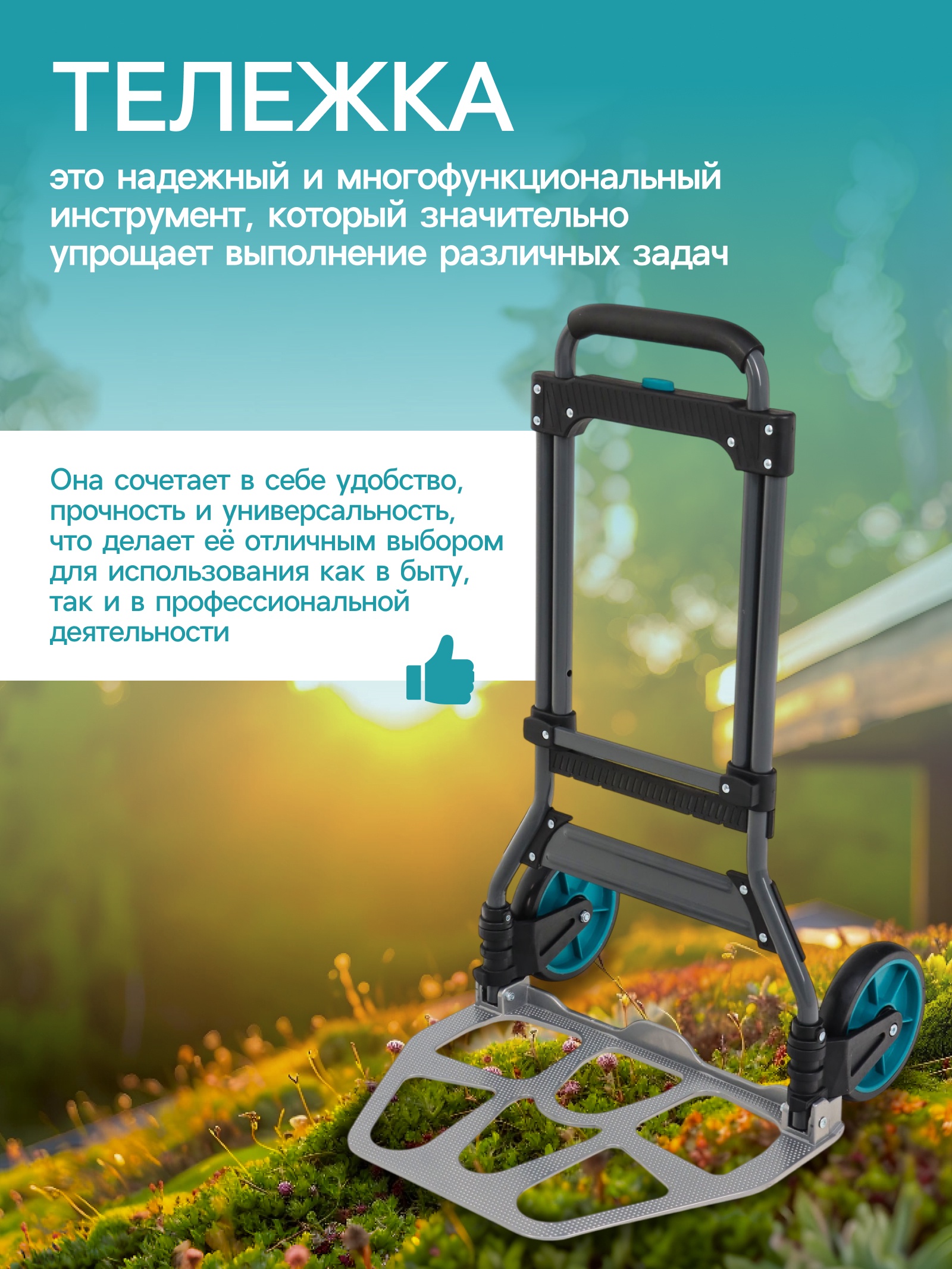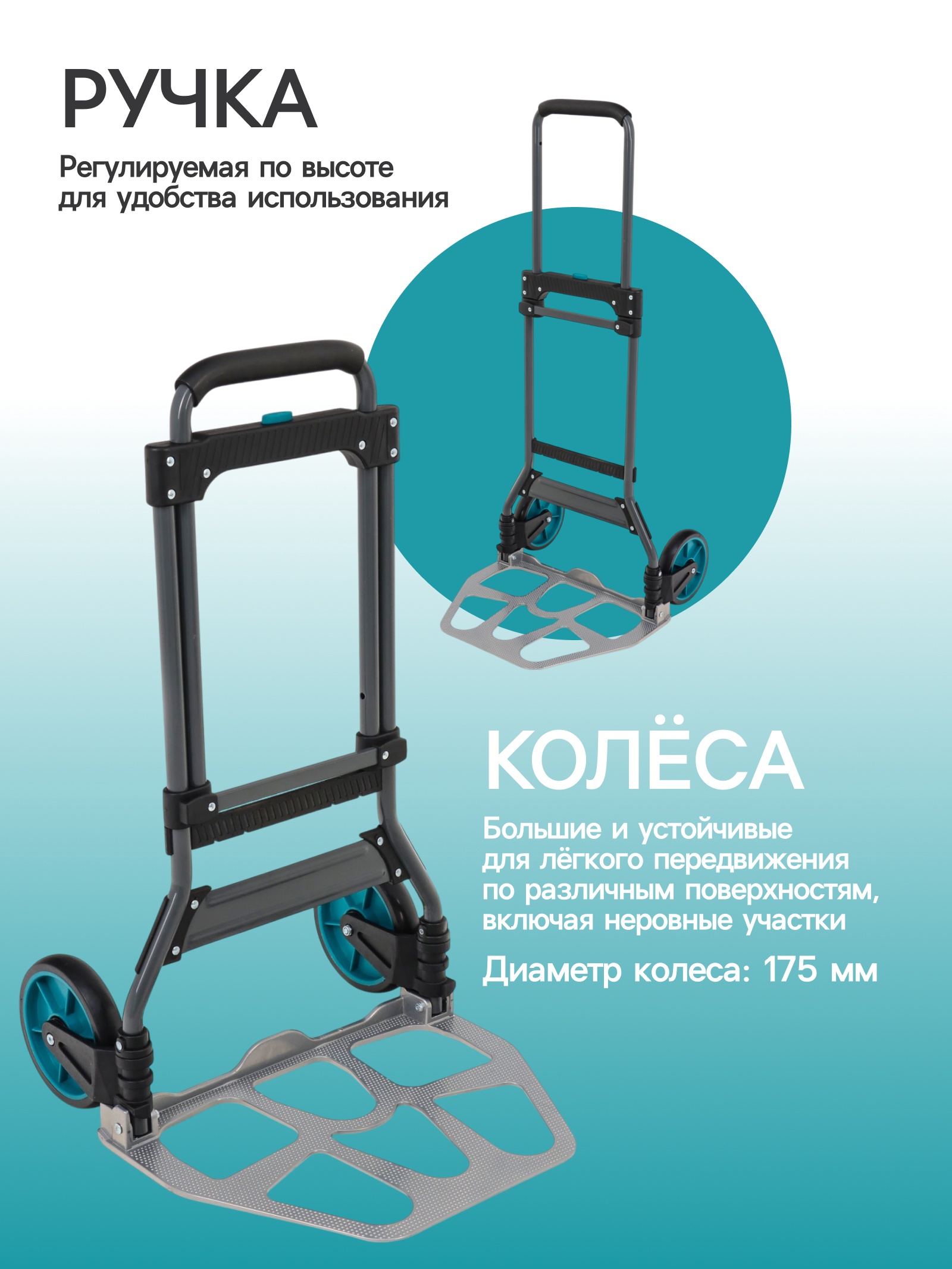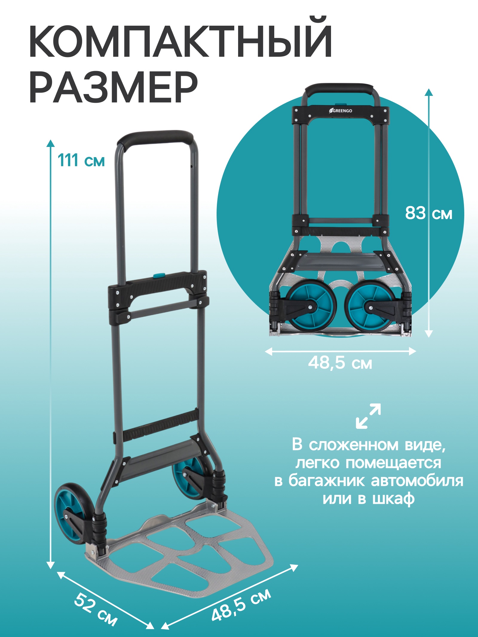 Тележка ручная хозяйственная, двухколёсная, нагрузка до 100 кг, складная, грузовая, greengo. Материал каркаса: стальная труба Материал подножки: алюминий Максимальный размер: 52 х 48,5 х 111 см Размер в сложенном виде: 6 х 48,5 х 83 см Размер подножки: 35 х 48,5 см Материал колёс: 175 мм Грузоподъёмность: 100 кг Можно перевозить: — Коробки — Мешки — Бытовую технику — Строительные материалы Преимущества: — Лёгкая тележка, облегчённая, но при этом прочная конструкция — Телескопическая ручка, можно подстроить под ваш рост или размер груза — Противоскользящая накладка на ручке, для комфортного использования тележки — Складная тележки, компактное хранение в гараже, кладовке, сарае Эта тележка идеально подходит для использования в быту и на стройке благодаря своей прочности, манёвренности и возможности адаптации под разные задачи. Цвет:Серый|Maксимальная нагрузка, кг:100|Материал:Пластик|Материал:Металл|Вид ручки:Телескопическая|Страна:Китай  развернуть описание ▼