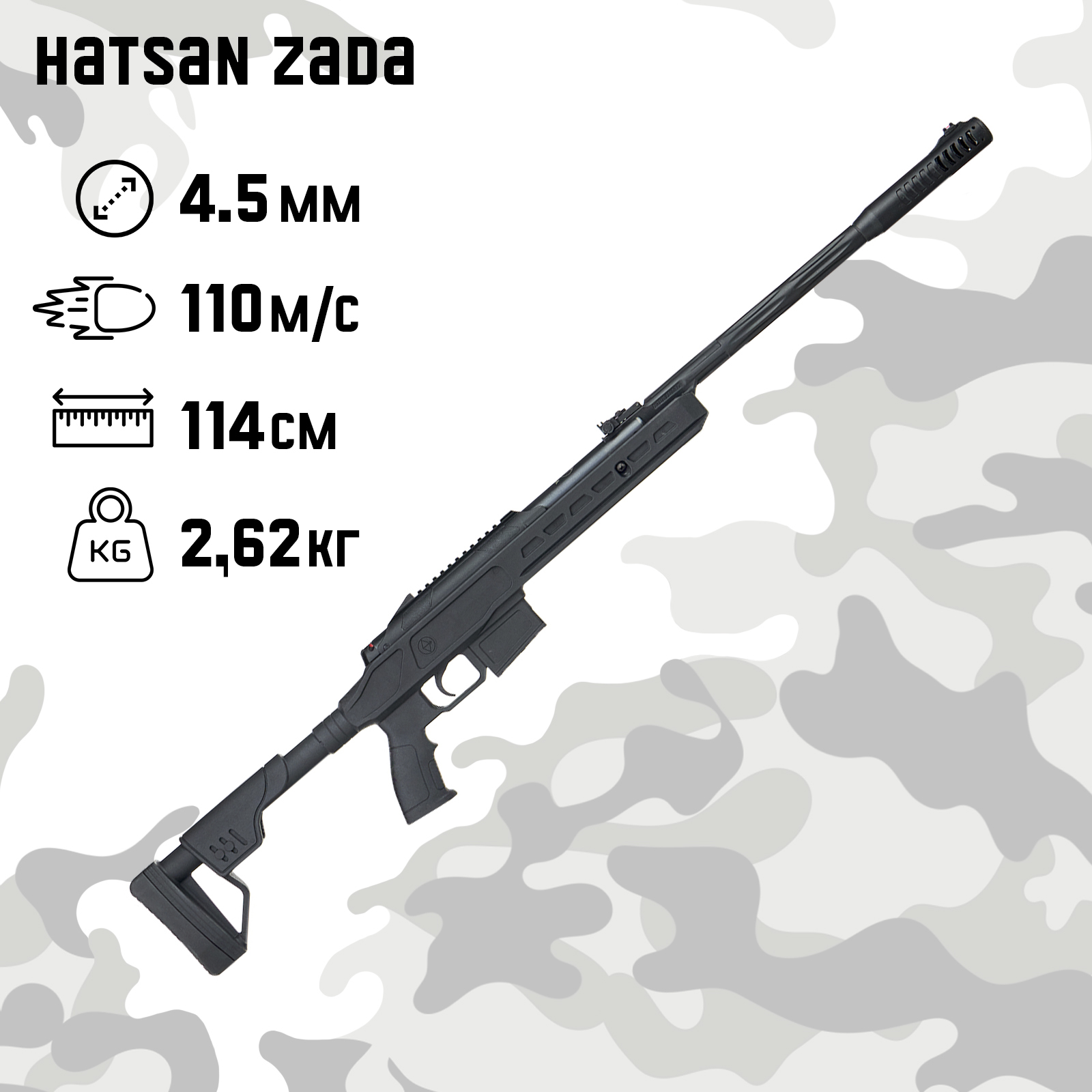 Винтовка пневматическая "hatsan zada" кал. 4.5 мм, 3 дж, ложе - пласт., до 110 м/с. Вместимость магазина: 1 Скорость полёта пули, м/с: 110 Вид снаряда: Пули Калибр: 4.5 мм Температурное ограничение: Нет Тип работы: Пружинно-поршневой Режим стрельбы: Одиночный Источник энергии: Пружина, взведение «переламыванием» ствола Боевой прототип: Нет прототипа Крепление для оптического прицела: Да Тип крепления прицела: Планка Вивера/Пикатини Тип крепления прицела: Ласточкин хвост Подствольная планка: Нет  развернуть описание ▼